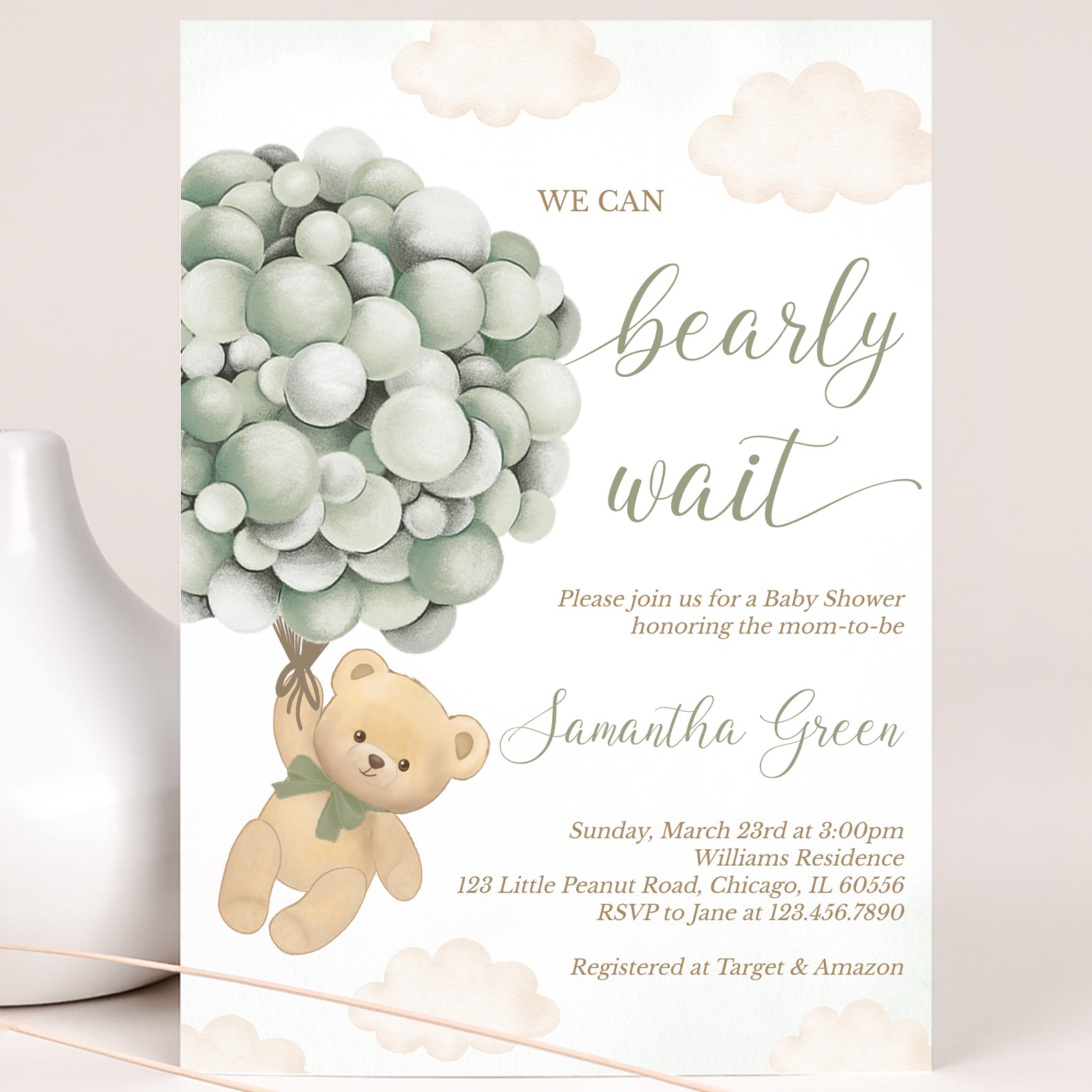 - Purchase this We Can Bearly Wait Baby Shower Green Invite: Teddy & Balloons template