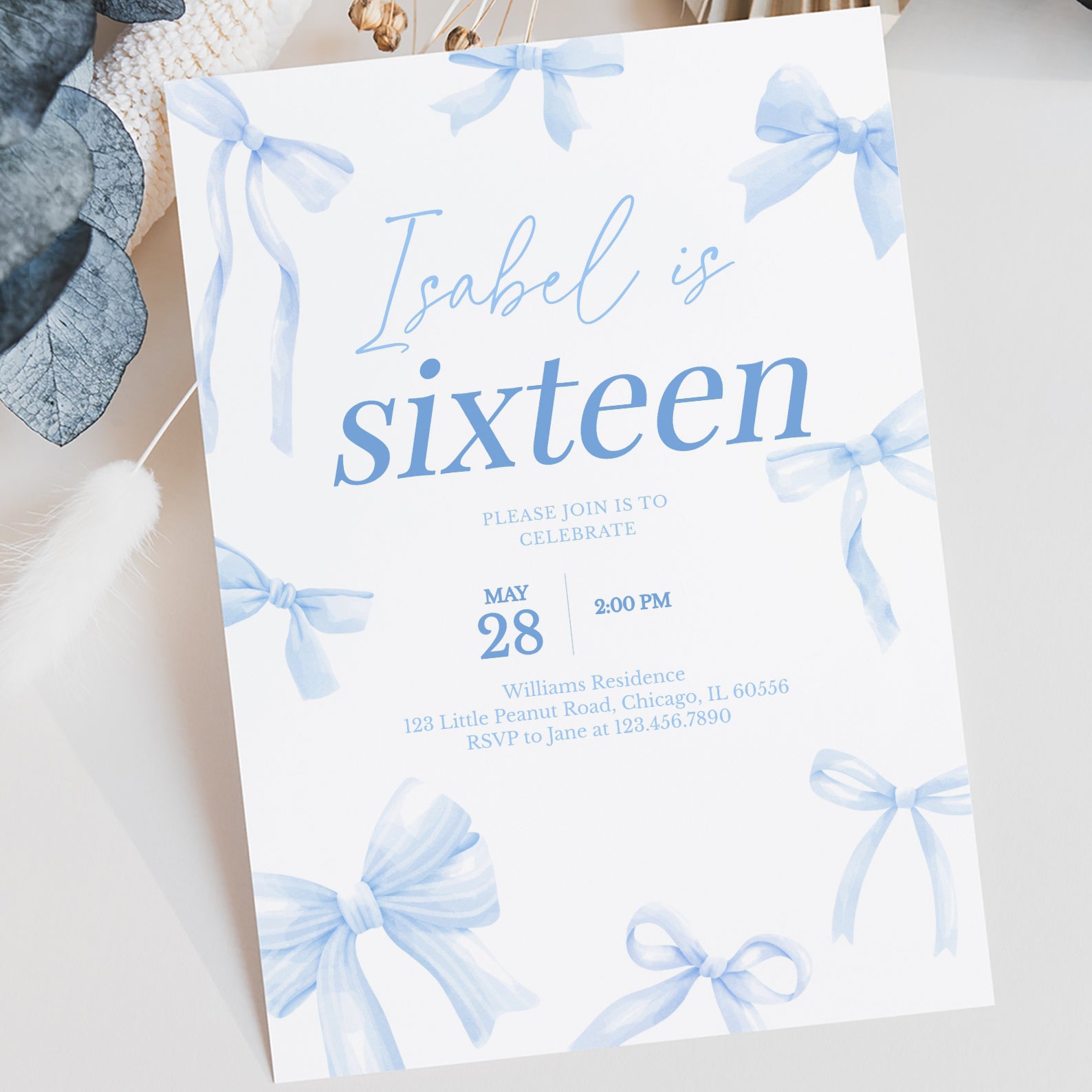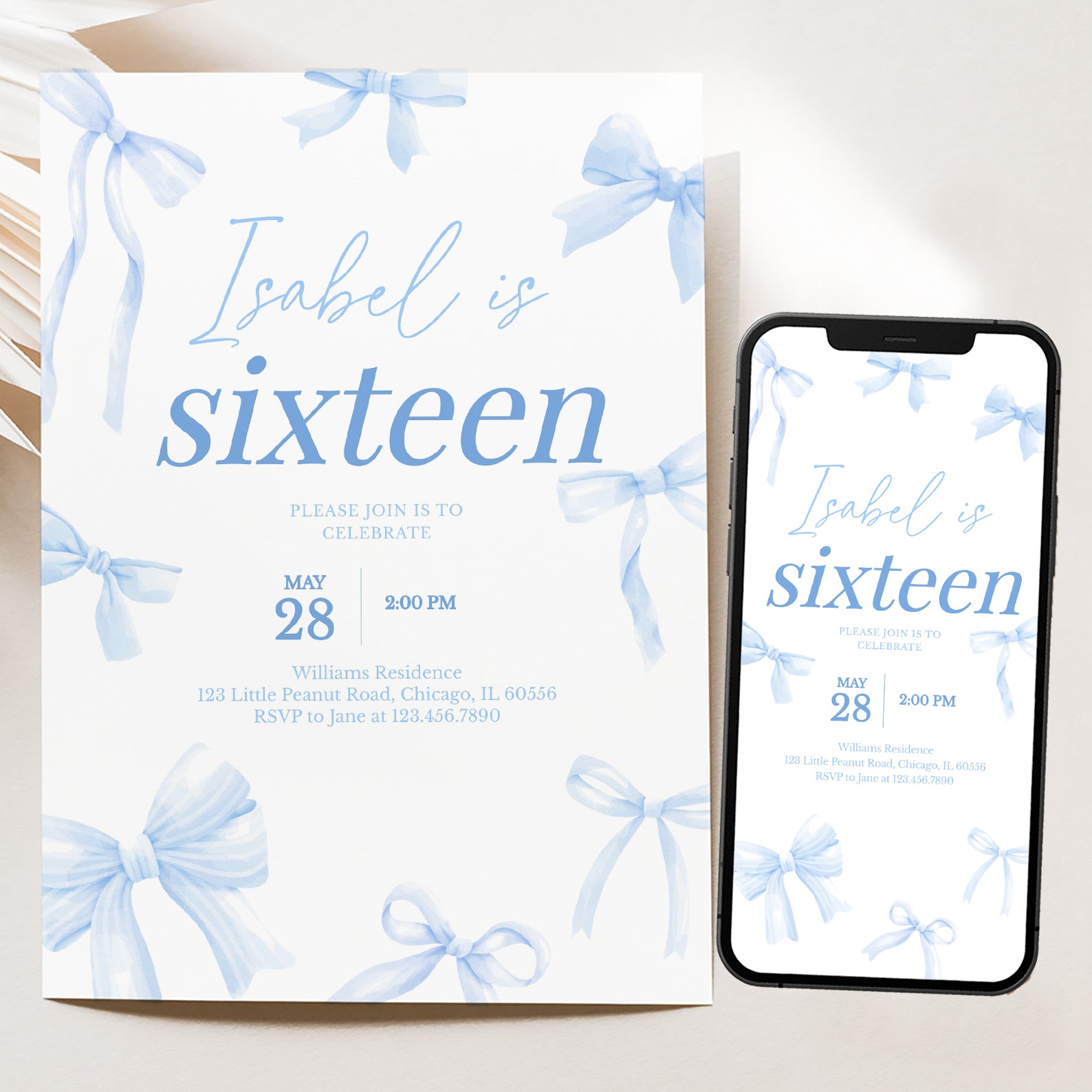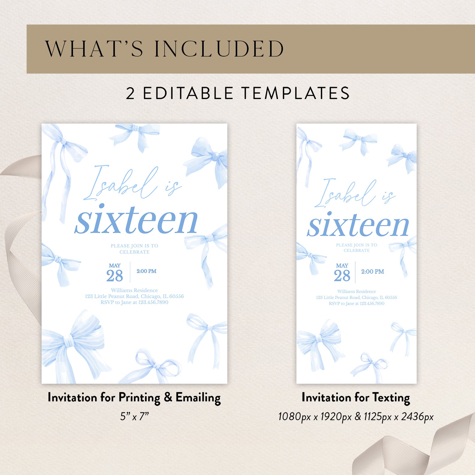 - Purchase this 16th Birthday Digital Invitation: Elegant Blue Ribbon Design template