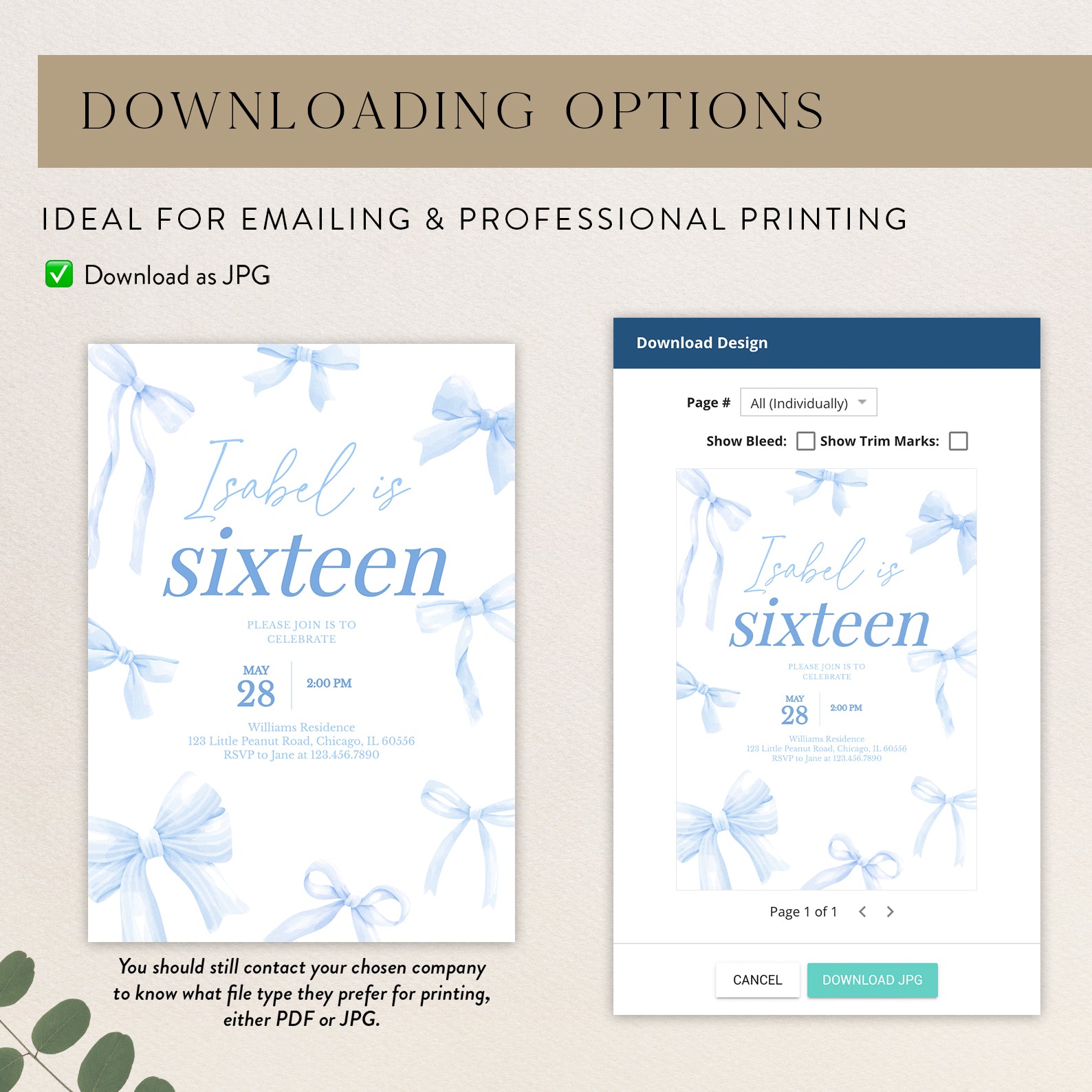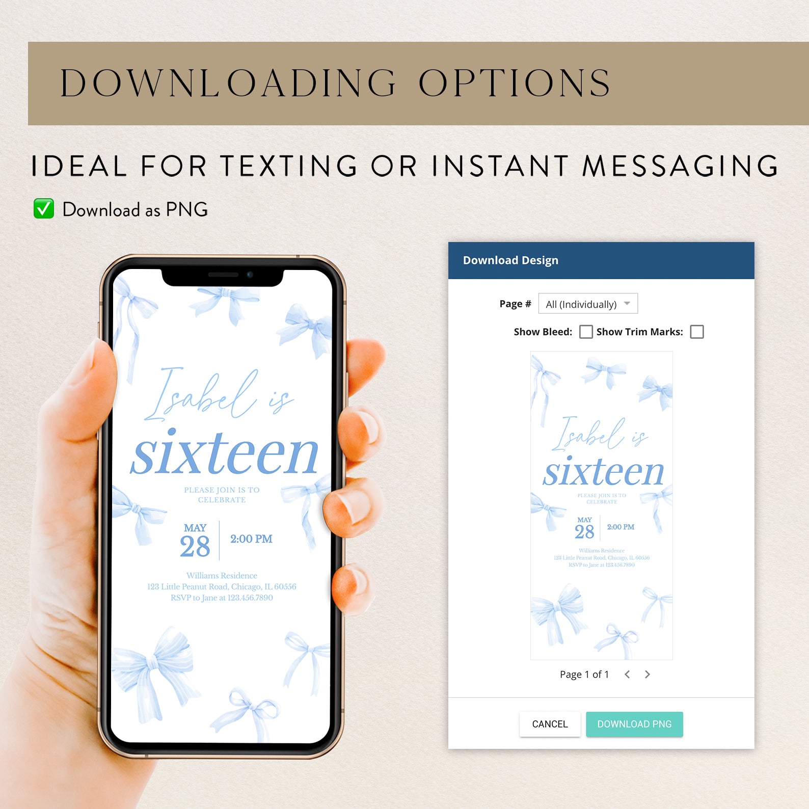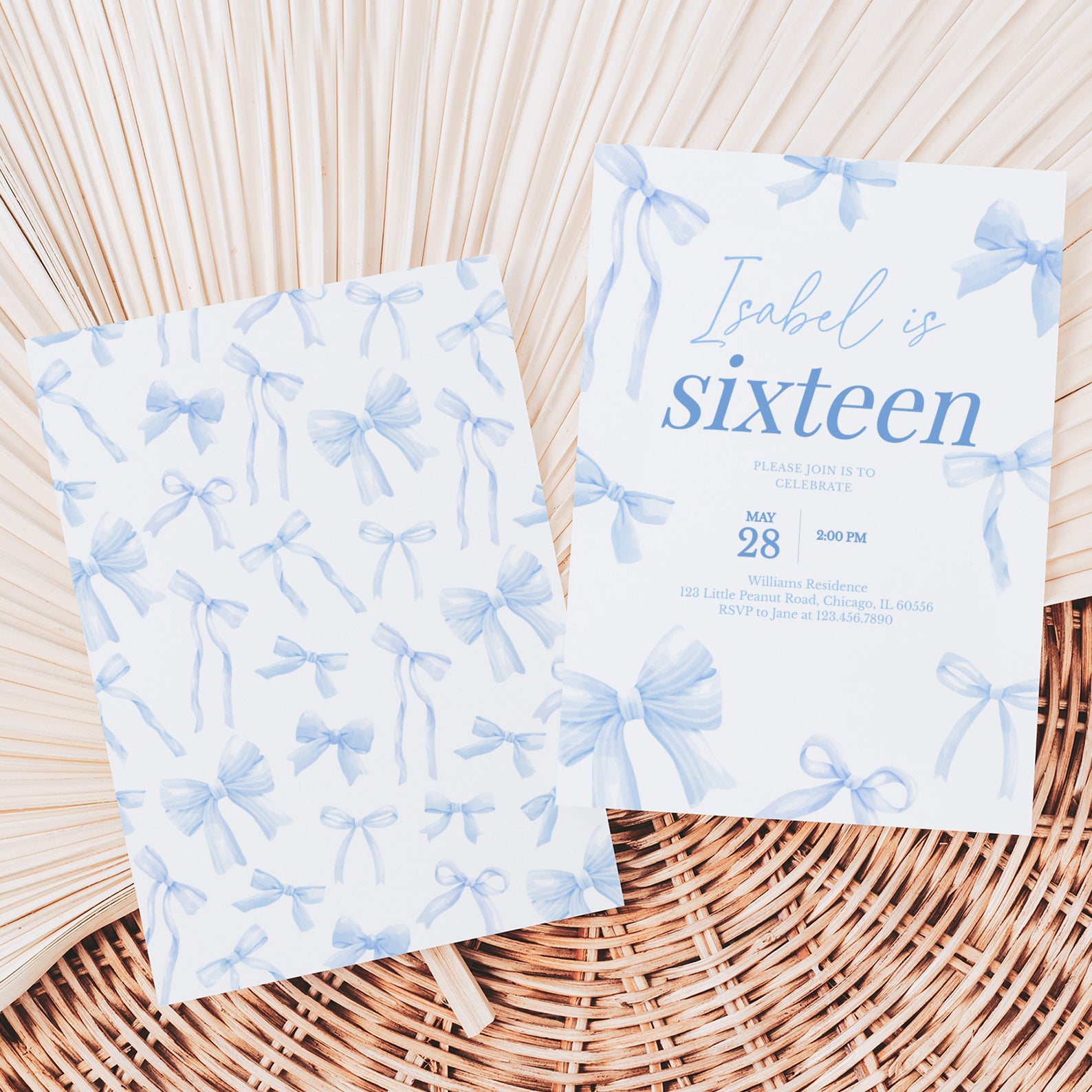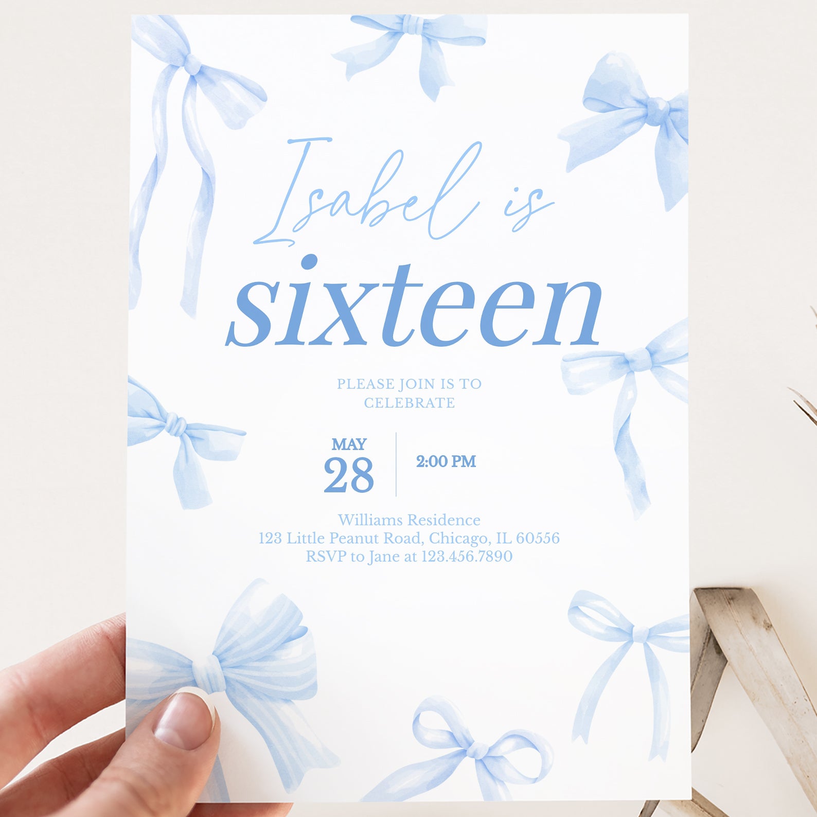 - Purchase this 16th Birthday Digital Invitation: Elegant Blue Ribbon Design template