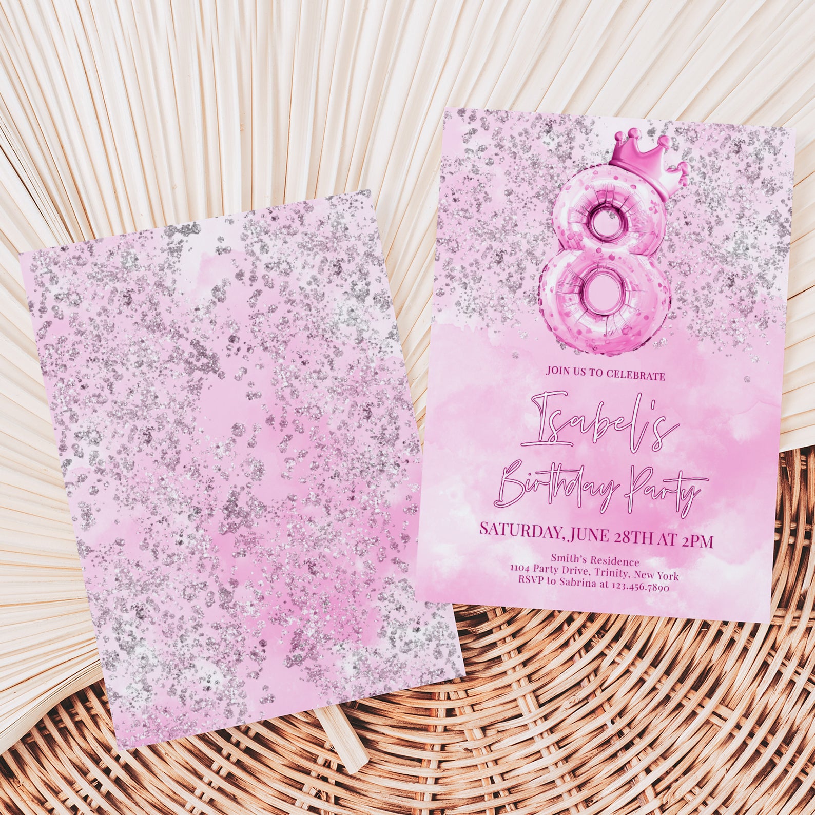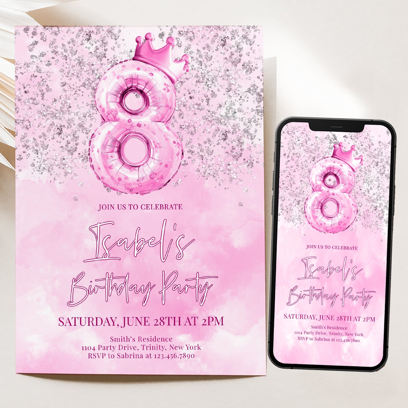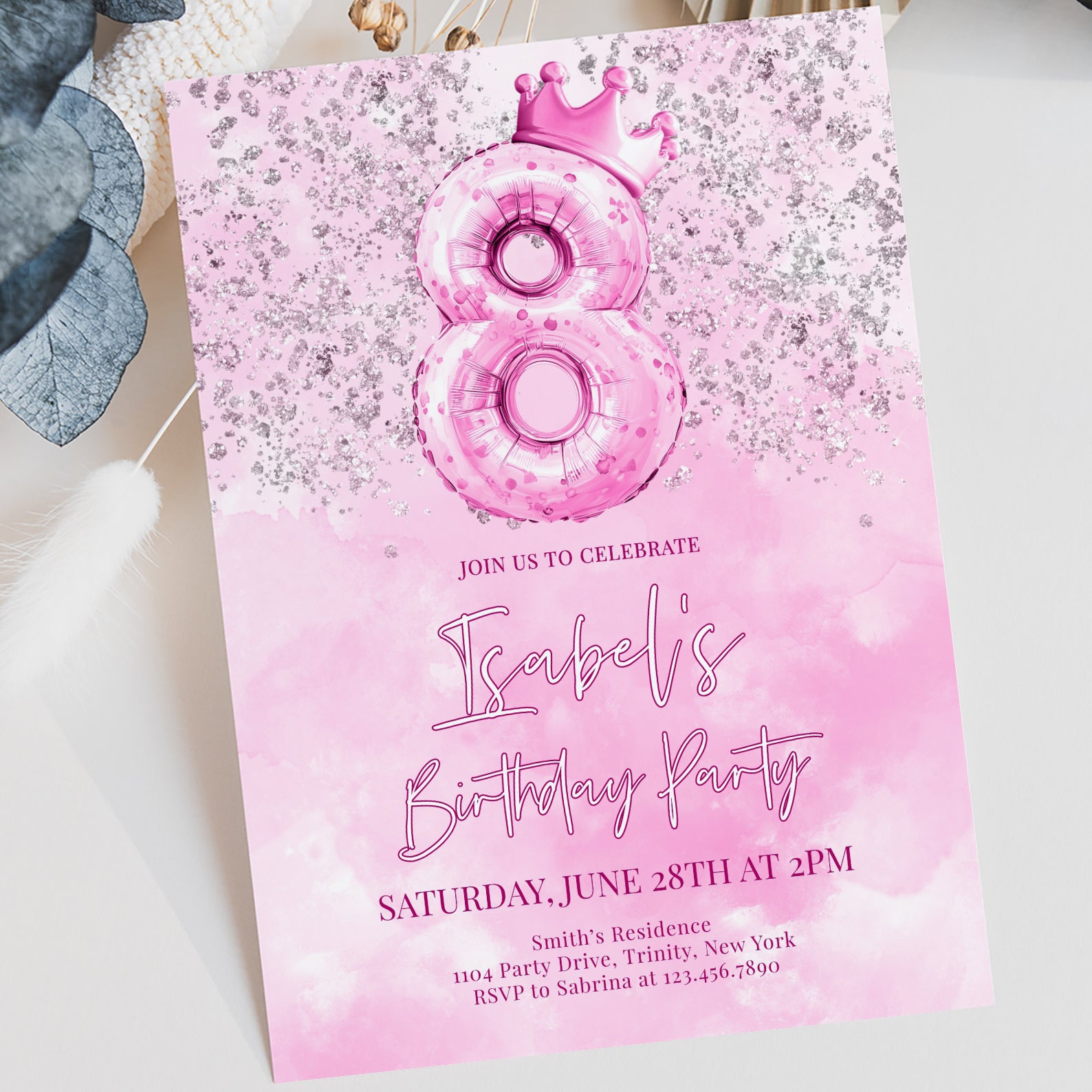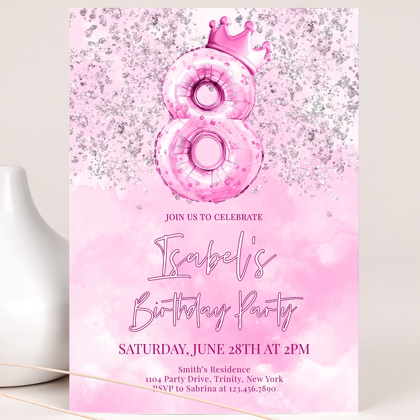 Celebrate your little princess's 8th birthday in style with our enchanting digital invitation! Featuring a stunning metallic number eight balloon topped with a charming pink crown, this invitation is beautifully adorned with silver accents against a soft pink watercolor background. Perfectly designed to set the tone for a magical celebration, it’s easy to share with friends and family, ensuring everyone is ready to join in the fun. Make her special day unforgettable with this delightful invitation that captures the essence of joy and celebration!