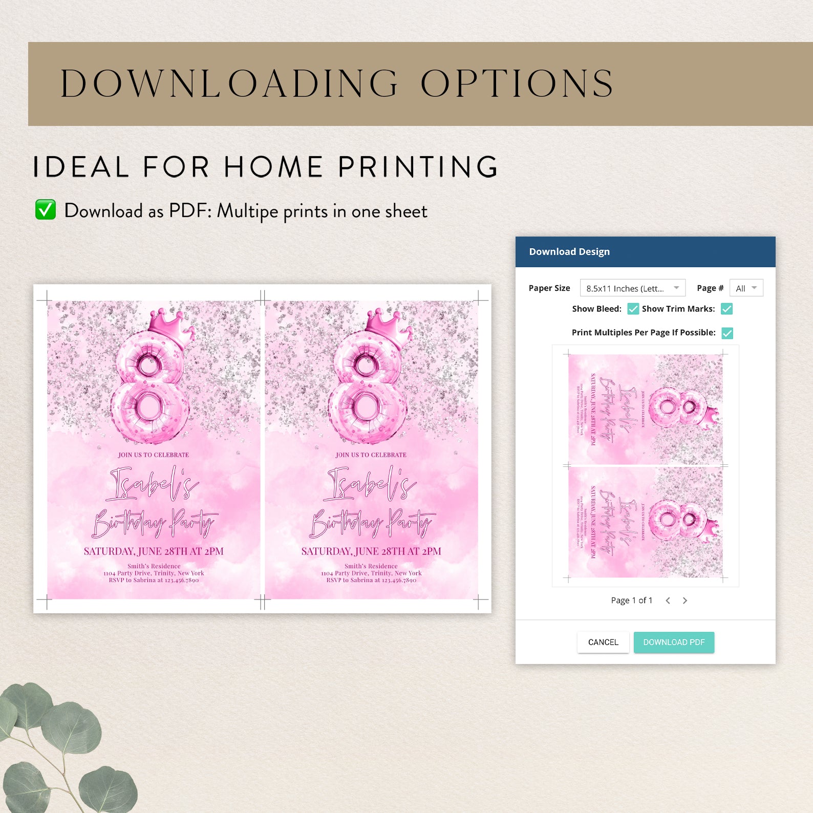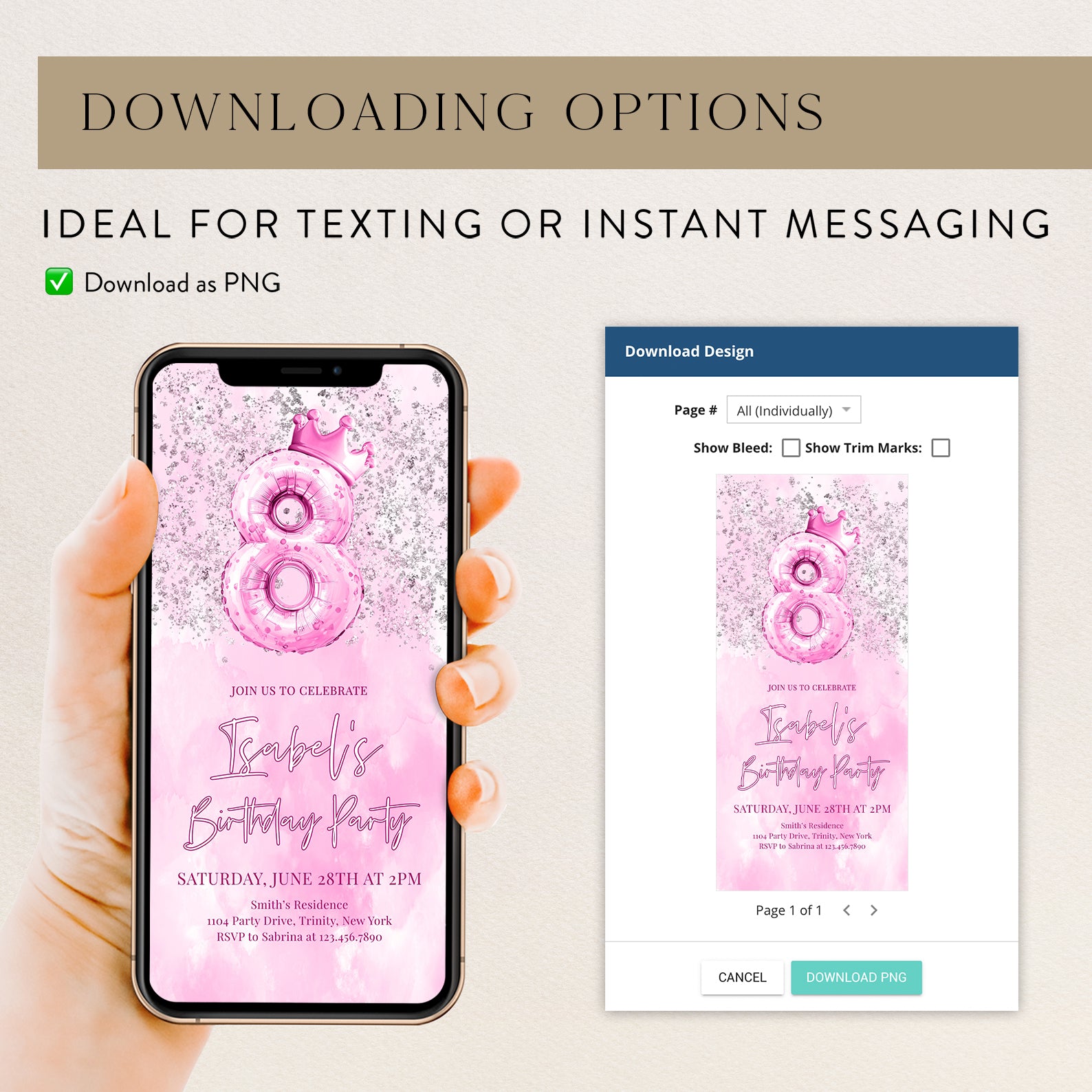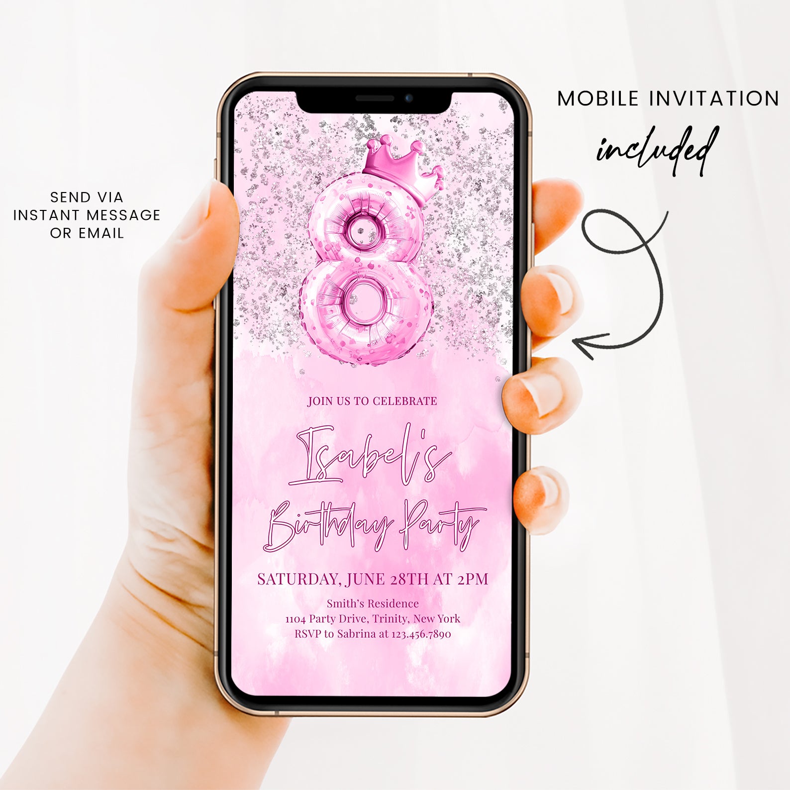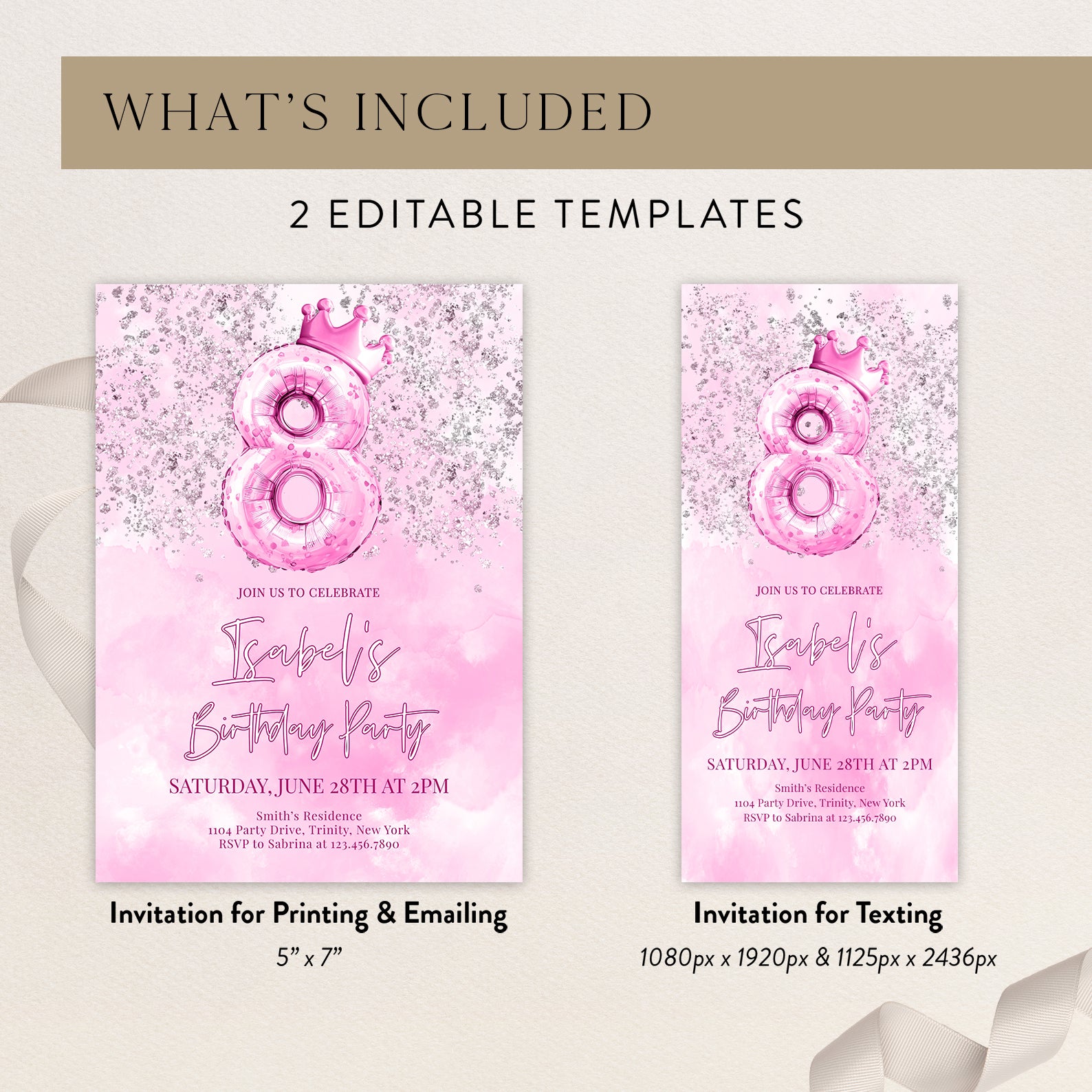 Celebrate your little princess's 8th birthday in style with our enchanting digital invitation! Featuring a stunning metallic number eight balloon topped with a charming pink crown, this invitation is beautifully adorned with silver accents against a soft pink watercolor background. Perfectly designed to set the tone for a magical celebration, it’s easy to share with friends and family, ensuring everyone is ready to join in the fun. Make her special day unforgettable with this delightful invitation that captures the essence of joy and celebration!
