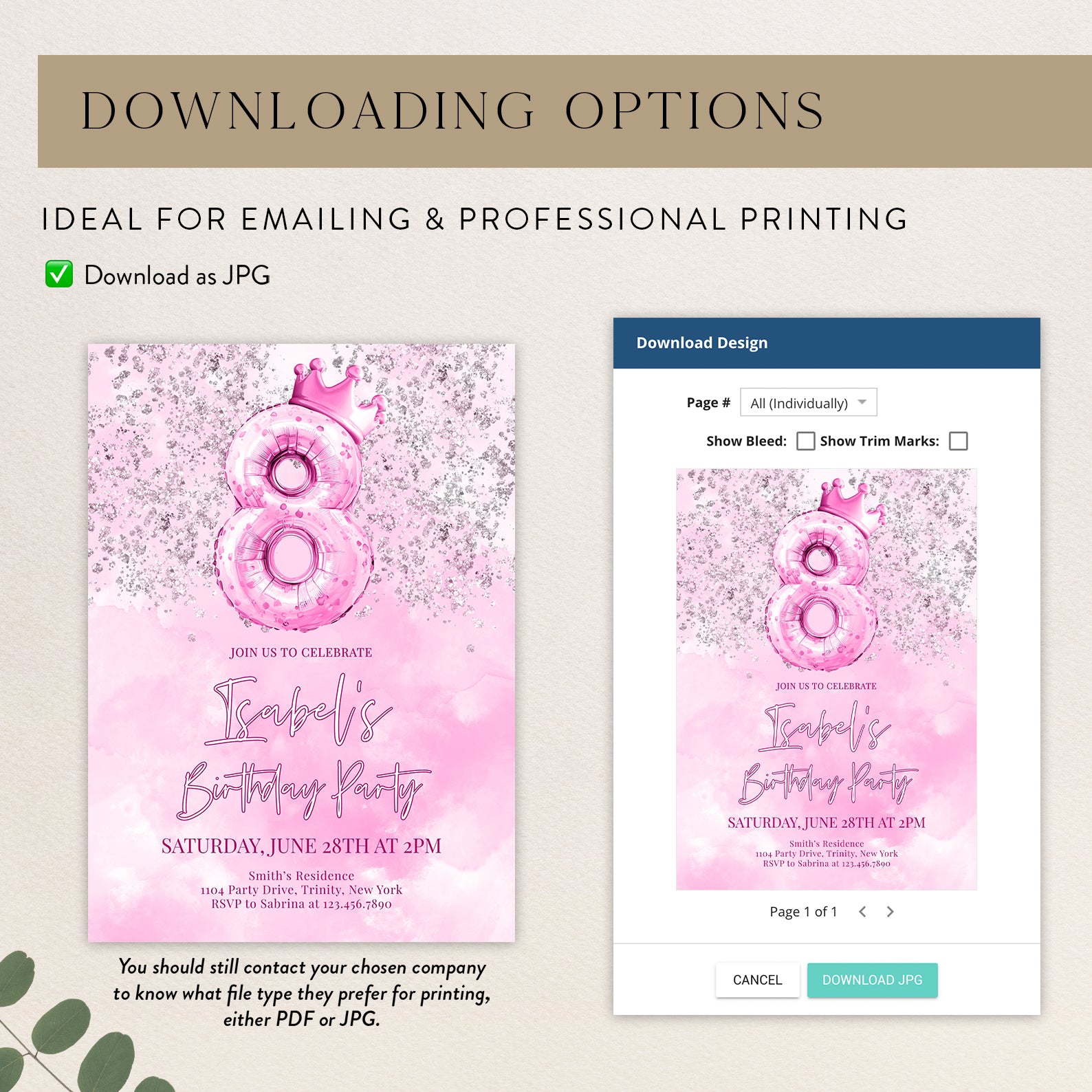 - Purchase this 8th Birthday Invitation Pink Metallic Balloon & Crown Design template