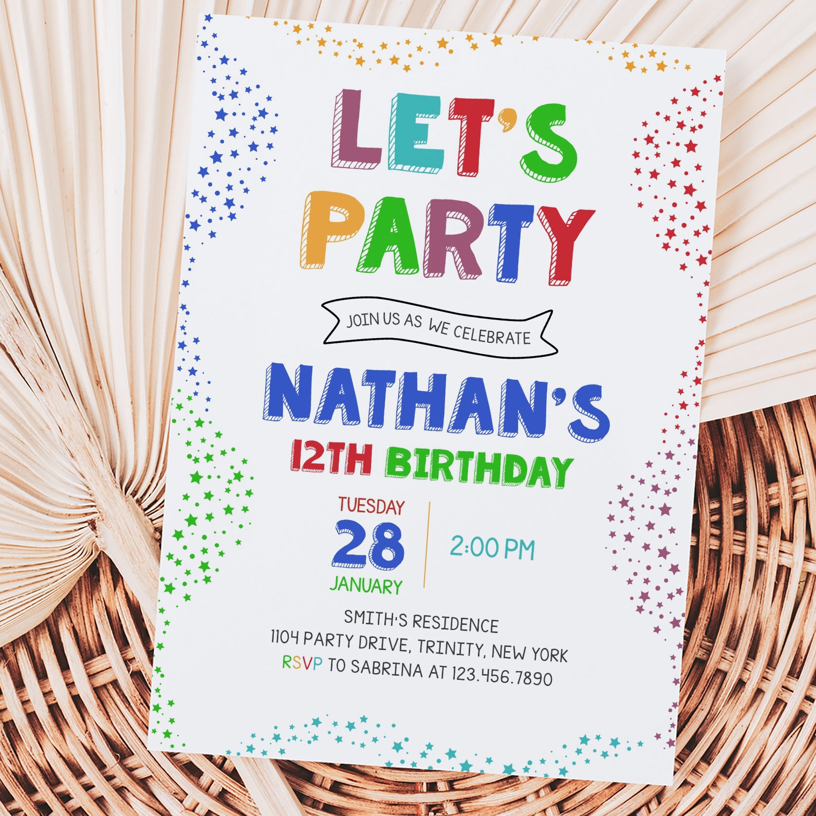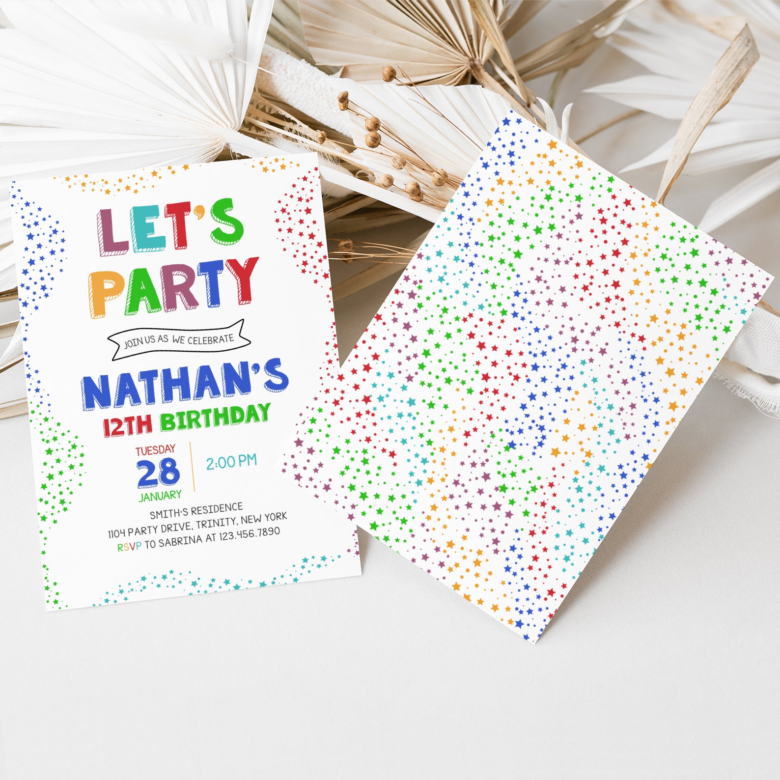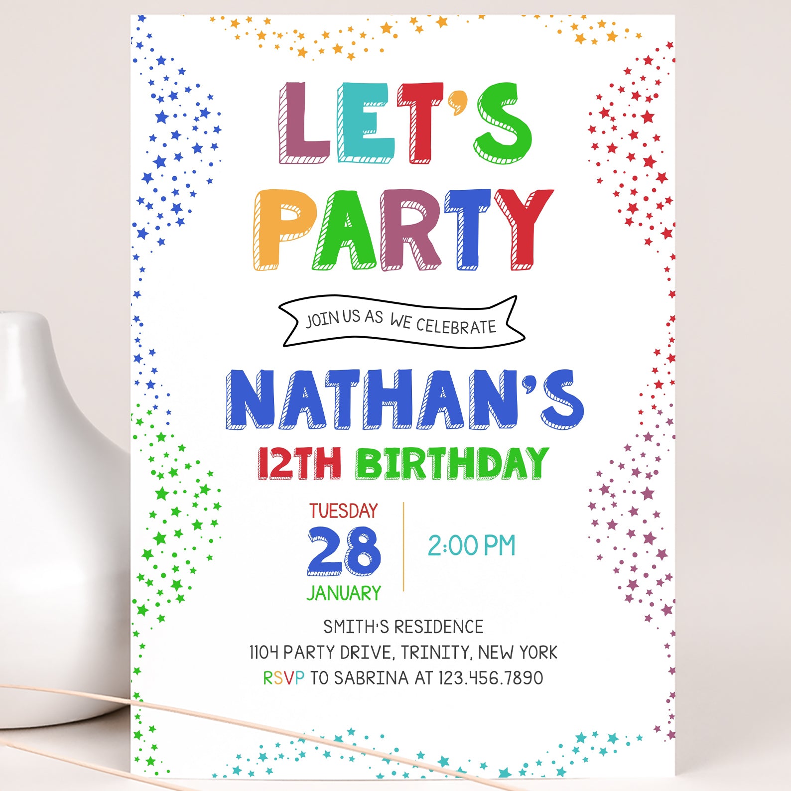 - Purchase this Colorful 12th Birthday Invite: Let's Party with Stars template