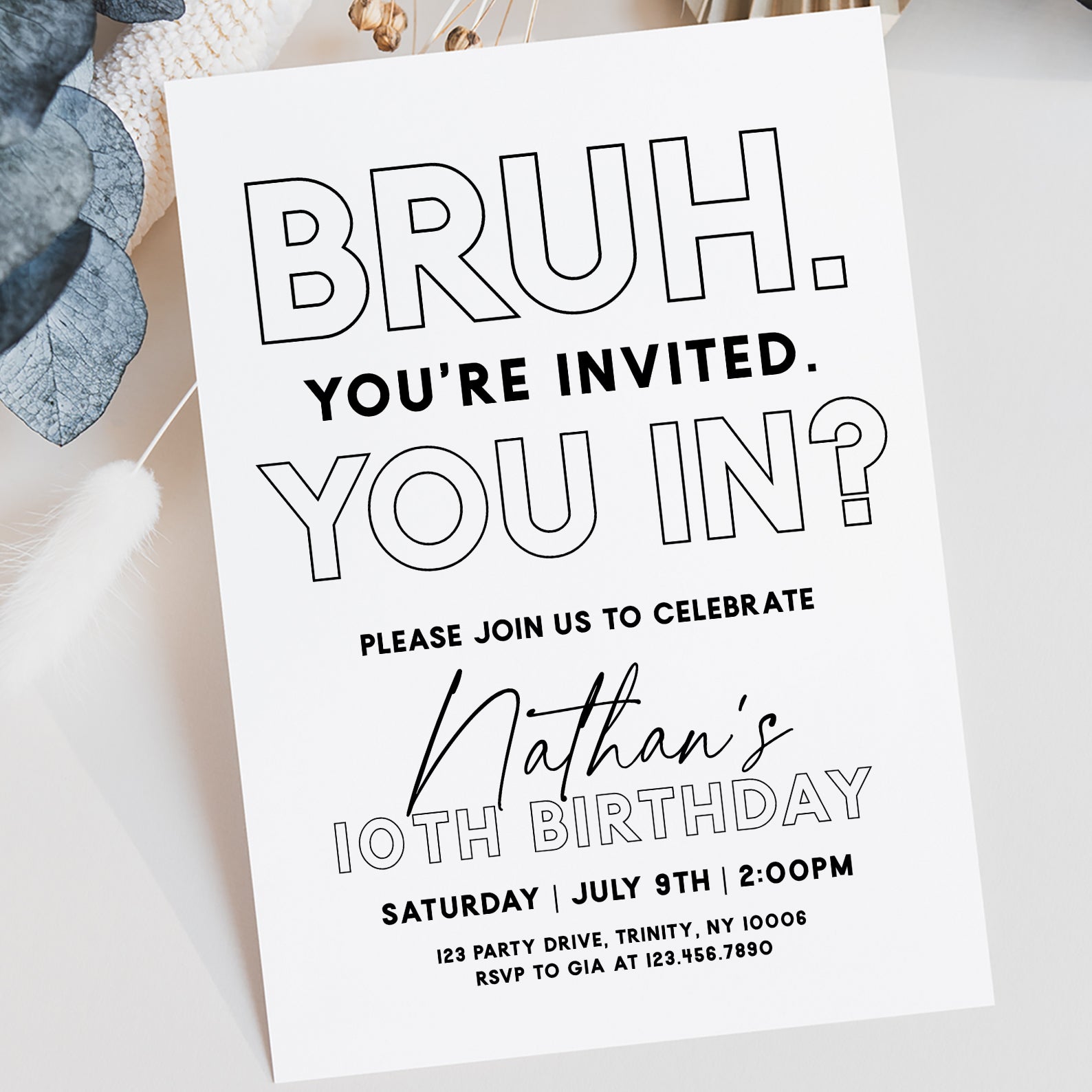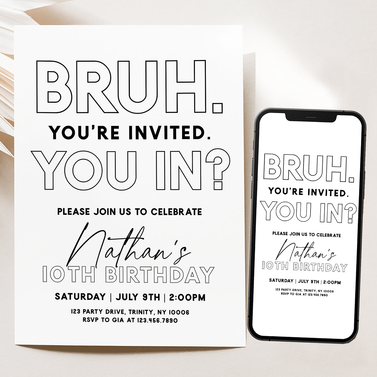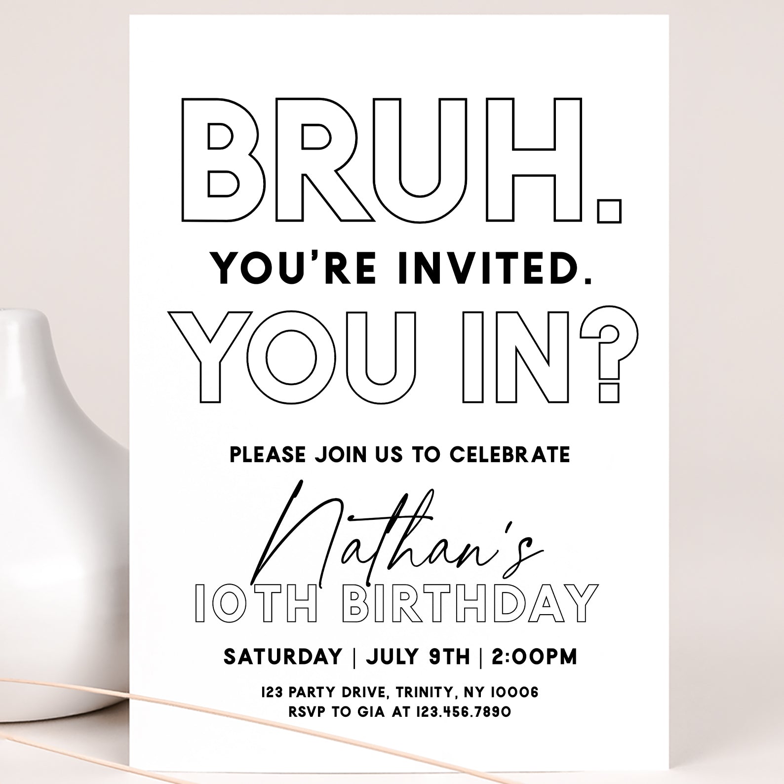 - Purchase this Minimalist 'Bruh You're Invited' 10th Birthday Digital Invite template