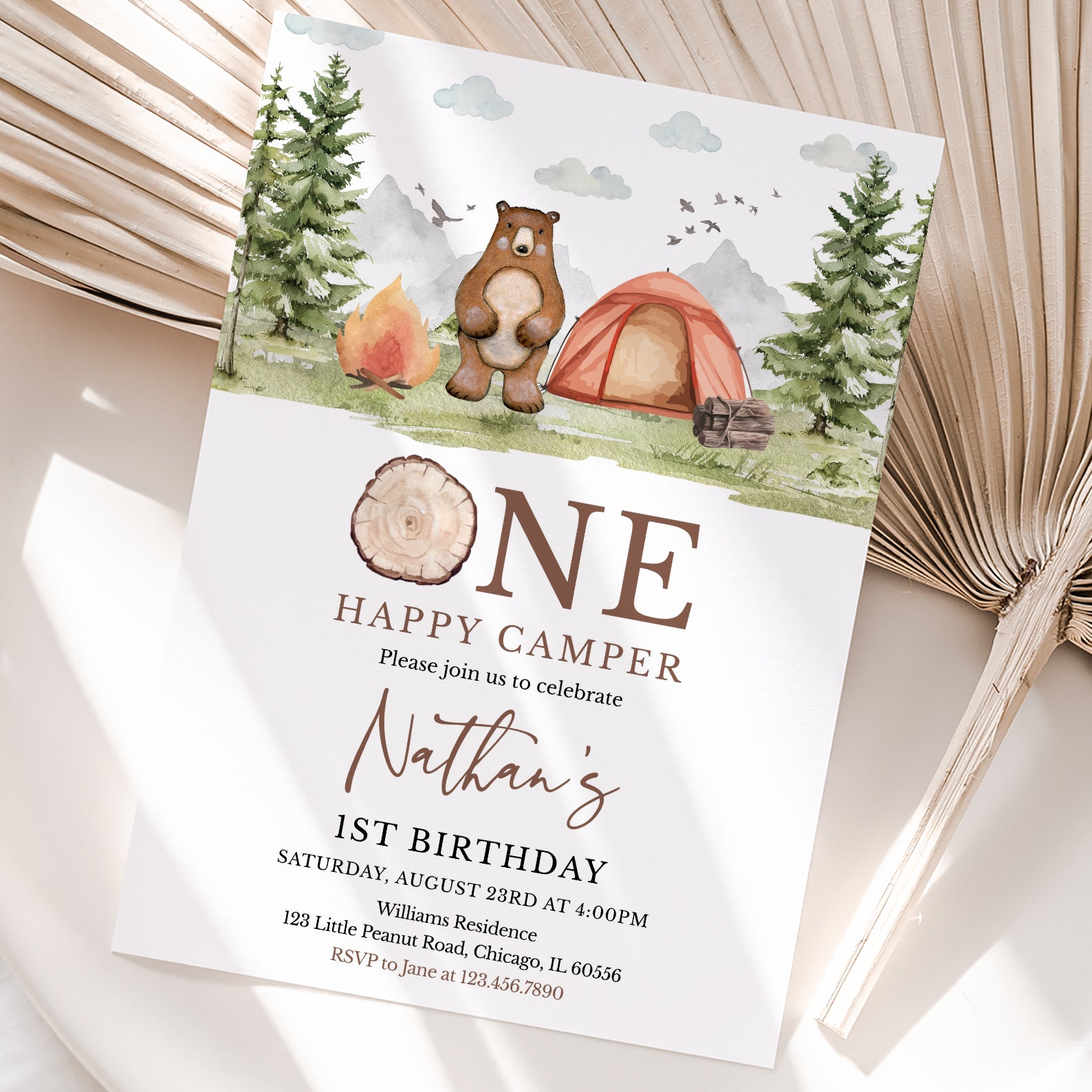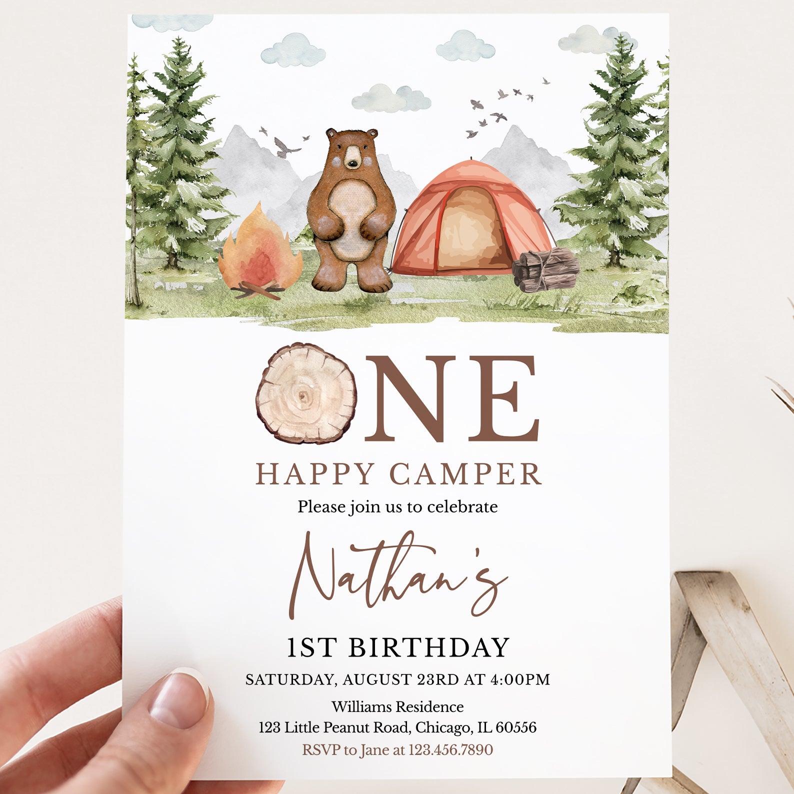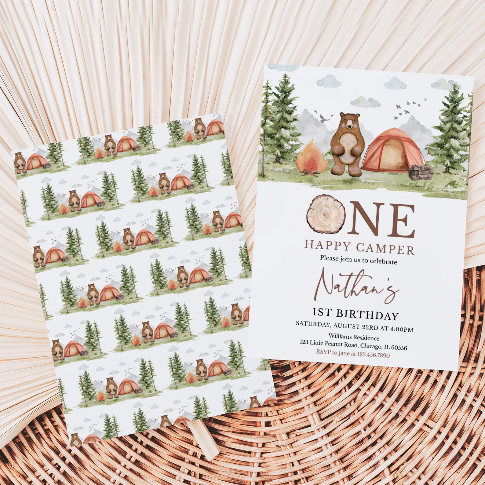 - Purchase this One Happy Camper Birthday Invite: Woodland Adventure Theme template