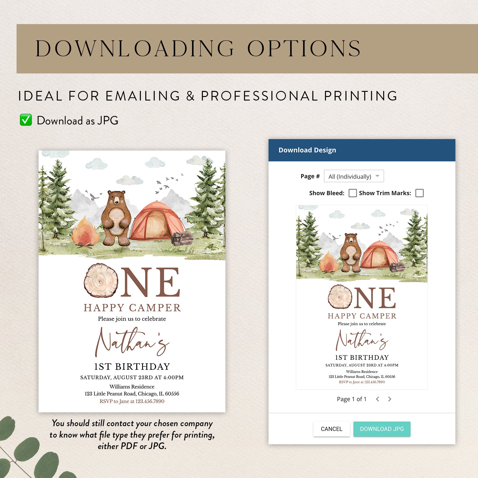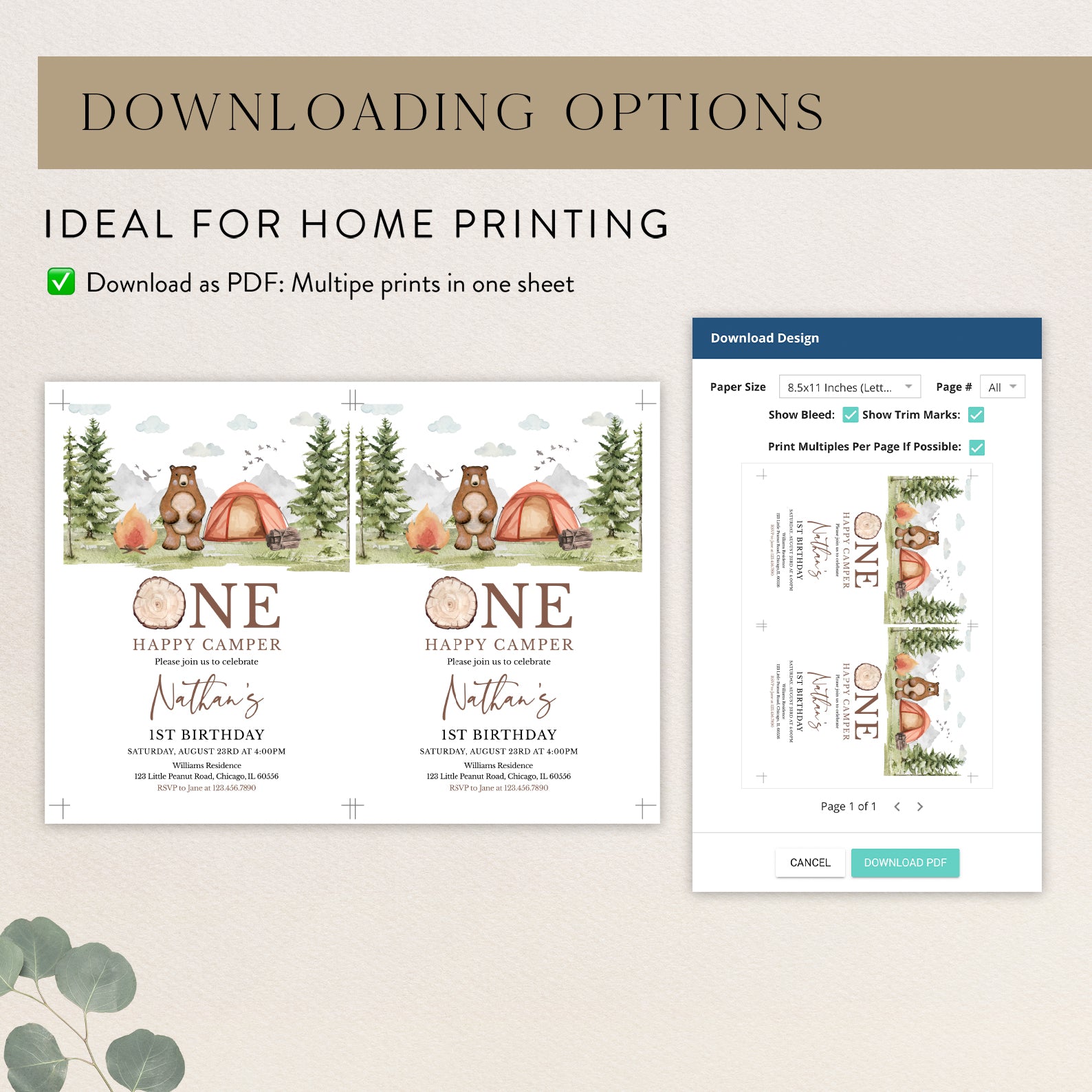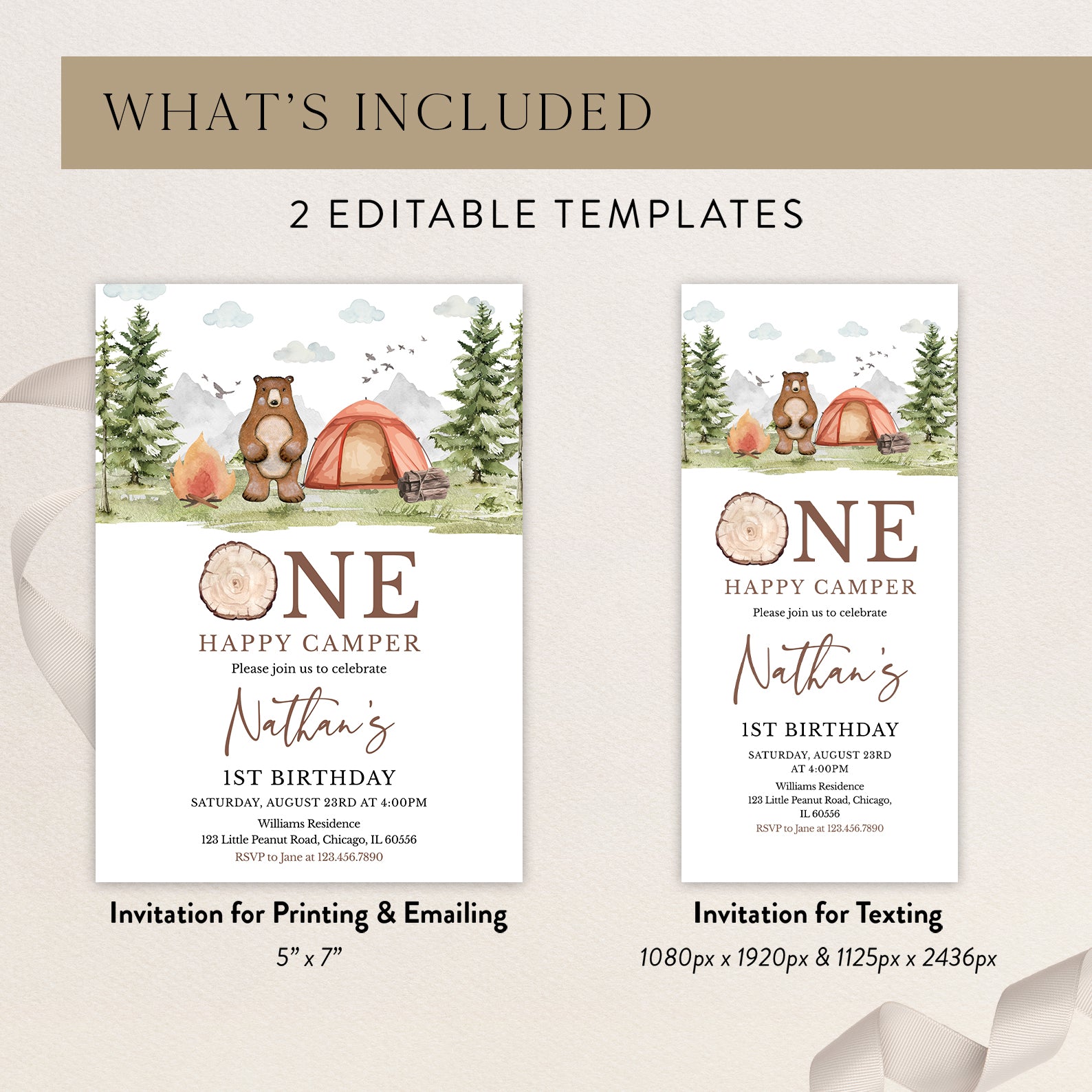 - Purchase this One Happy Camper Birthday Invite: Woodland Adventure Theme template