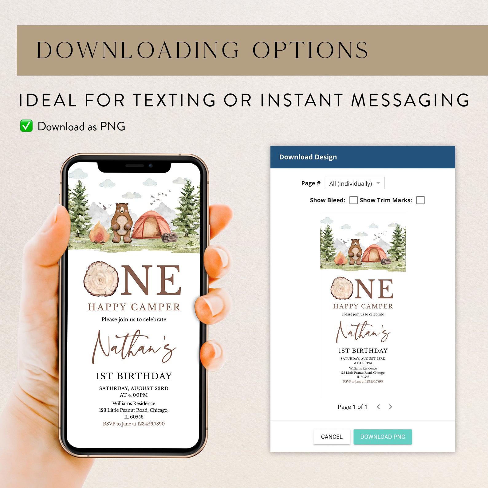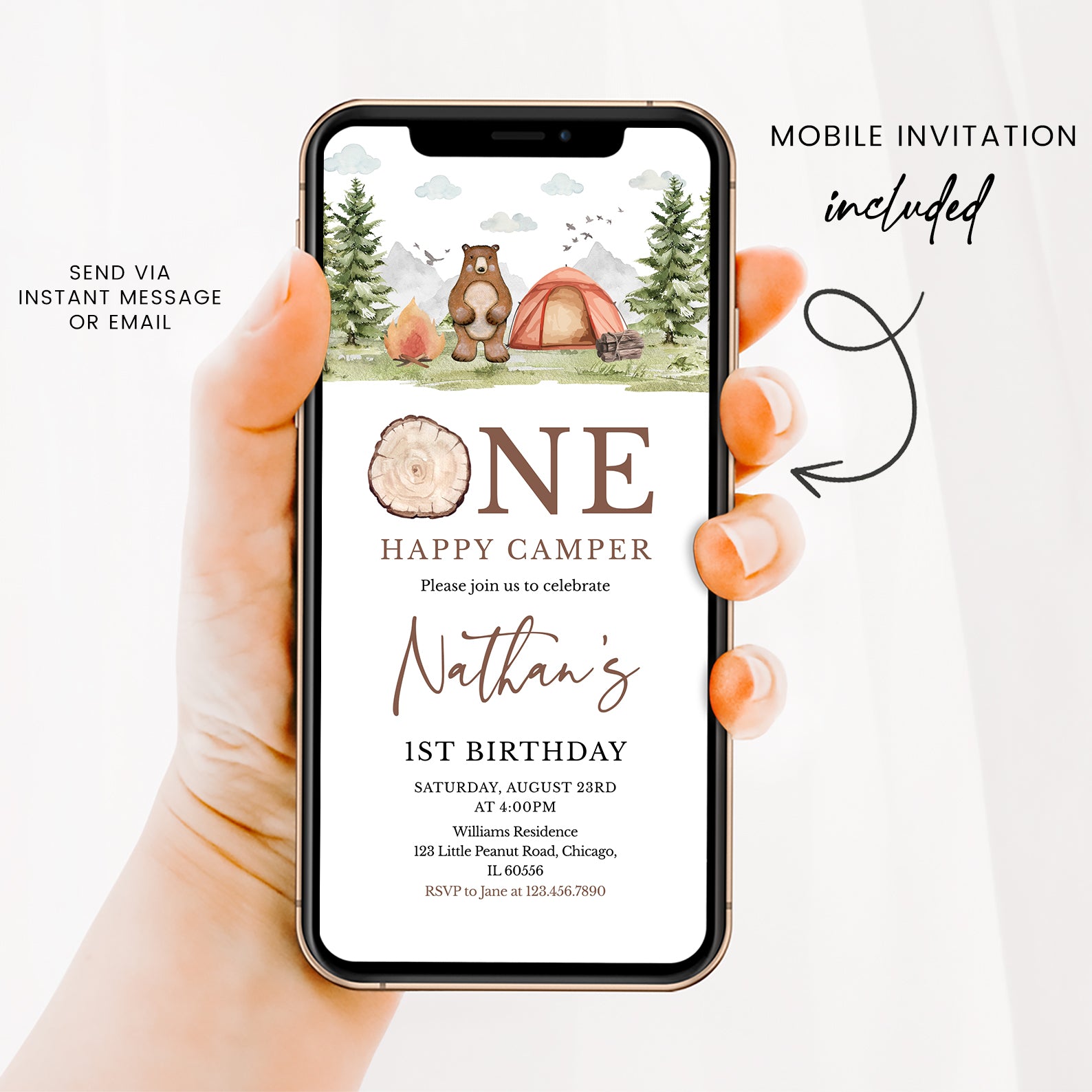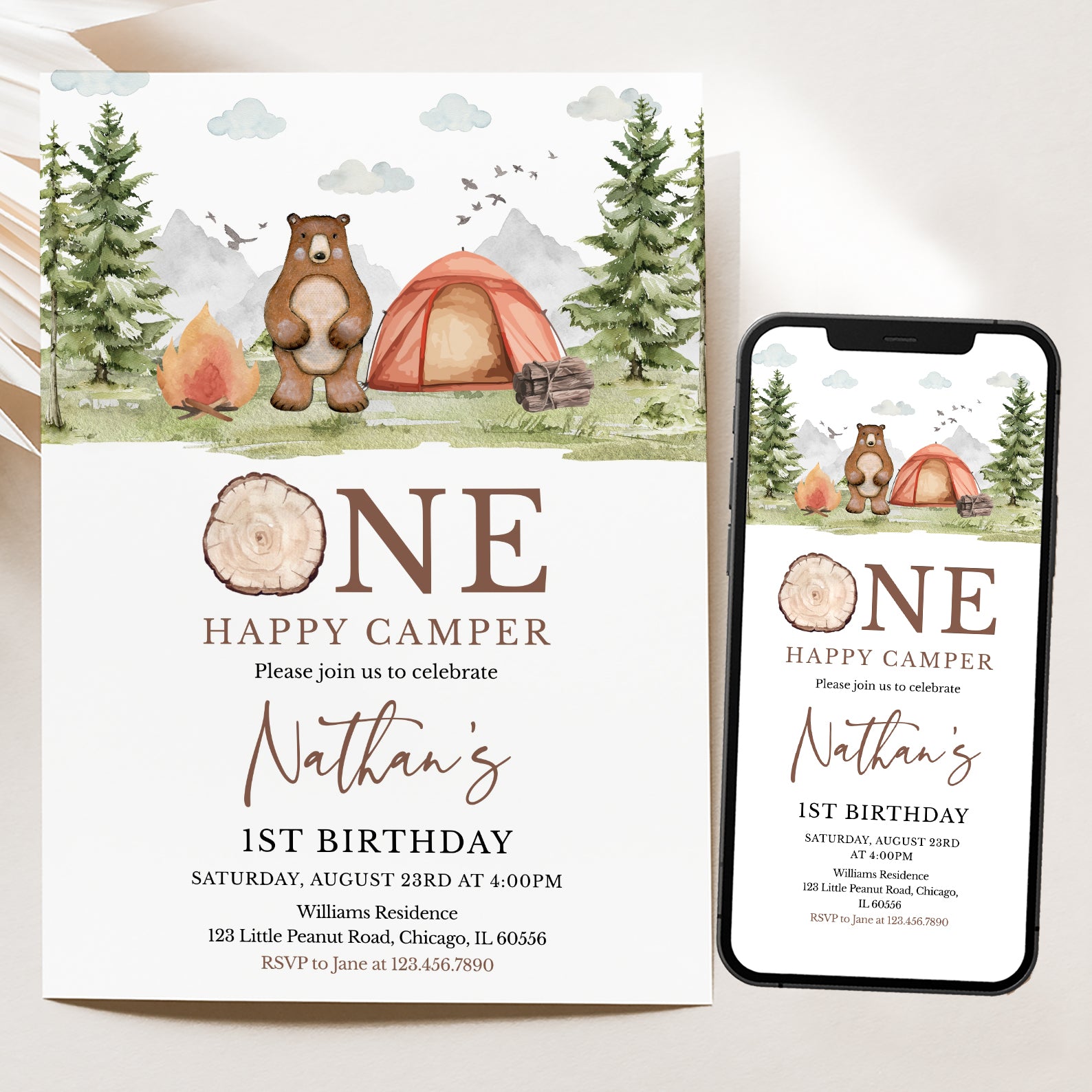 Celebrate your little one's special day with our enchanting "One Happy Camper" digital birthday invitation! Featuring a charming woodland scene complete with majestic pine trees, playful flying birds, fluffy clouds, and a breathtaking mountain backdrop, this invitation sets the perfect tone for an outdoor adventure. With delightful elements like a cozy bonfire, a whimsical camping tent, and a friendly bear, your guests will be excited to join the fun. Easy to customize and share, this digital invite is the ideal way to kick off a memorable birthday celebration in the great outdoors!