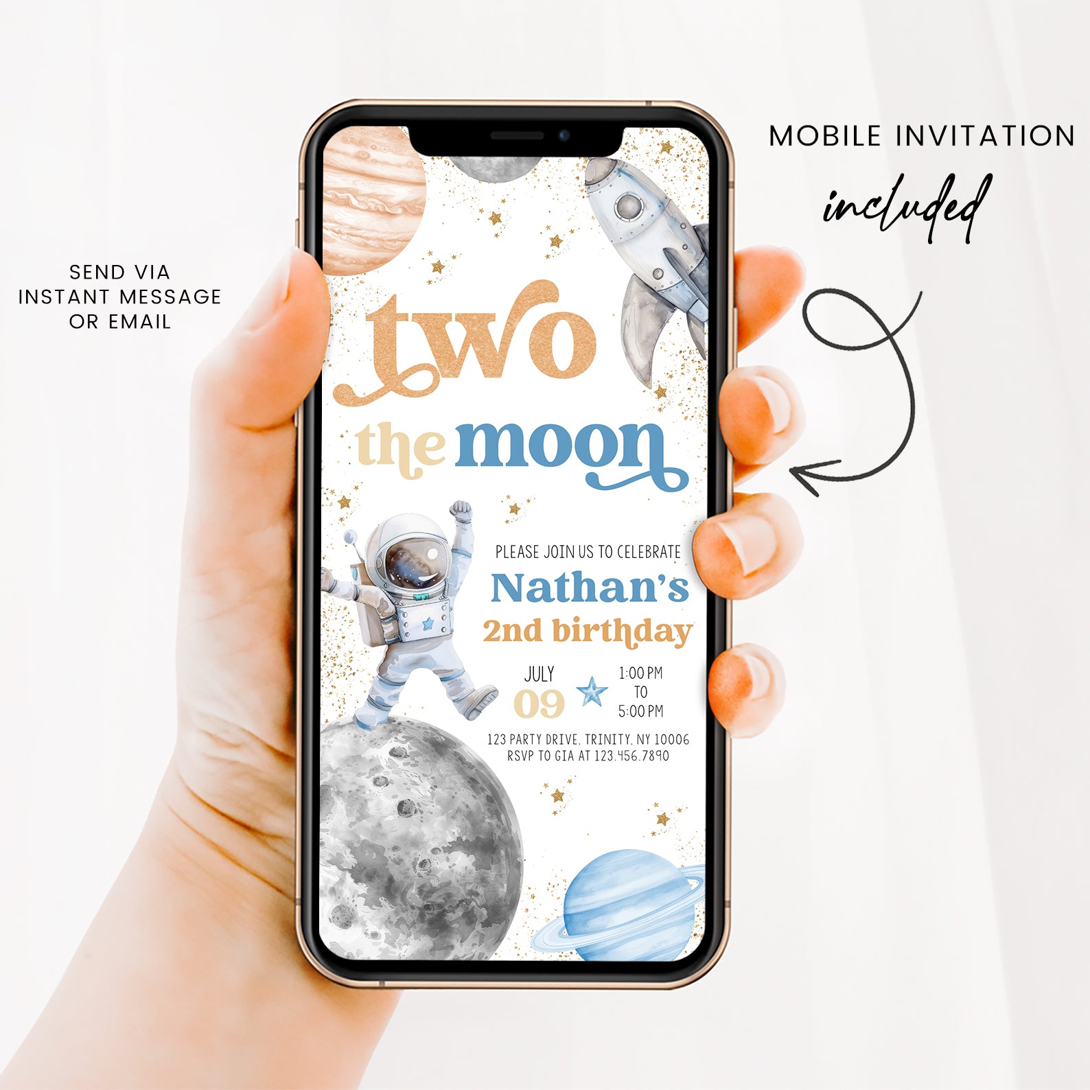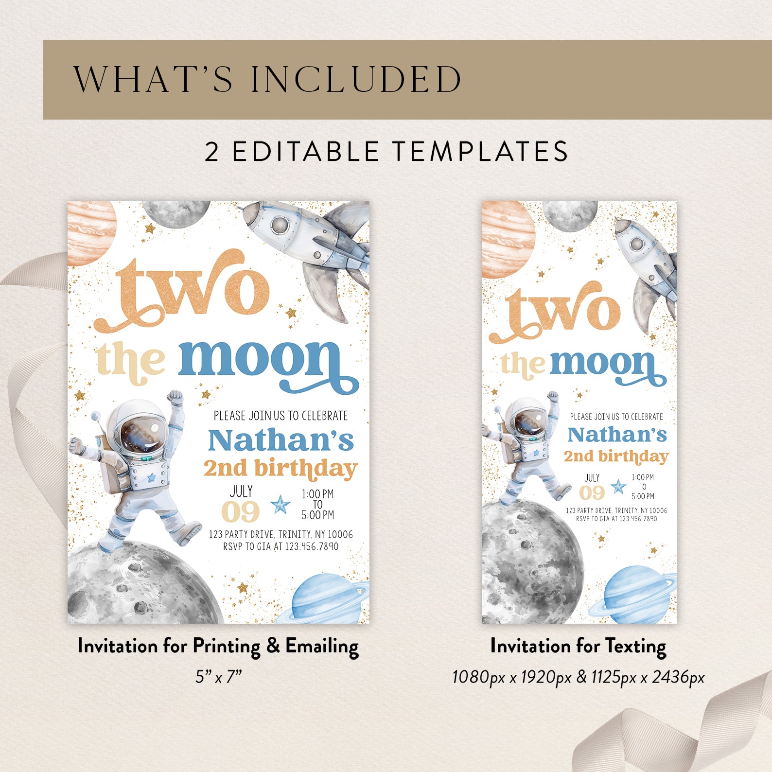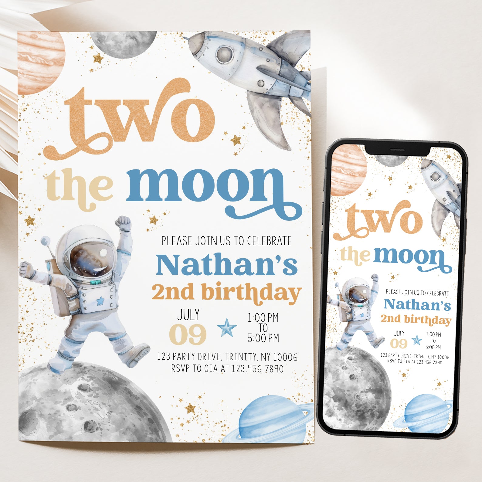 Blast off into a world of fun with our 2nd Birthday Digital Invitation, designed to take your little astronaut on an unforgettable journey to the moon! Featuring a charming astronaut floating amidst whimsical stars, planets, and a playful spaceship, all highlighted by elegant gold accents, this invitation is perfect for setting the tone for a stellar celebration. Available in two vibrant color themes—blue and orange, or pink and purple—it’s easy to match your party’s style. This design will surely excite your guests and make your child’s special day truly out of this world!