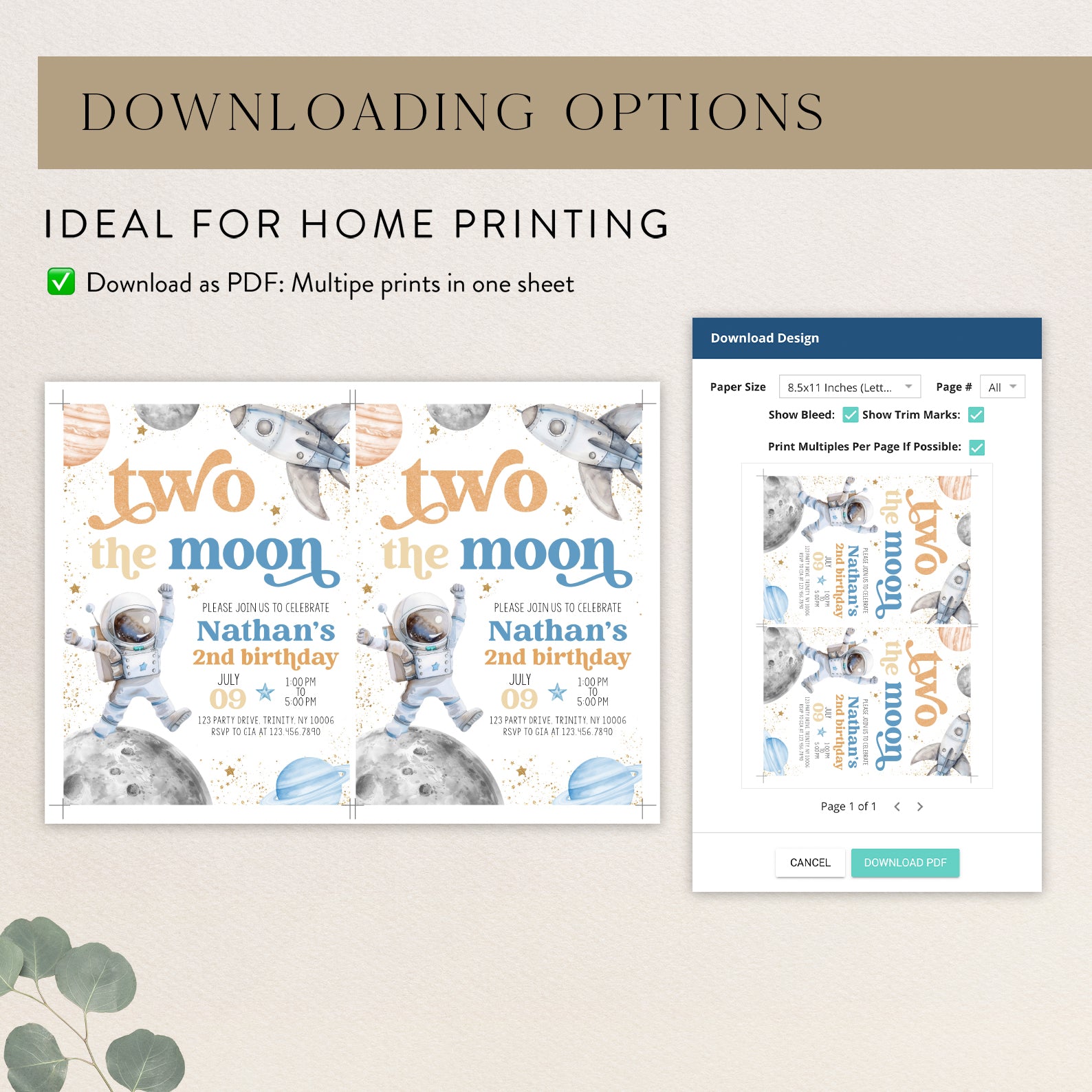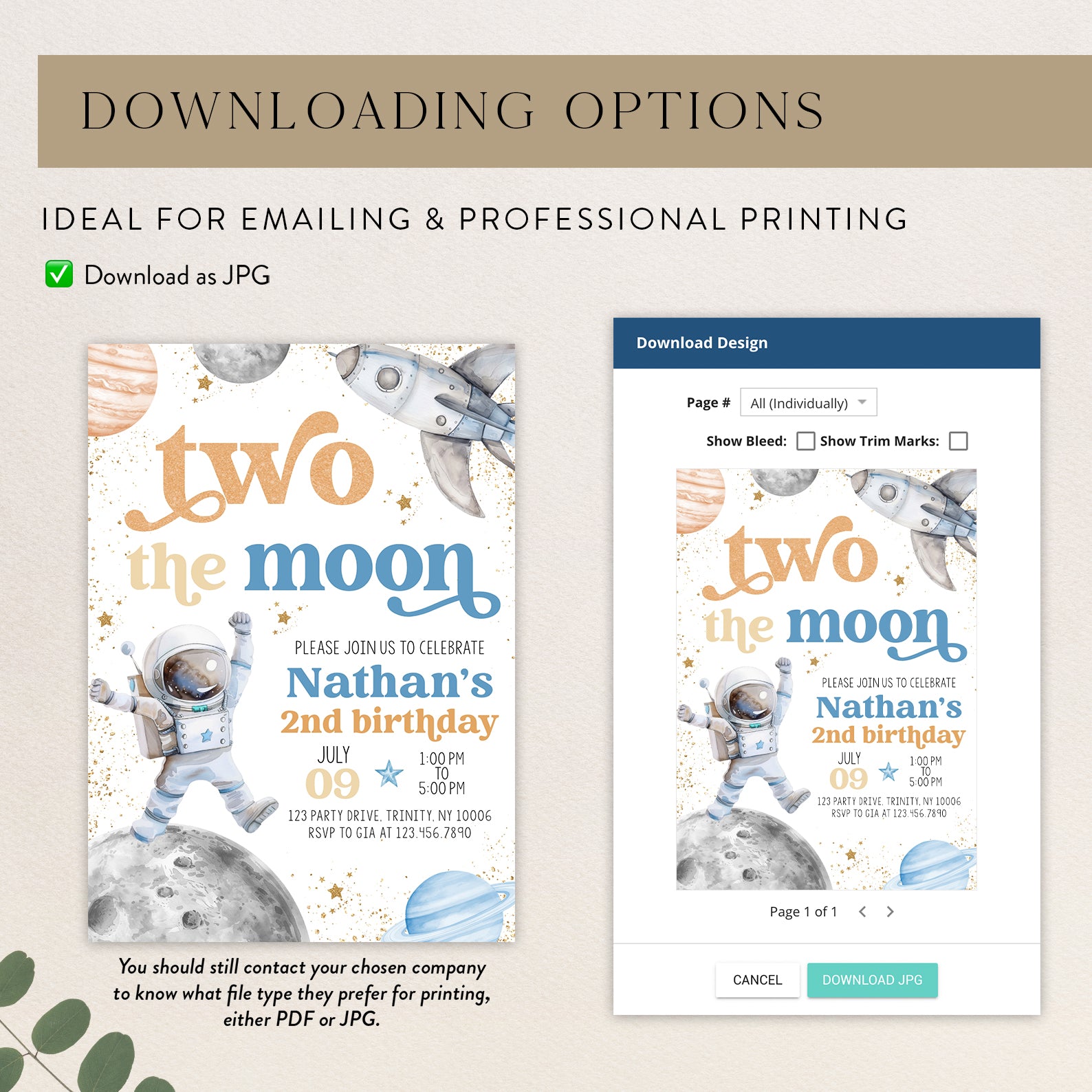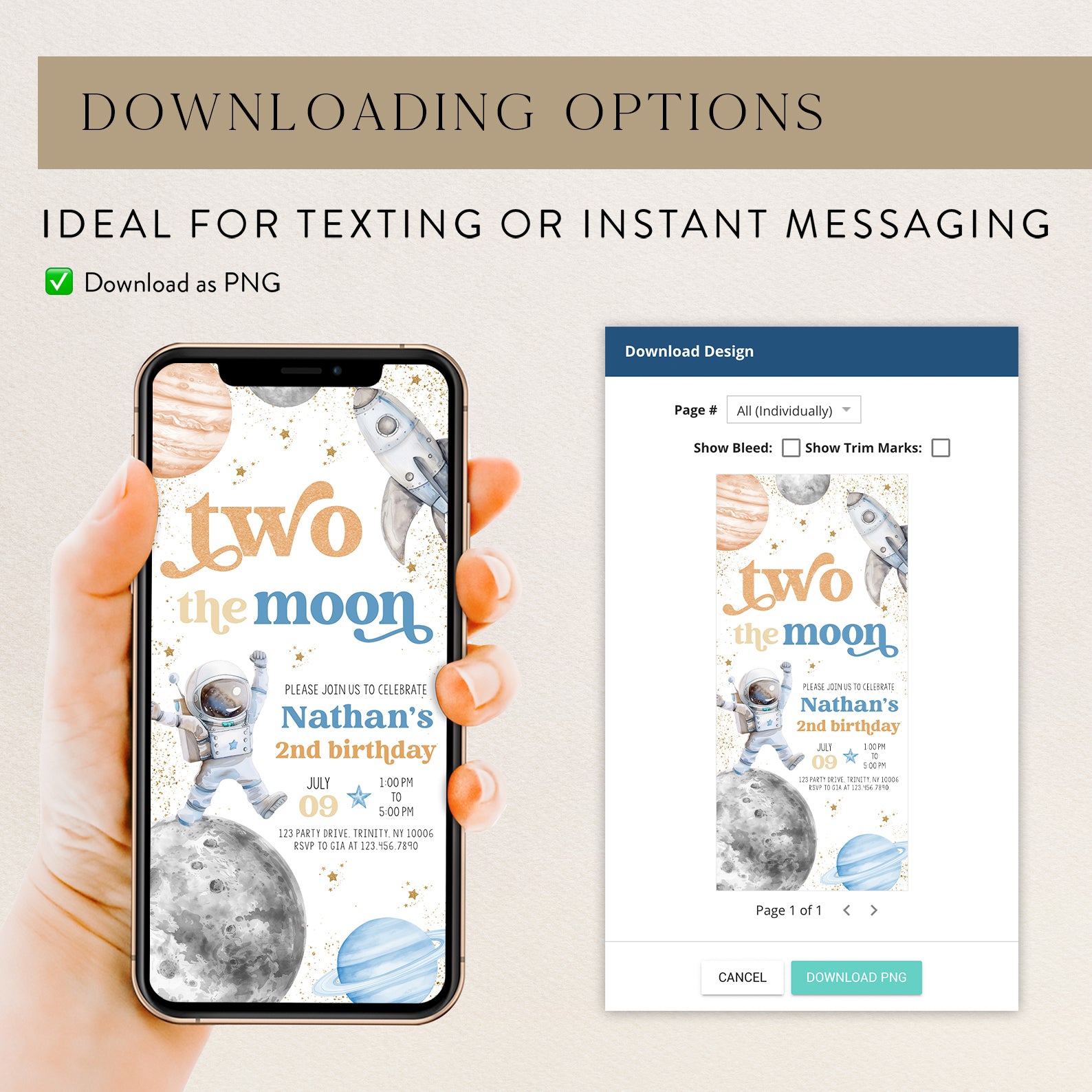 Blast off into a world of fun with our 2nd Birthday Digital Invitation, designed to take your little astronaut on an unforgettable journey to the moon! Featuring a charming astronaut floating amidst whimsical stars, planets, and a playful spaceship, all highlighted by elegant gold accents, this invitation is perfect for setting the tone for a stellar celebration. Available in two vibrant color themes—blue and orange, or pink and purple—it’s easy to match your party’s style. This design will surely excite your guests and make your child’s special day truly out of this world!