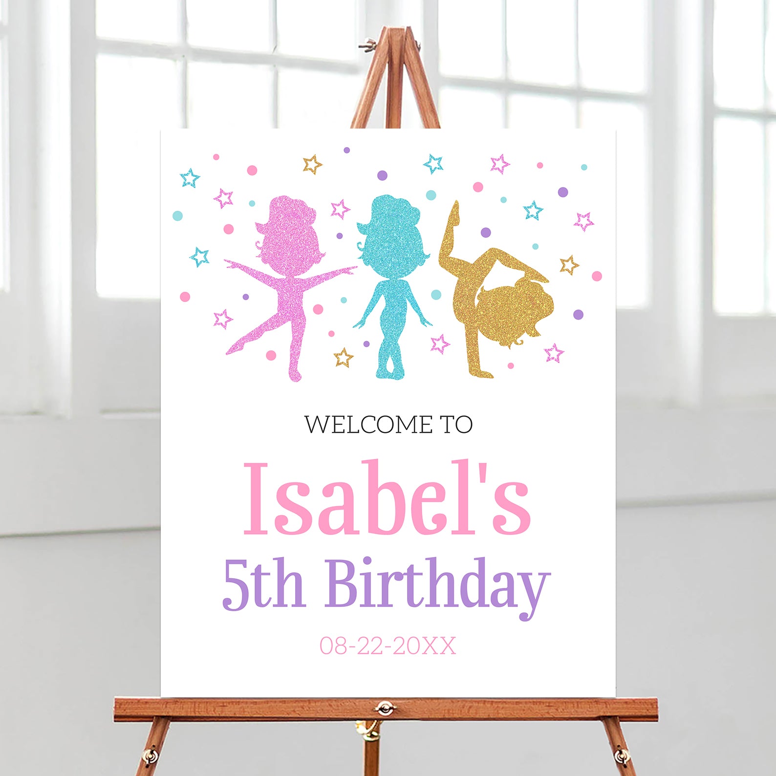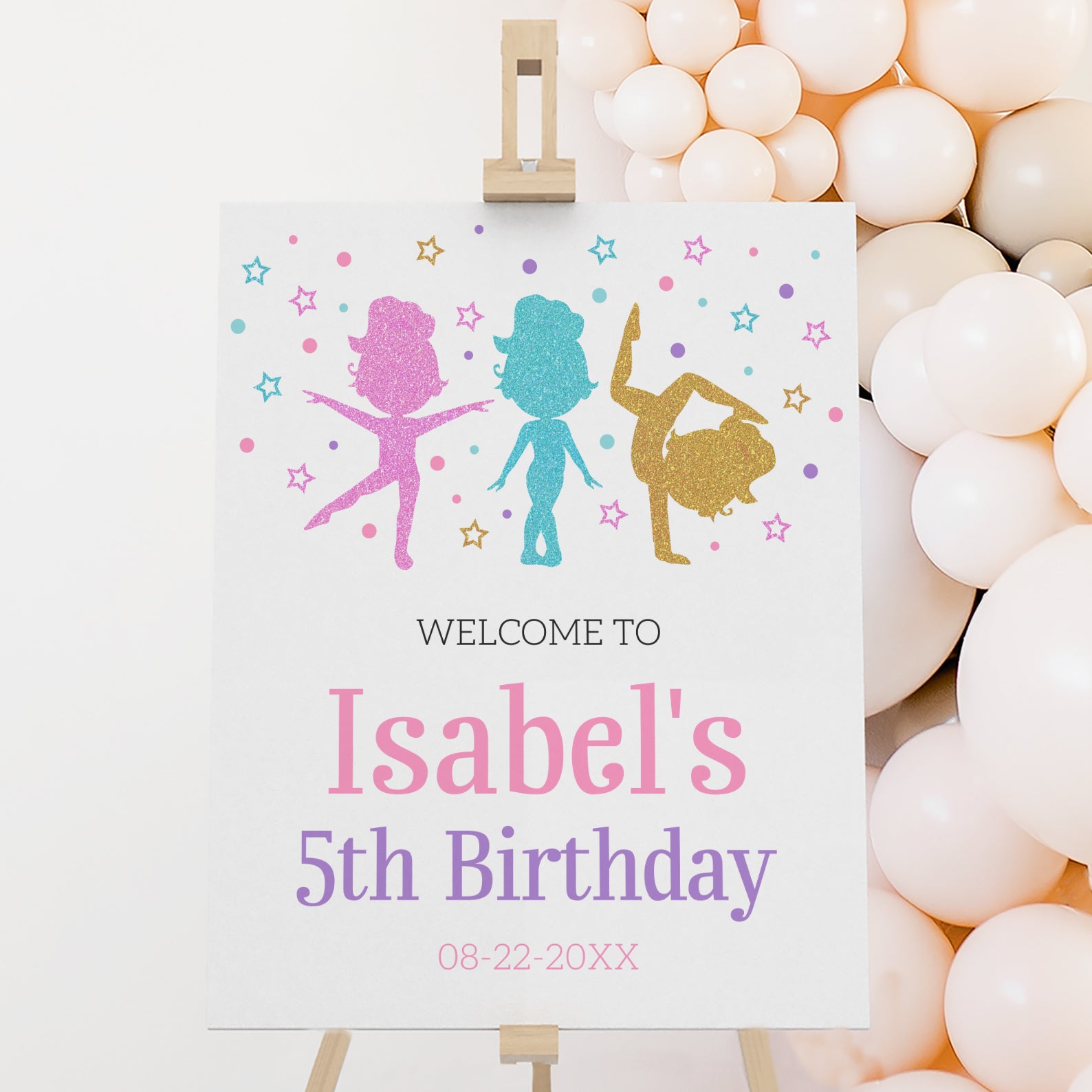 Greet your guests in style with this eye-catching gymnastics-themed digital welcome sign, perfect for your little one's 5th birthday celebration. Featuring three glittery gymnasts mid-motion, surrounded by bursts of colorful stars and confetti dots, this design captures the high energy and fun of a day full of flips and tumbles. Set against a playful backdrop, it's an ideal way to welcome friends and family and kick off a memorable celebration. Instantly downloadable and easy to personalize, this sign adds a cheerful, coordinated touch to your party decor!