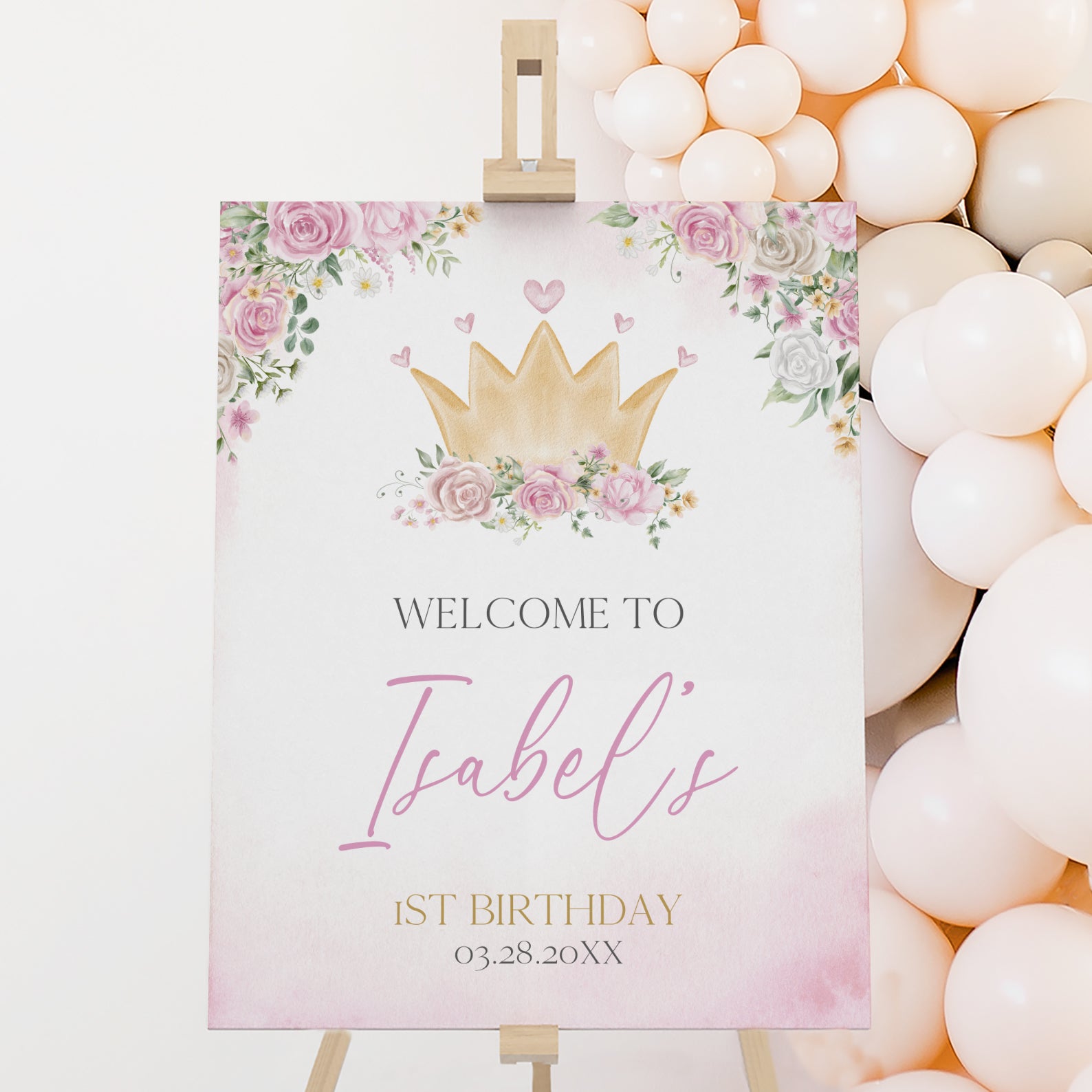 - Purchase this Little Princess Is Turning One: Floral Crown Pink Birthday Welcome Sign template