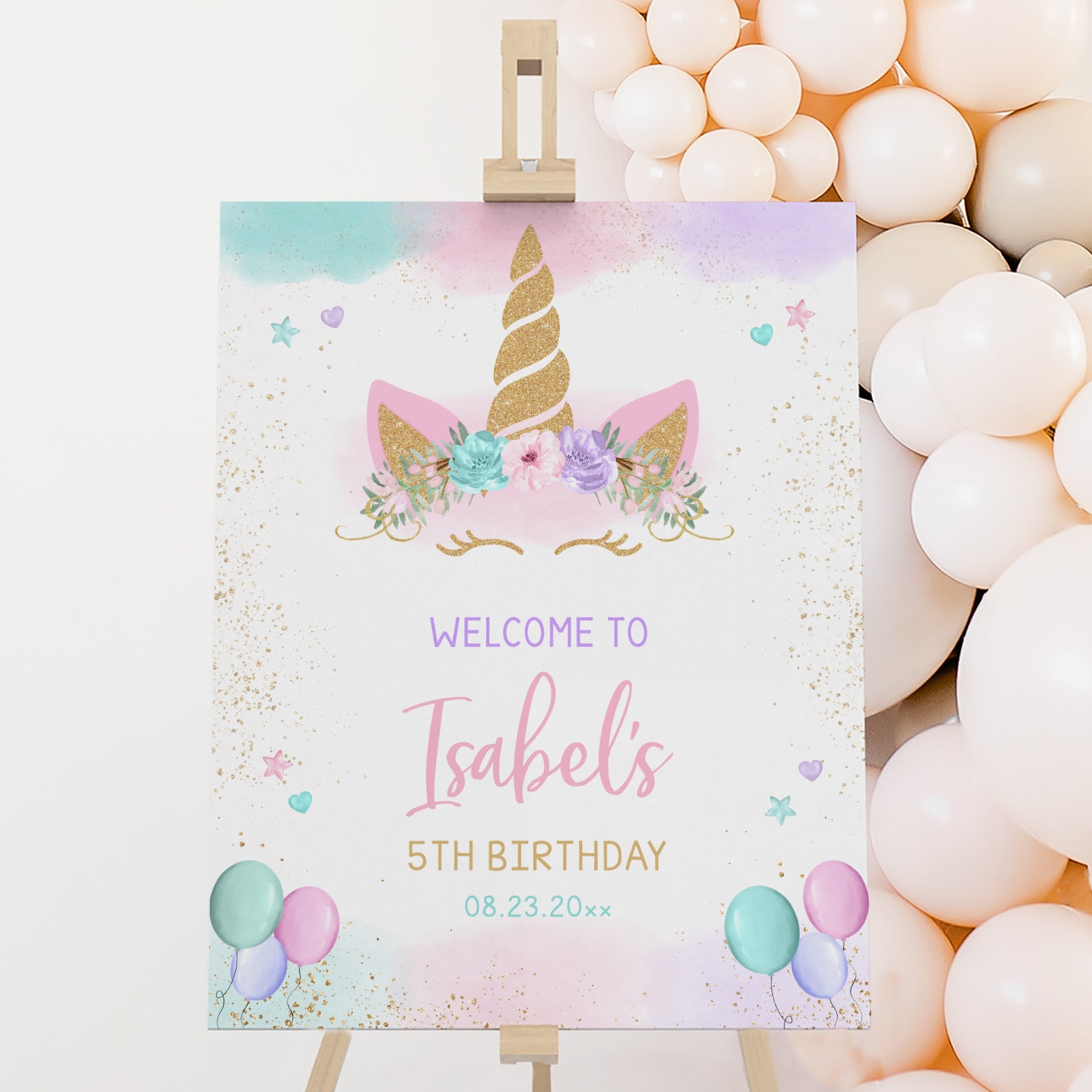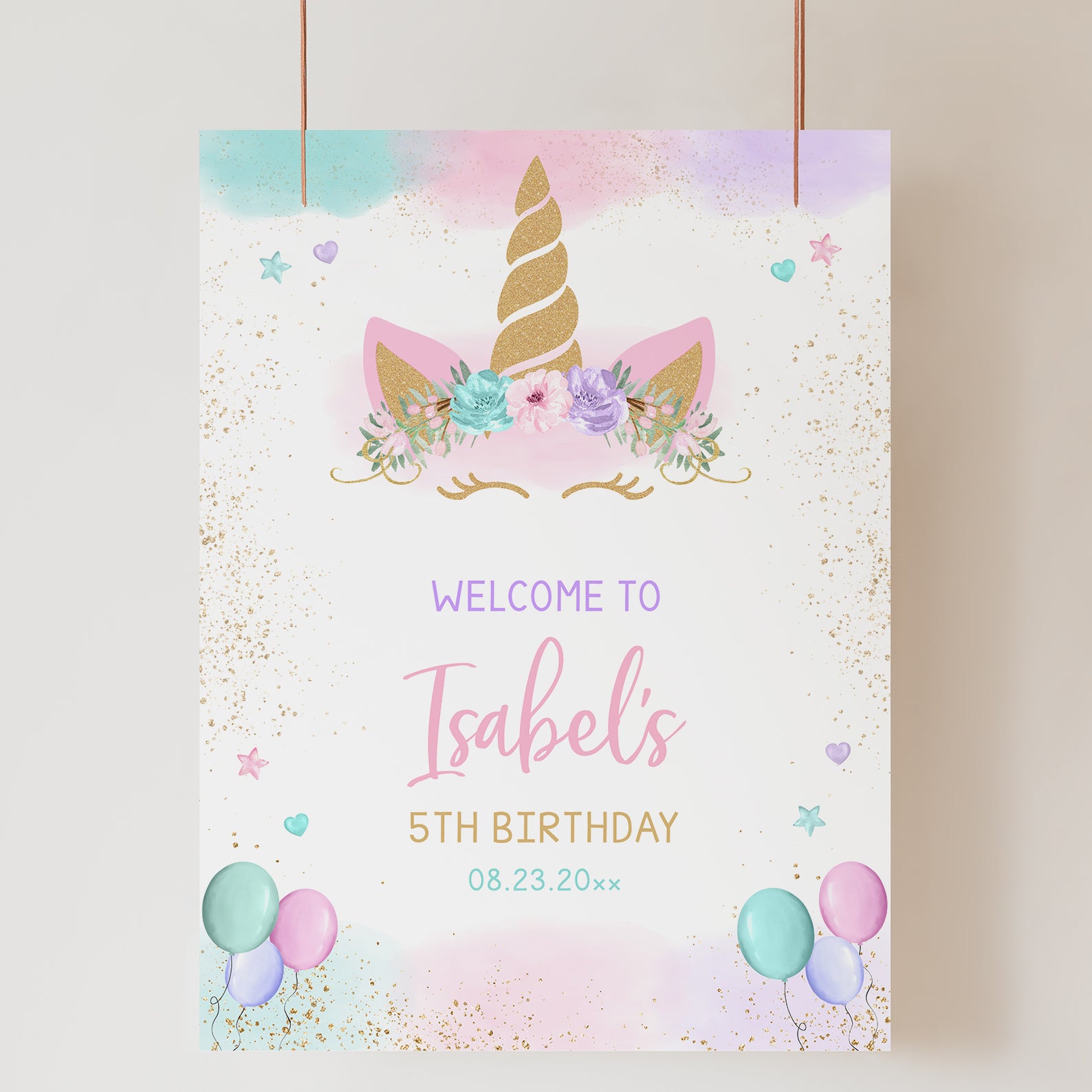 Welcome guests to a magical 5th birthday celebration with this charming digital welcome sign! Showcasing a beautiful pink and gold unicorn horn and ears decorated with delicate florals, this sign adds a whimsical and festive touch to your party décor. Accented with elegant gold details and playful balloons at the corners, it perfectly complements the soft watercolor pastels of blue, pink, and purple in the background. Easy to customize and display, this welcome sign sets the perfect enchanted tone as friends and family arrive to celebrate a truly special day!