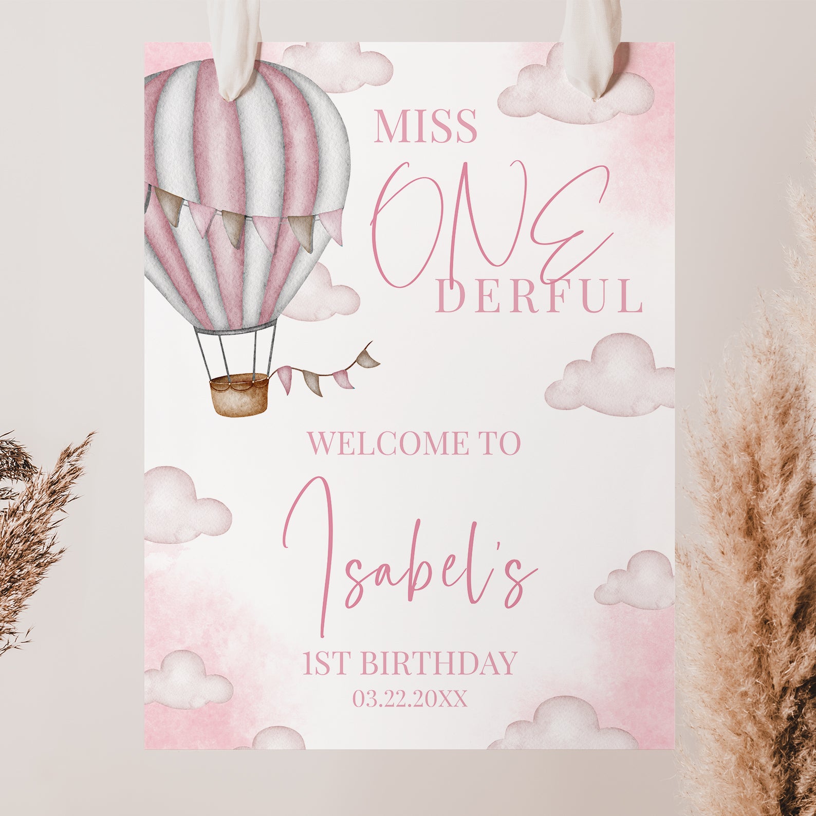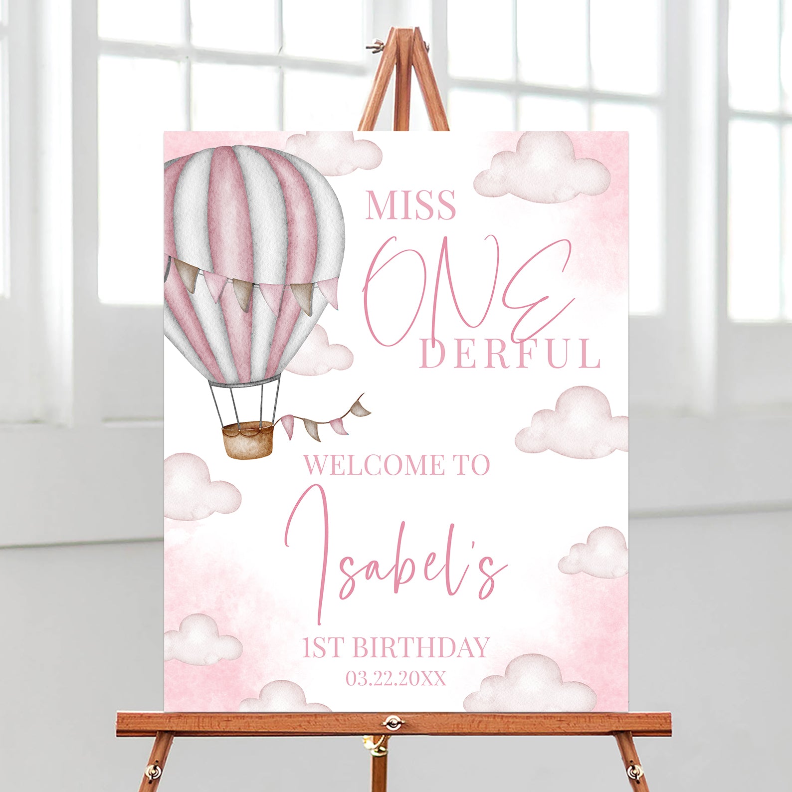 - Purchase this Onederful Birthday Welcome Sign: Pink Hot Air Balloon Theme template
