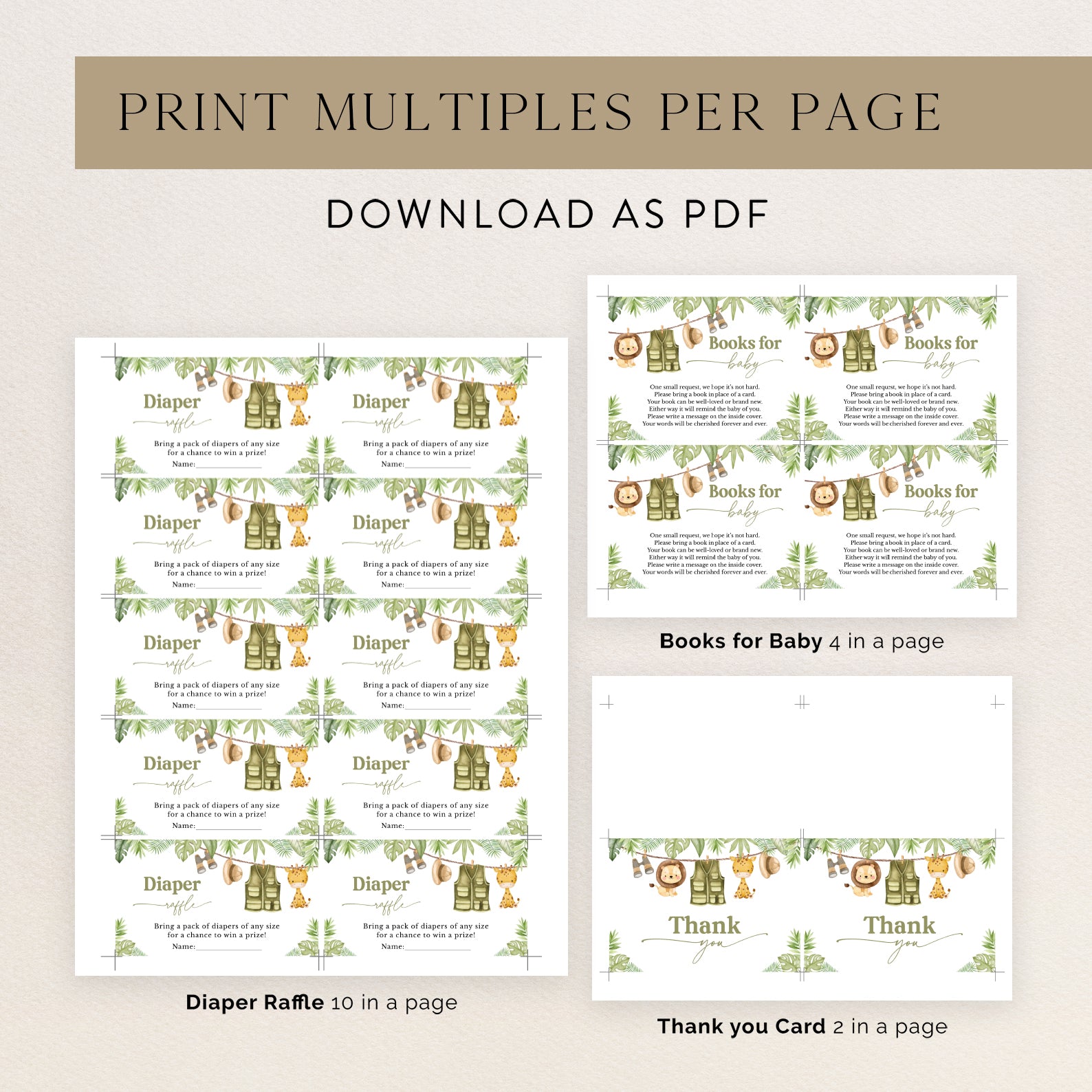 Get ready for an adventurous celebration with our A Little Wild One baby shower invitation bundle! Featuring a jungle-inspired design with lush green leaves, playful safari elements, and charming animals, this set includes everything you need—invitation, mobile invite, diaper raffle, books for baby, and thank you card. Perfect for welcoming your little explorer!