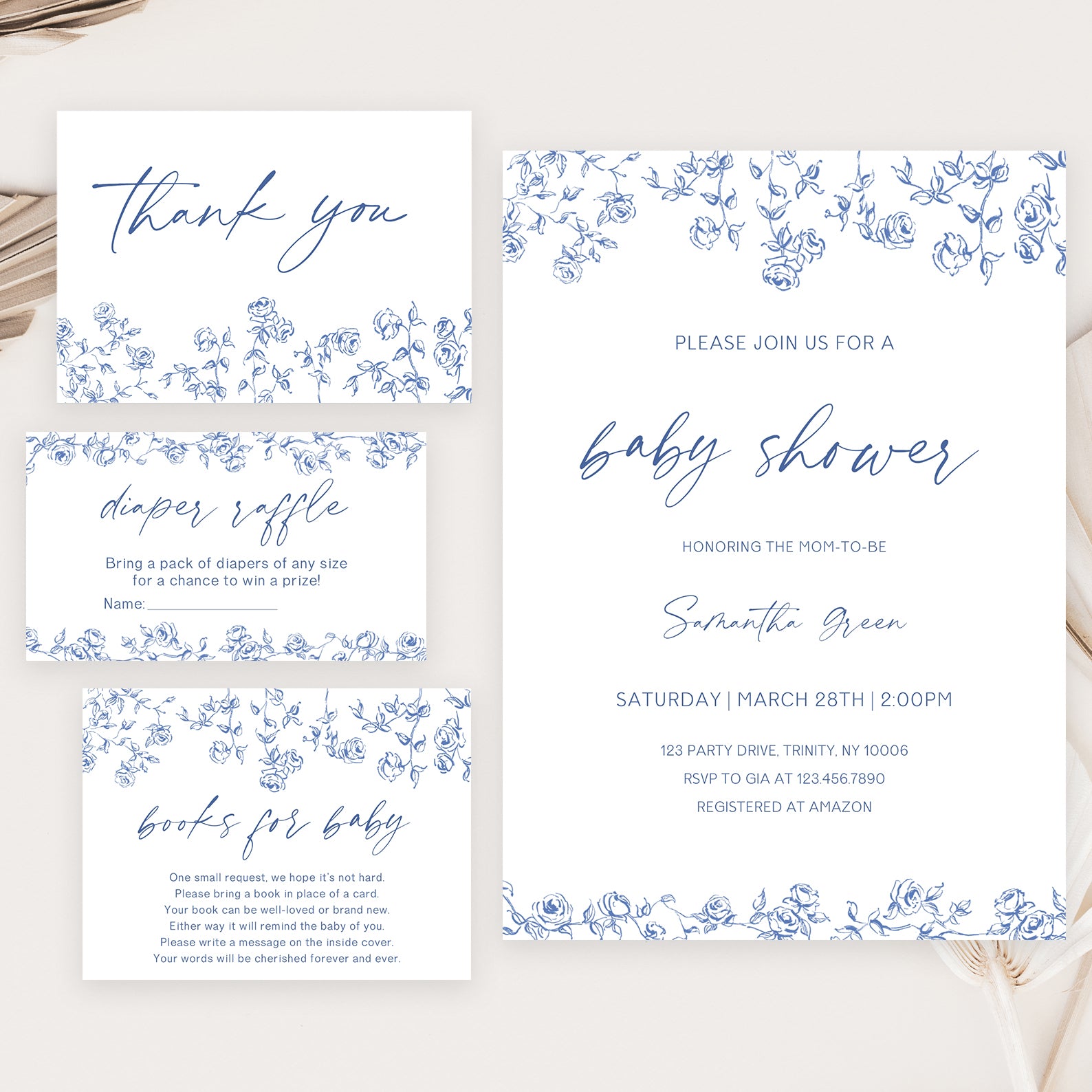 Elegant Blue Floral Baby Shower Digital Invitation Bundle
