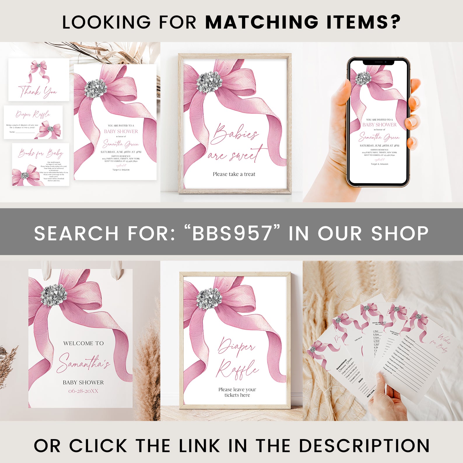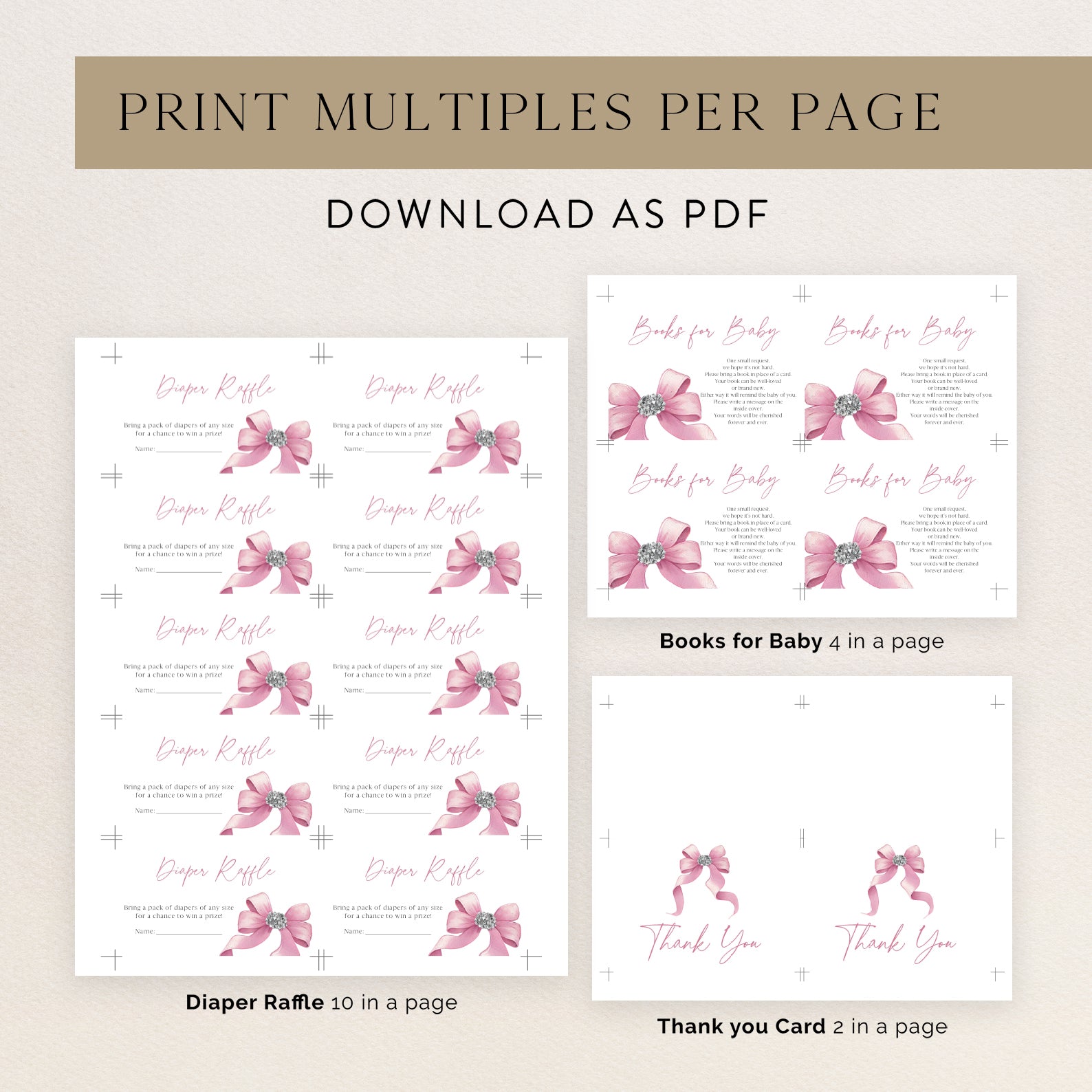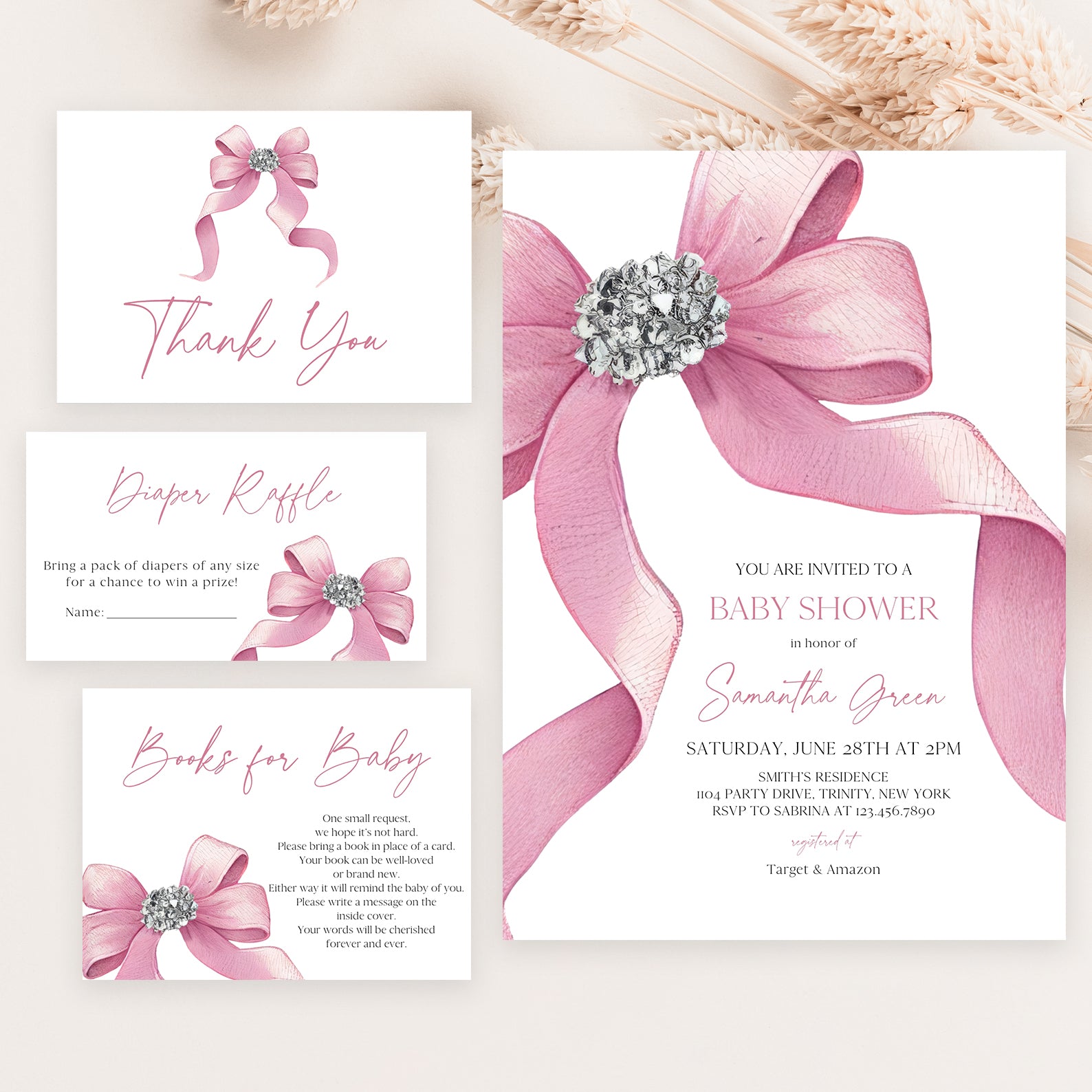 Celebrate your little one’s arrival with this elegant evergreen baby shower bundle. Featuring a charming pink bow, this set includes an invitation, mobile invite, diaper raffle, books for baby, and a thank you card—everything you need for a beautifully coordinated celebration!