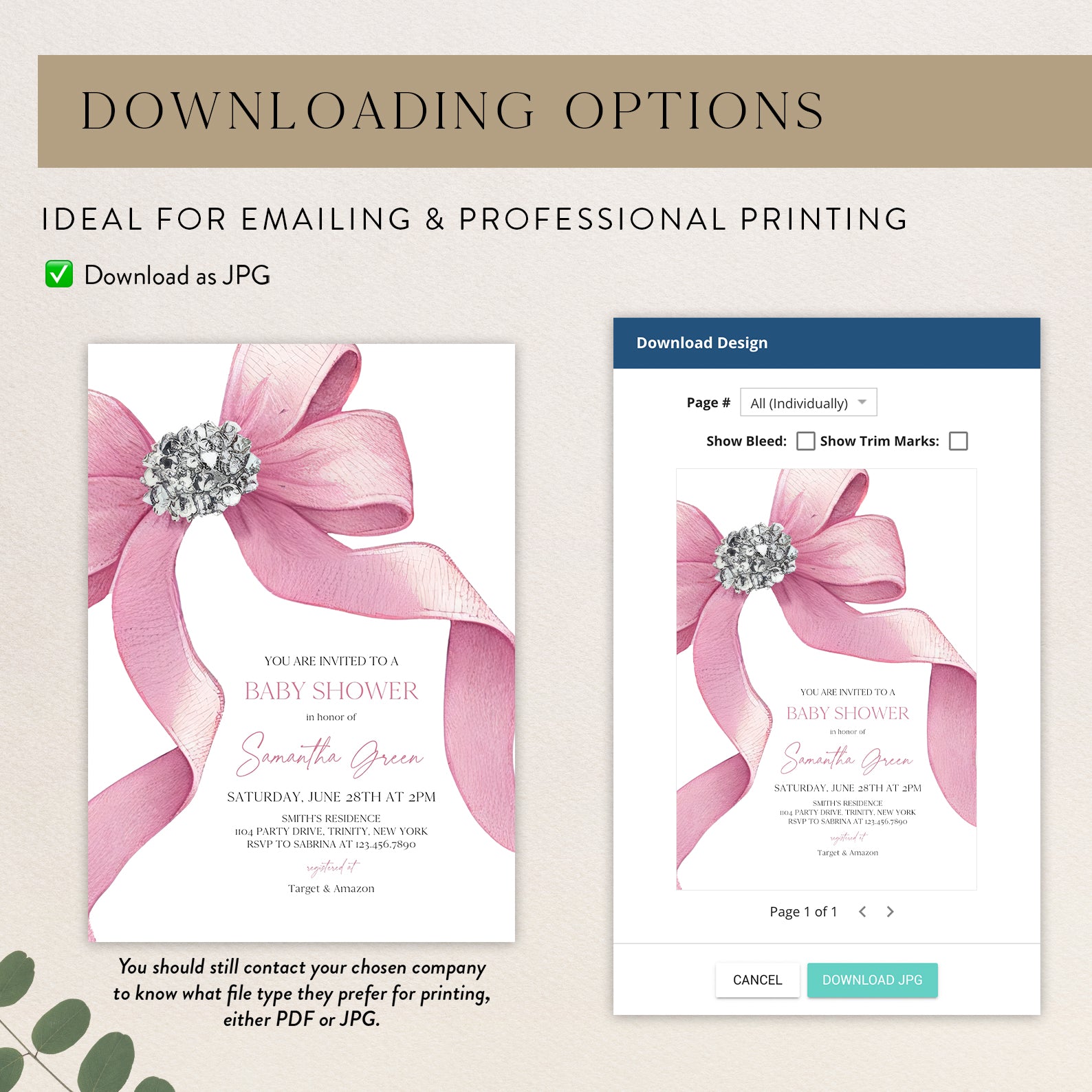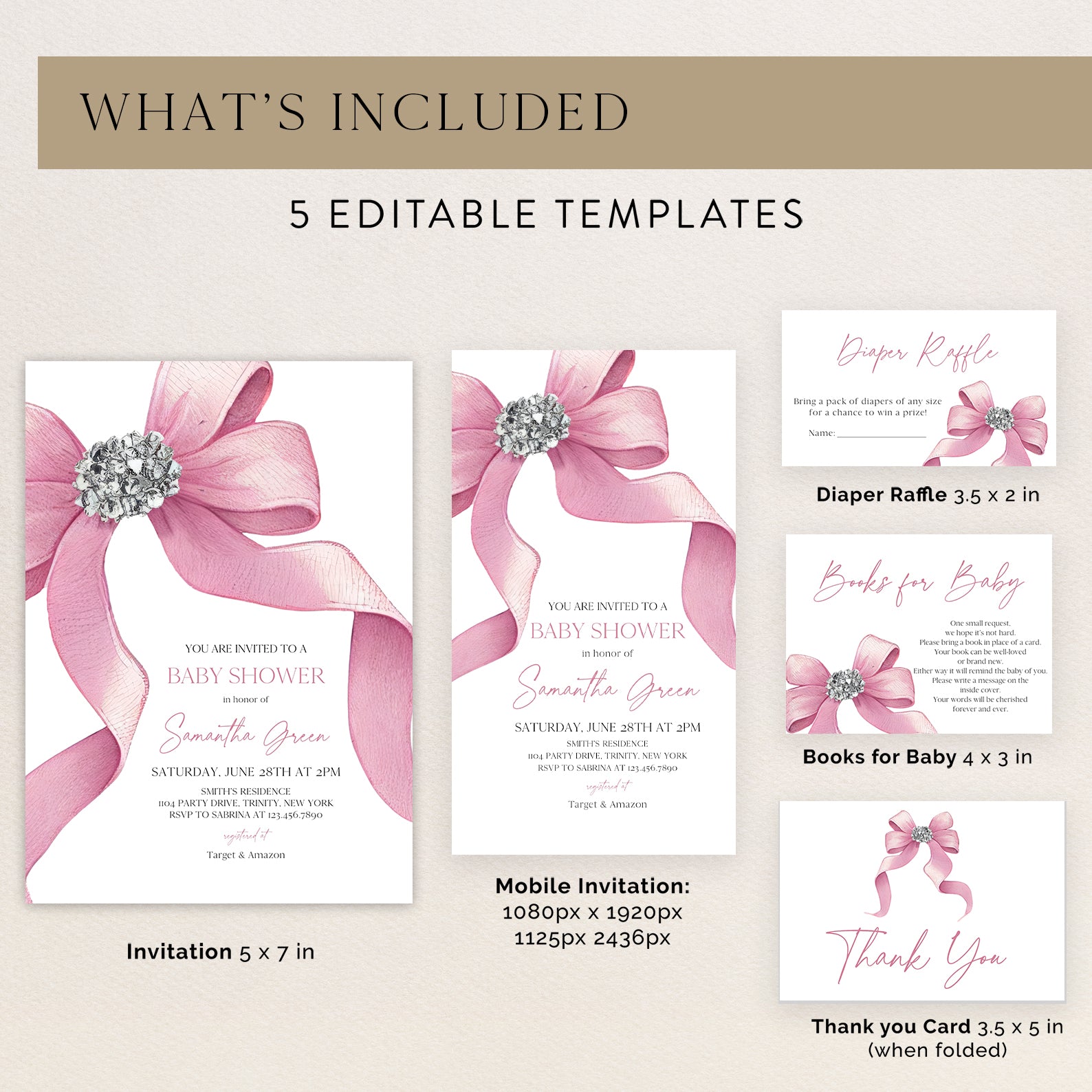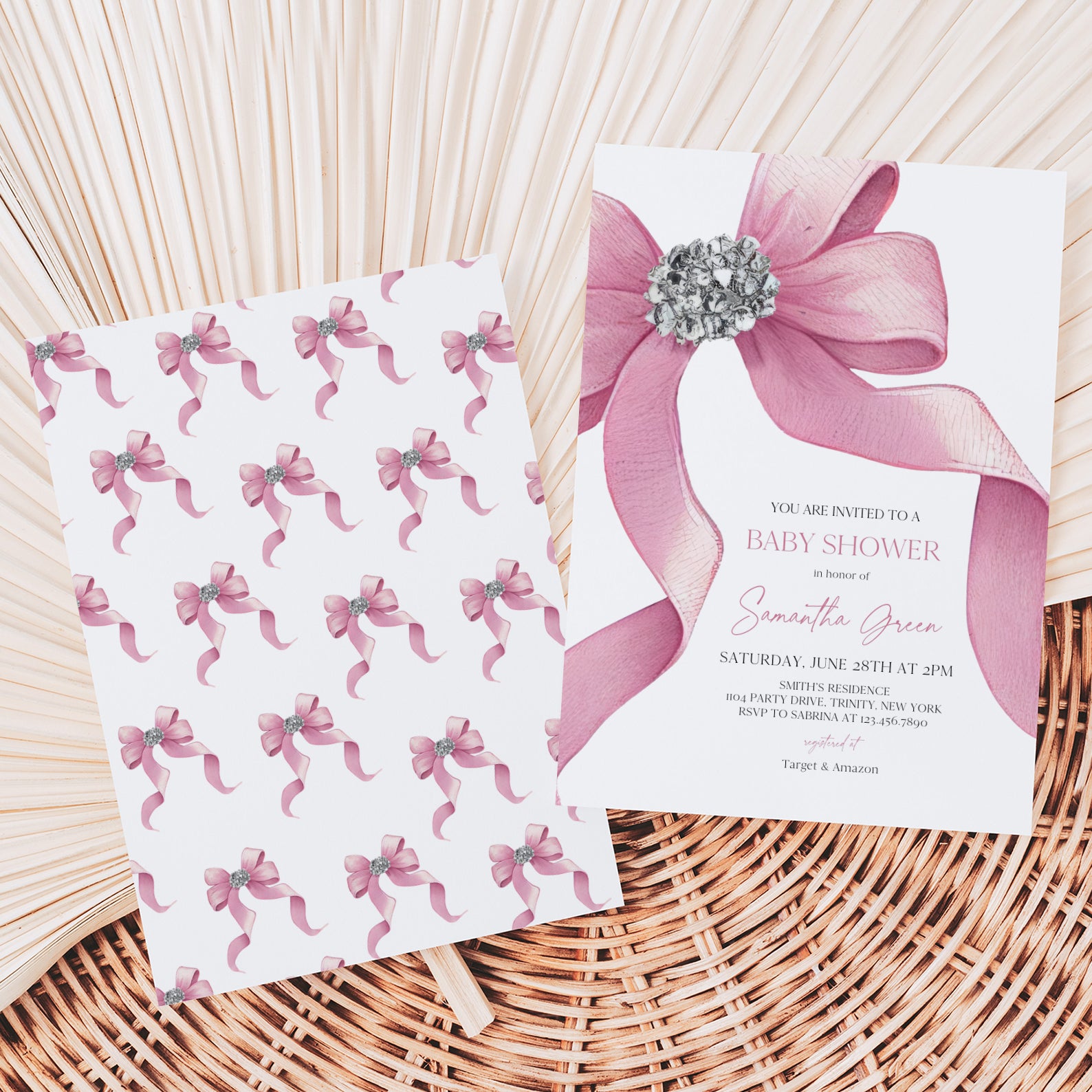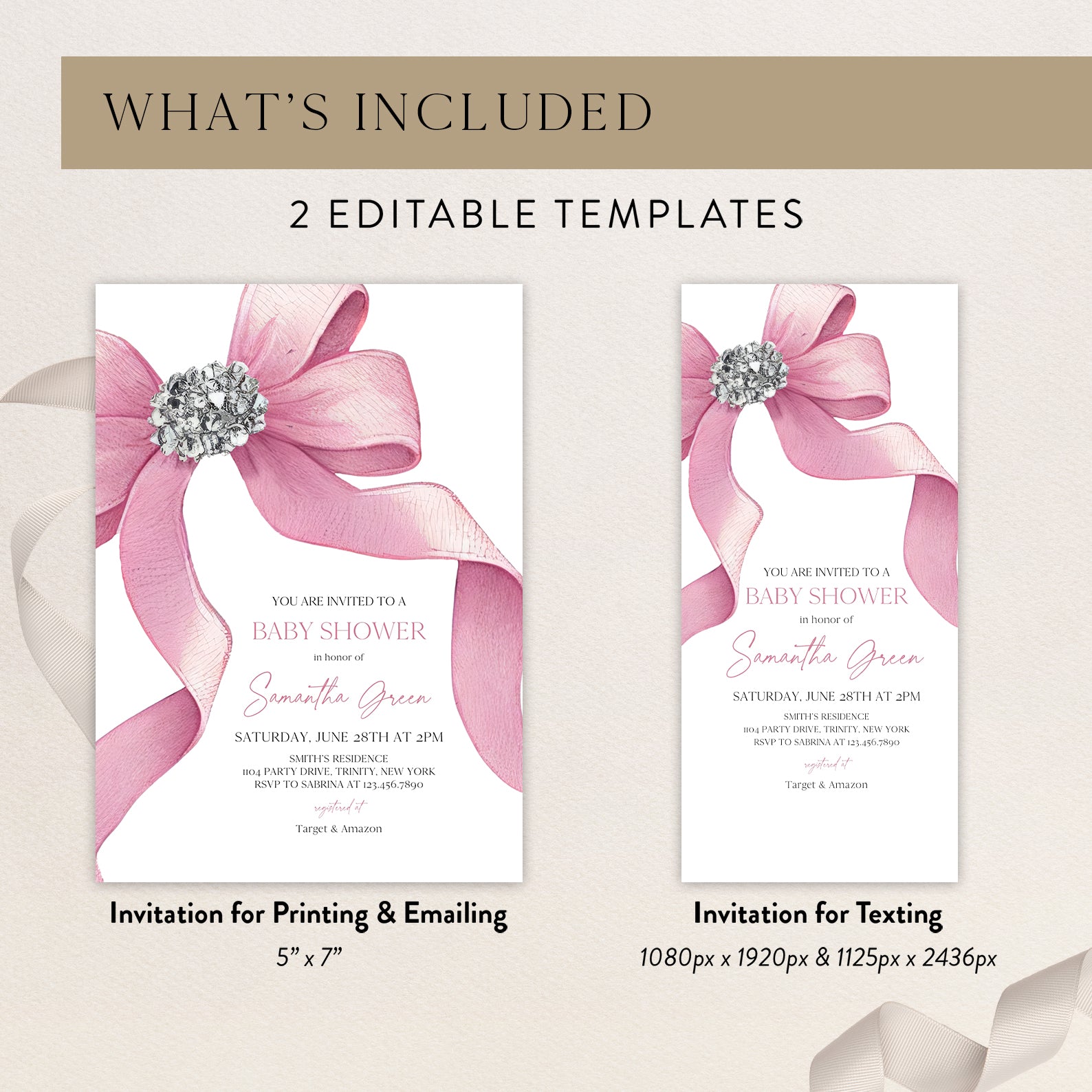 - Purchase this Evergreen Baby Shower Invitation Bundle with Pink Bow Digital Design template