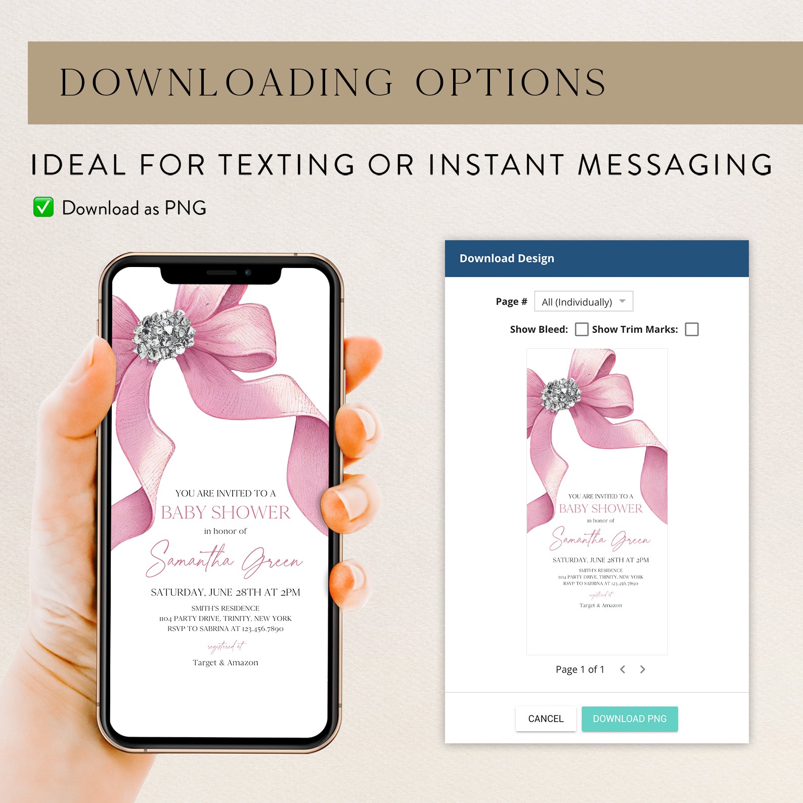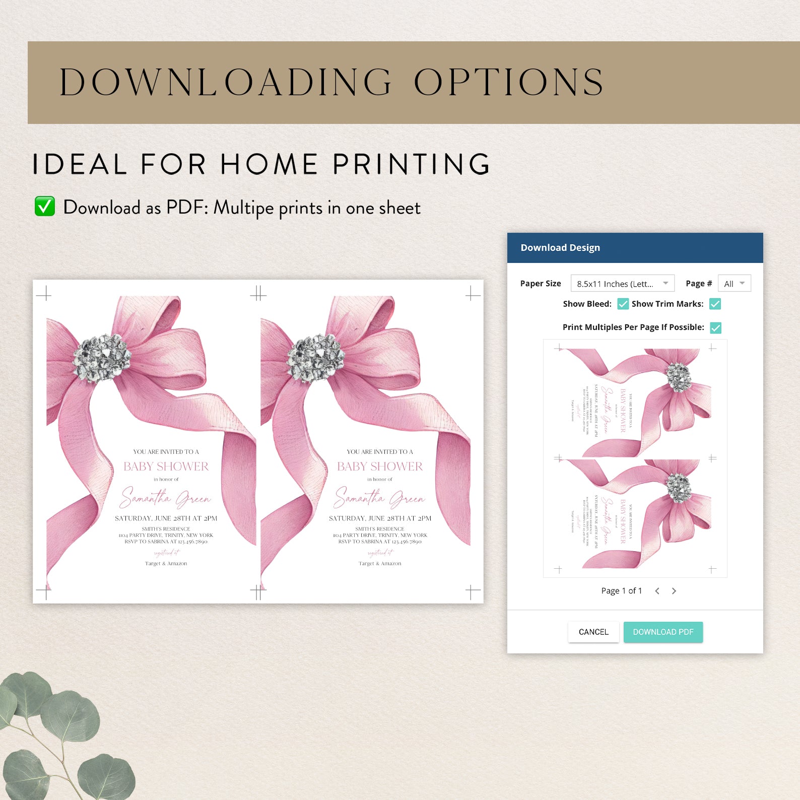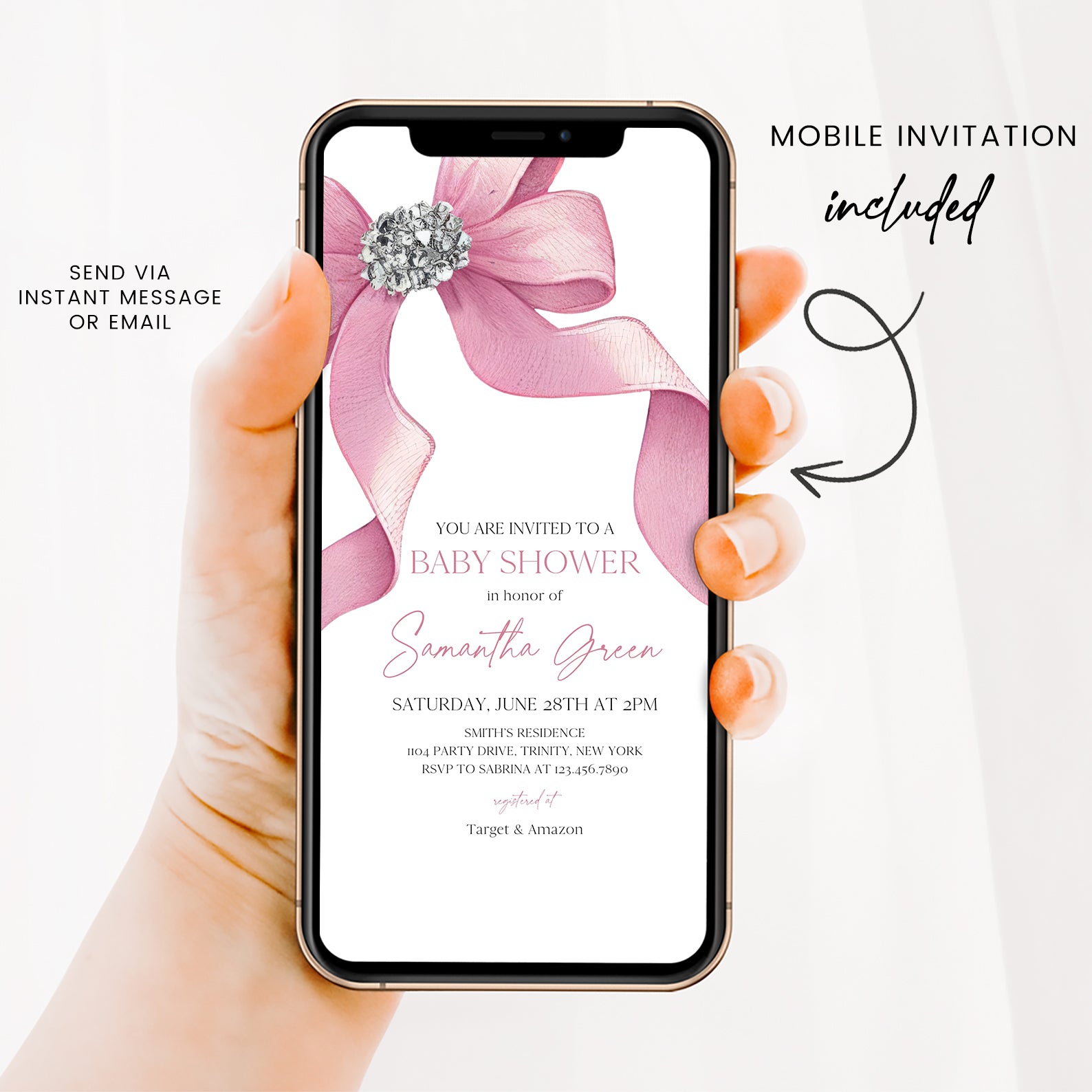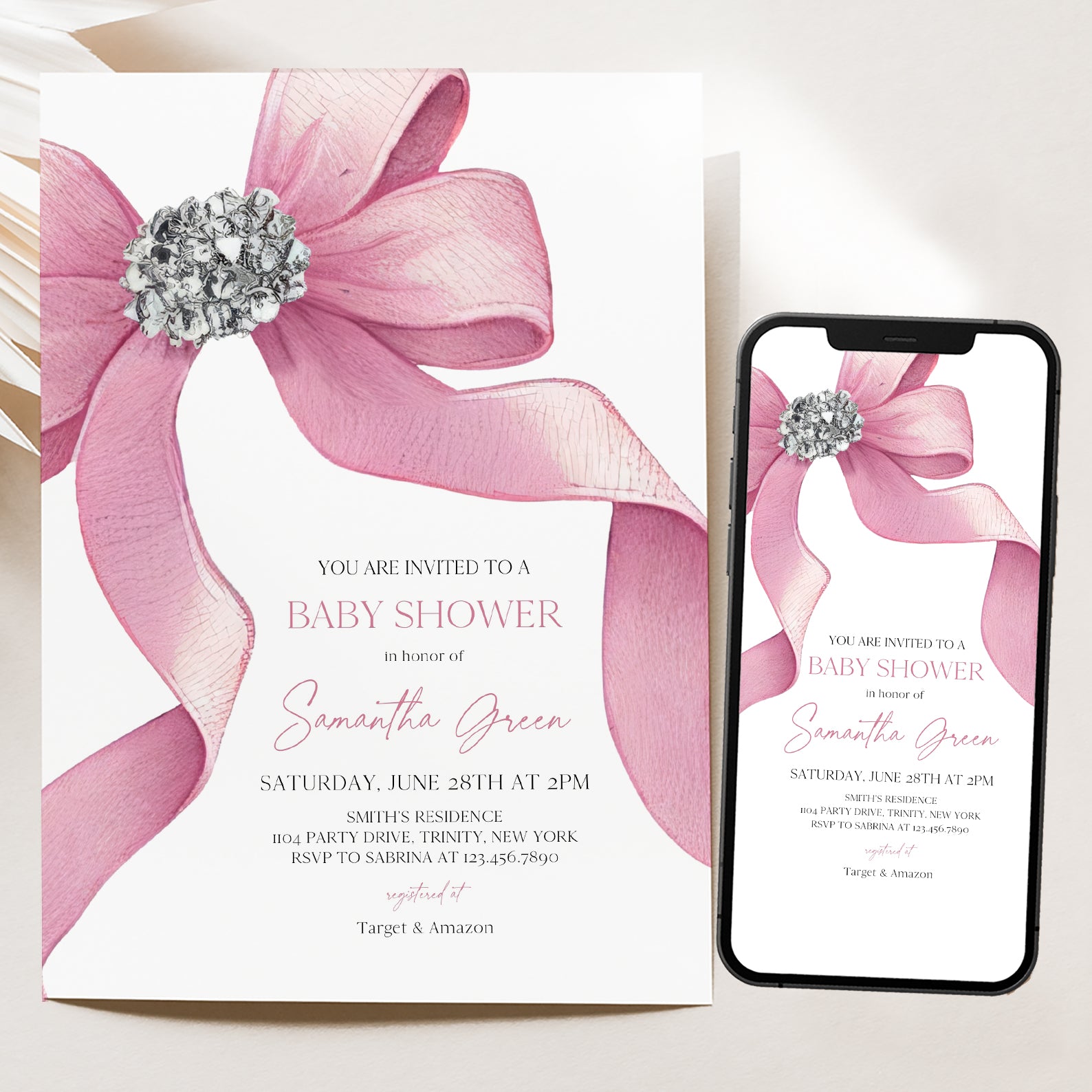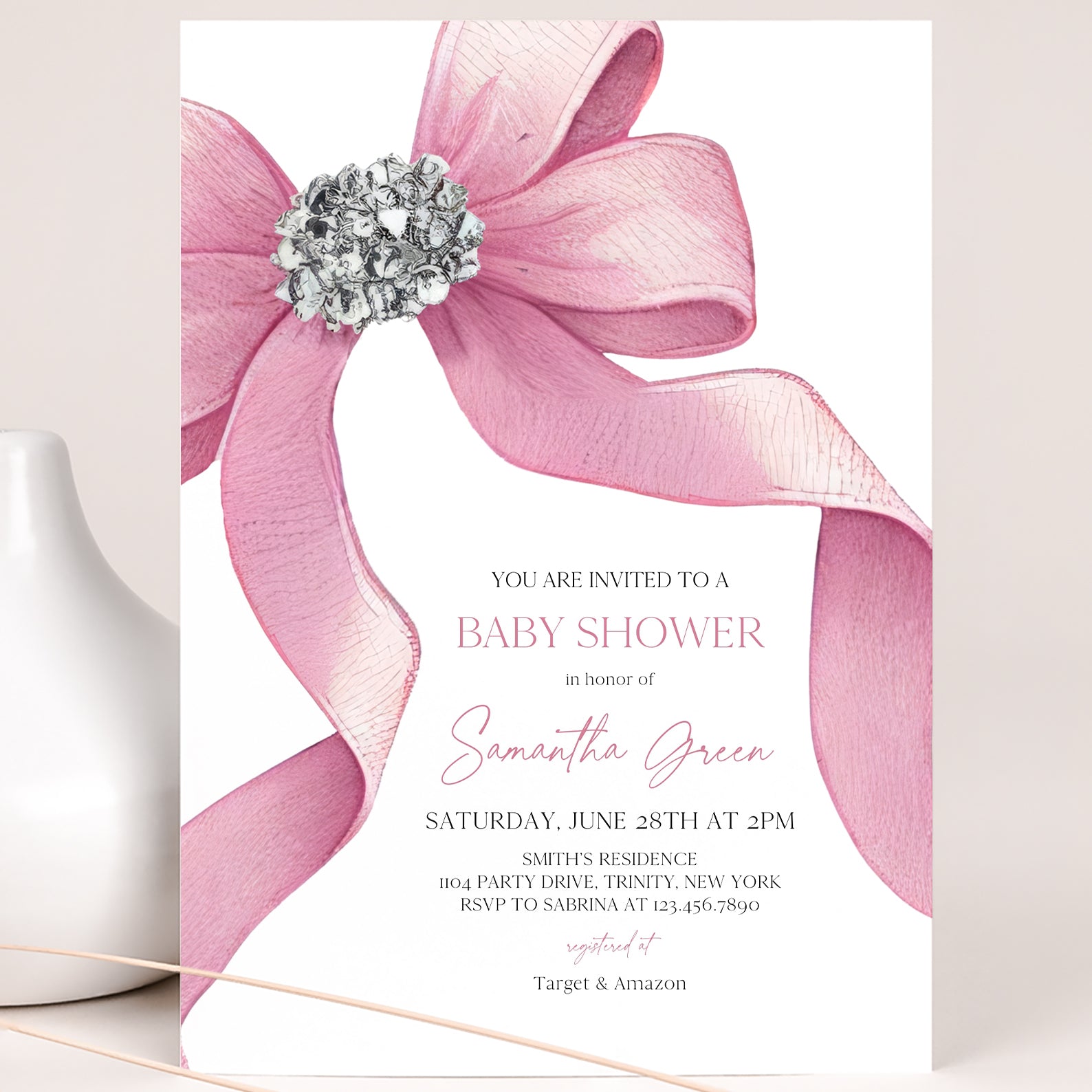 - Purchase this Evergreen Baby Shower Invitation Bundle with Pink Bow Digital Design template