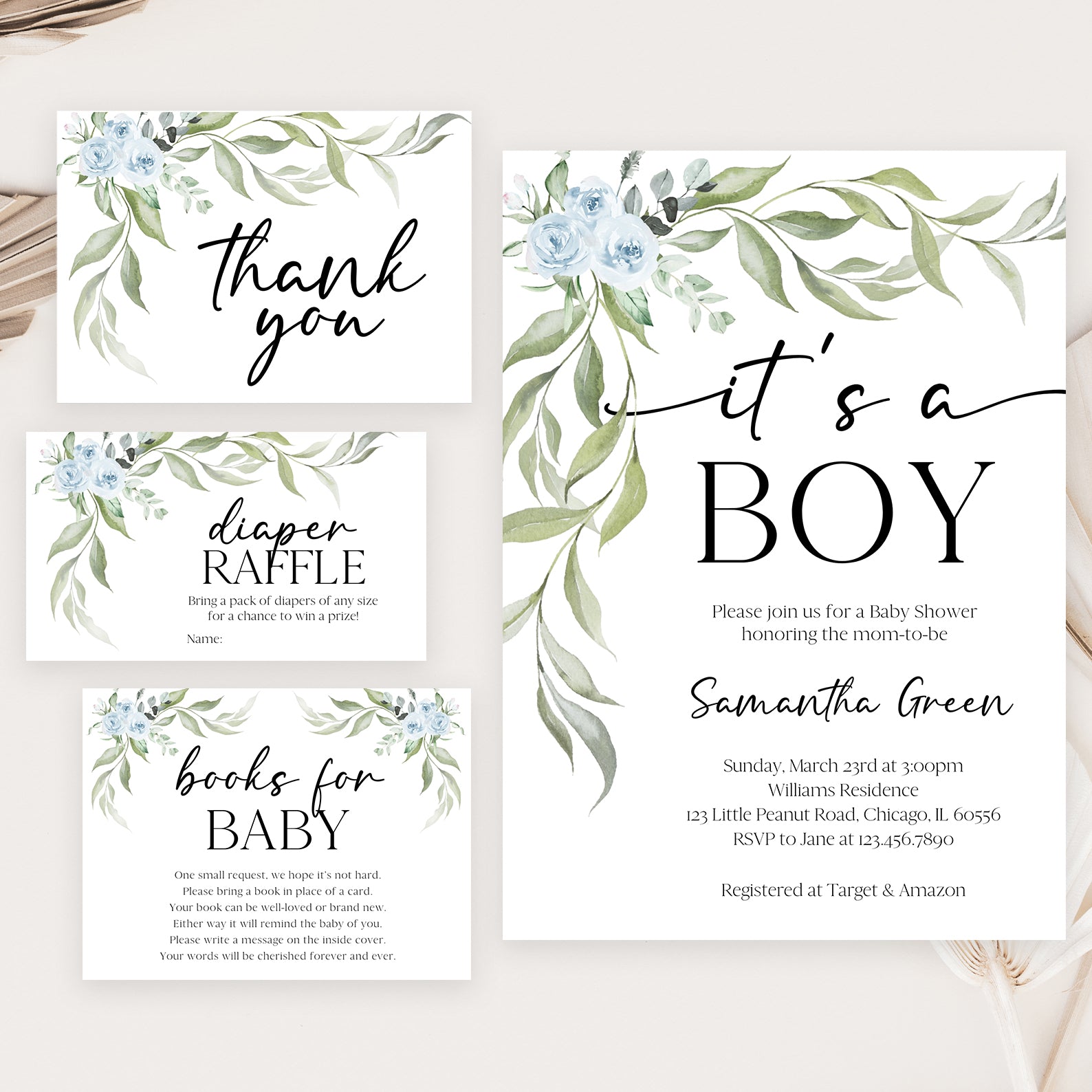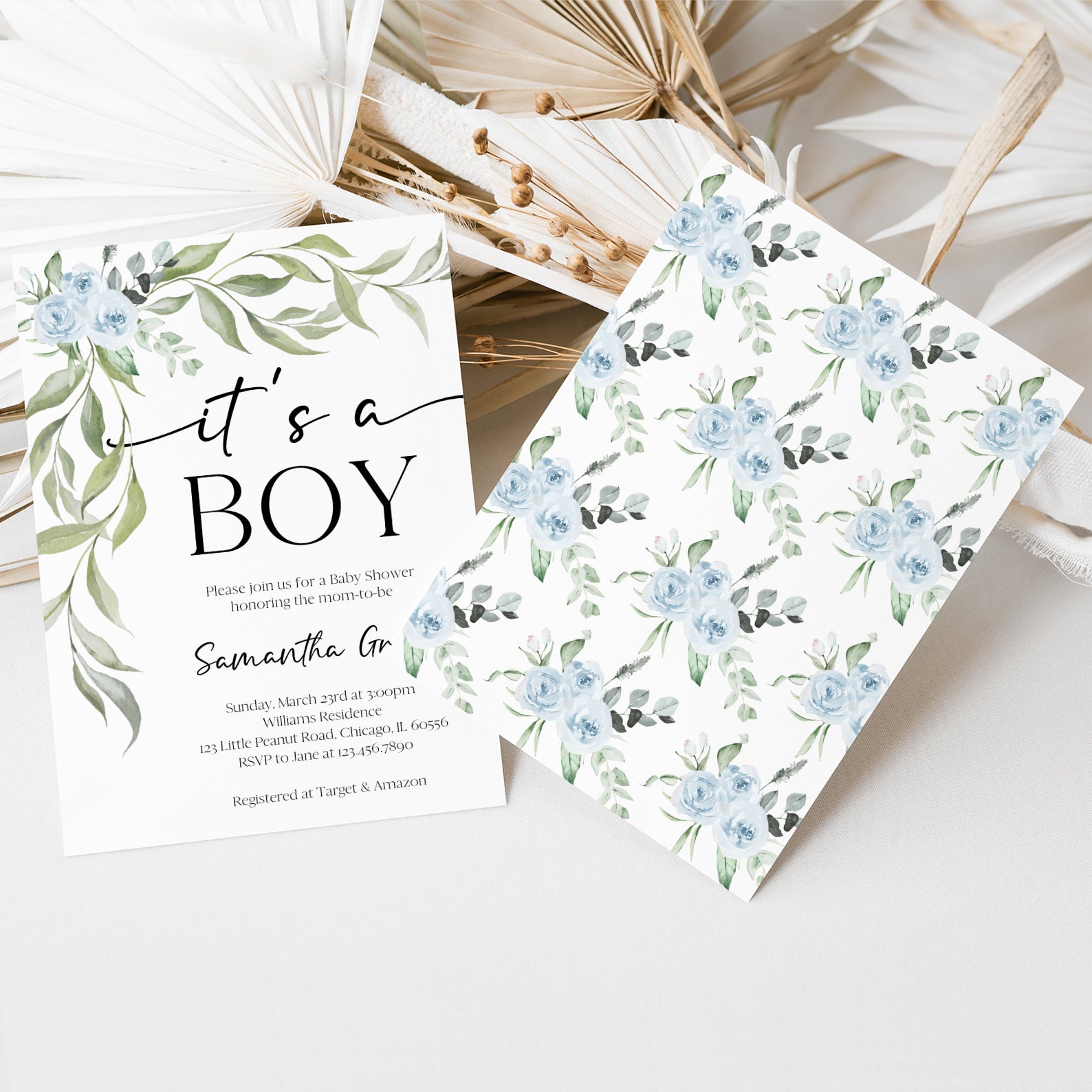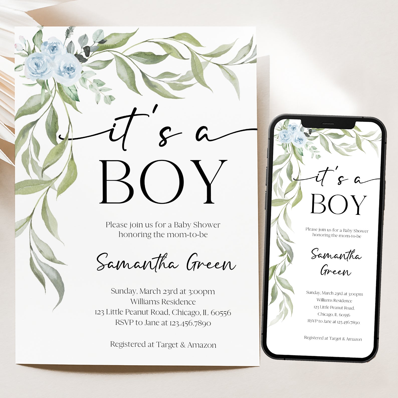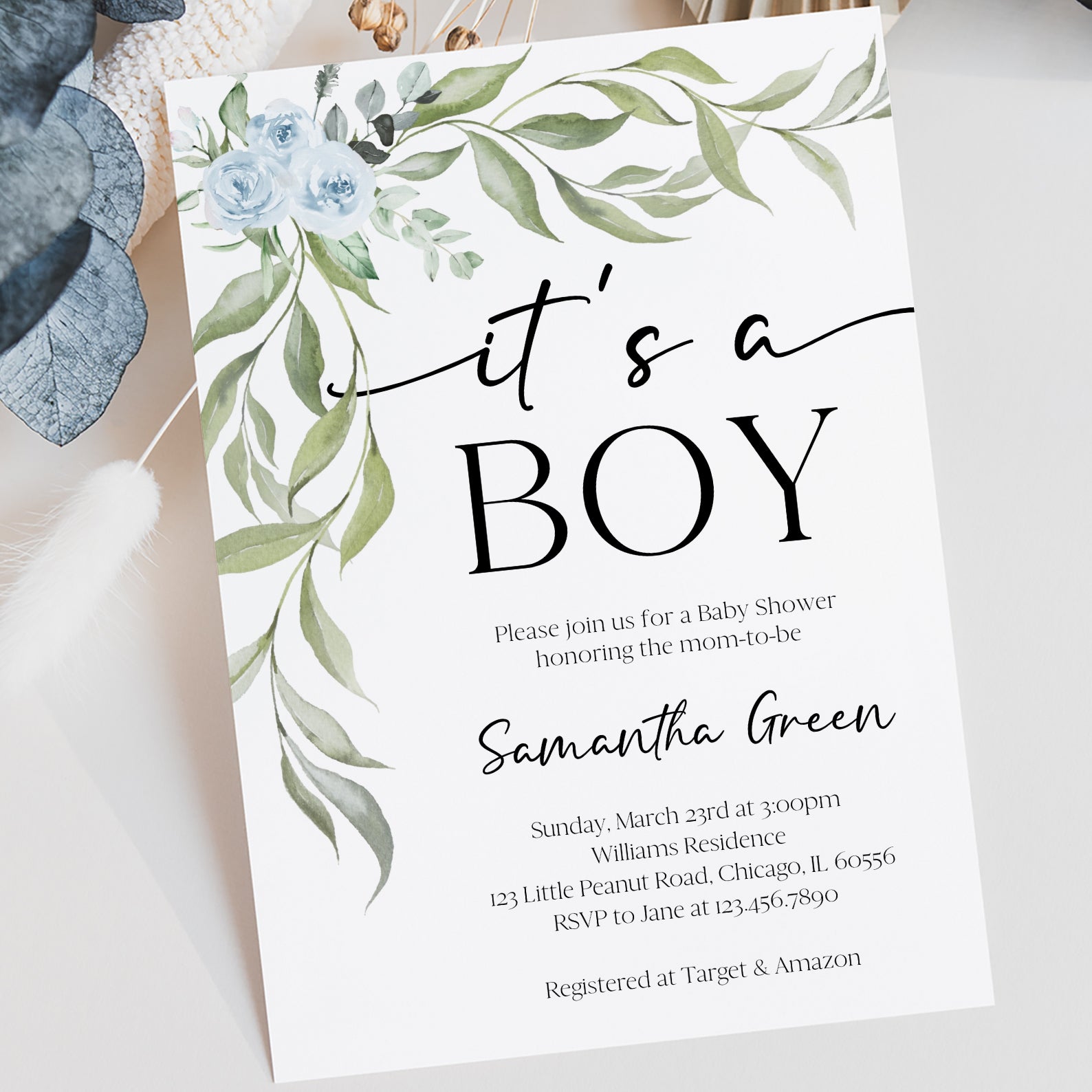 - Purchase this Minimalist Baby Shower Invite Bundle with Blue Roses & Greenery template