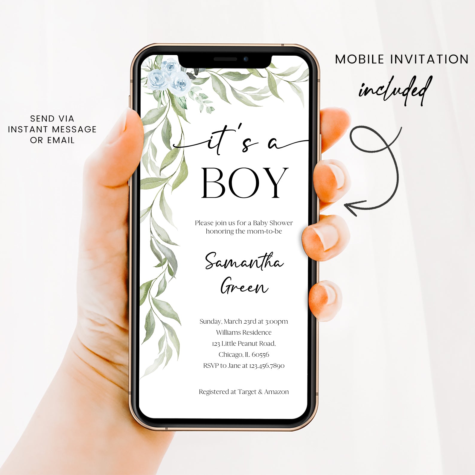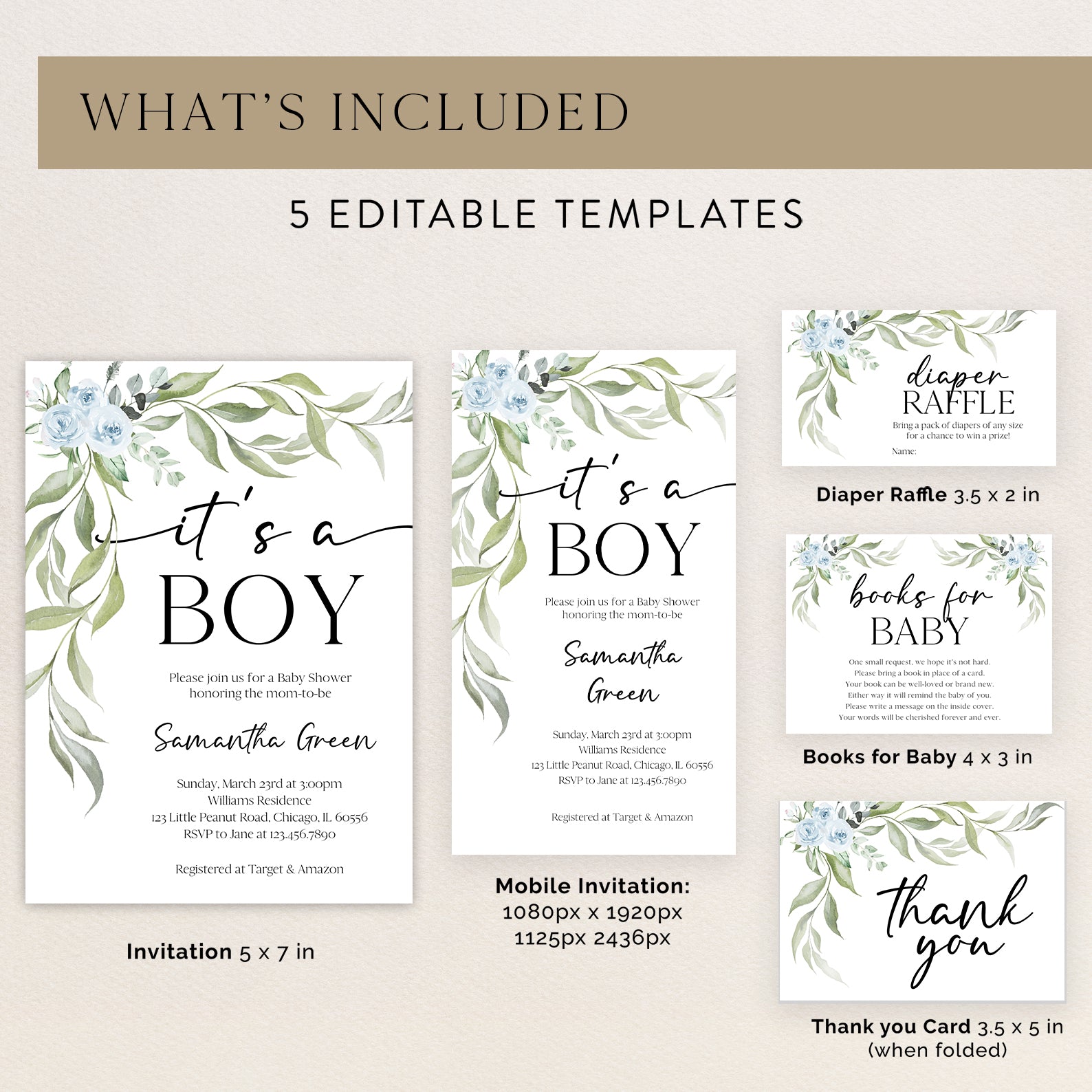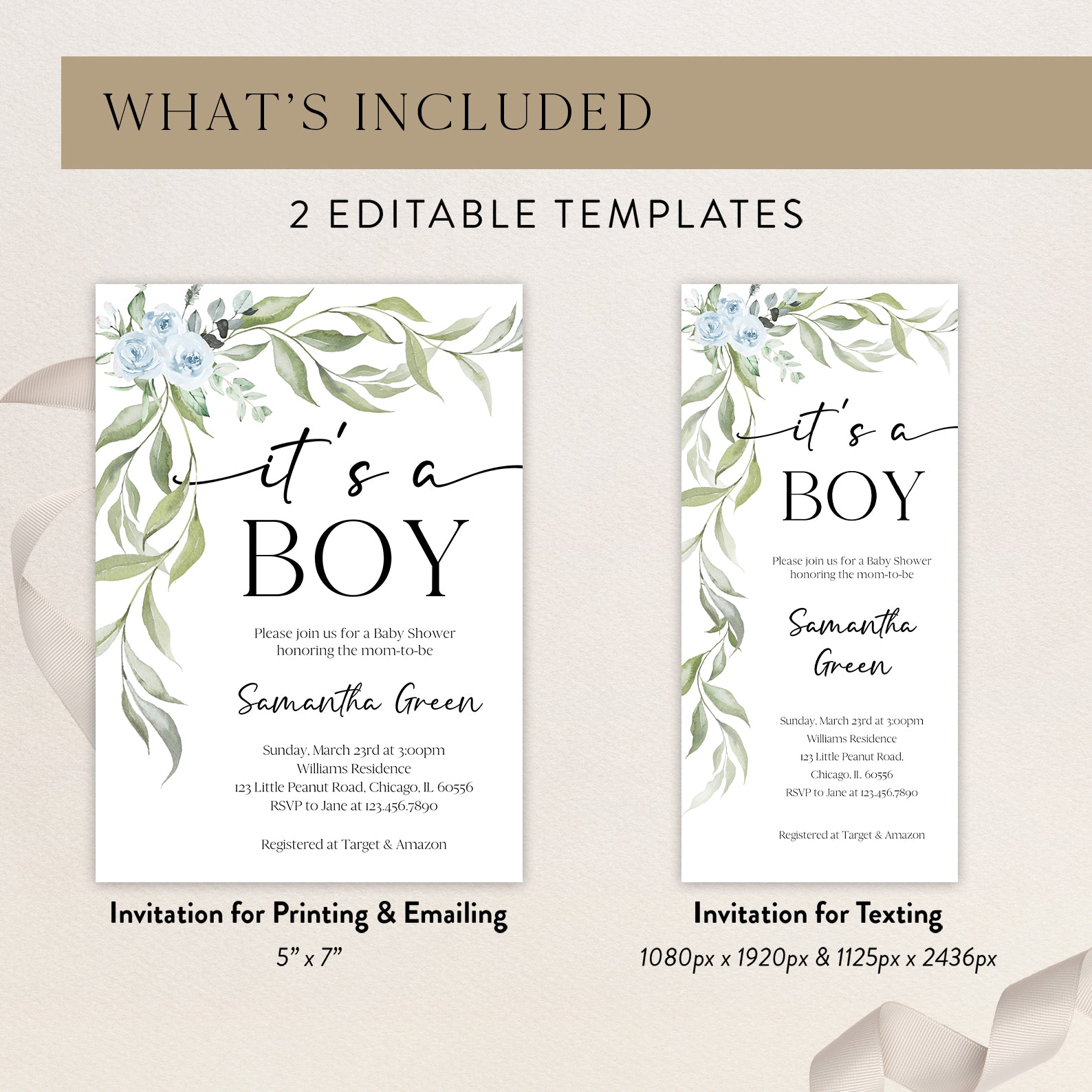 - Purchase this Minimalist Baby Shower Invite Bundle with Blue Roses & Greenery template