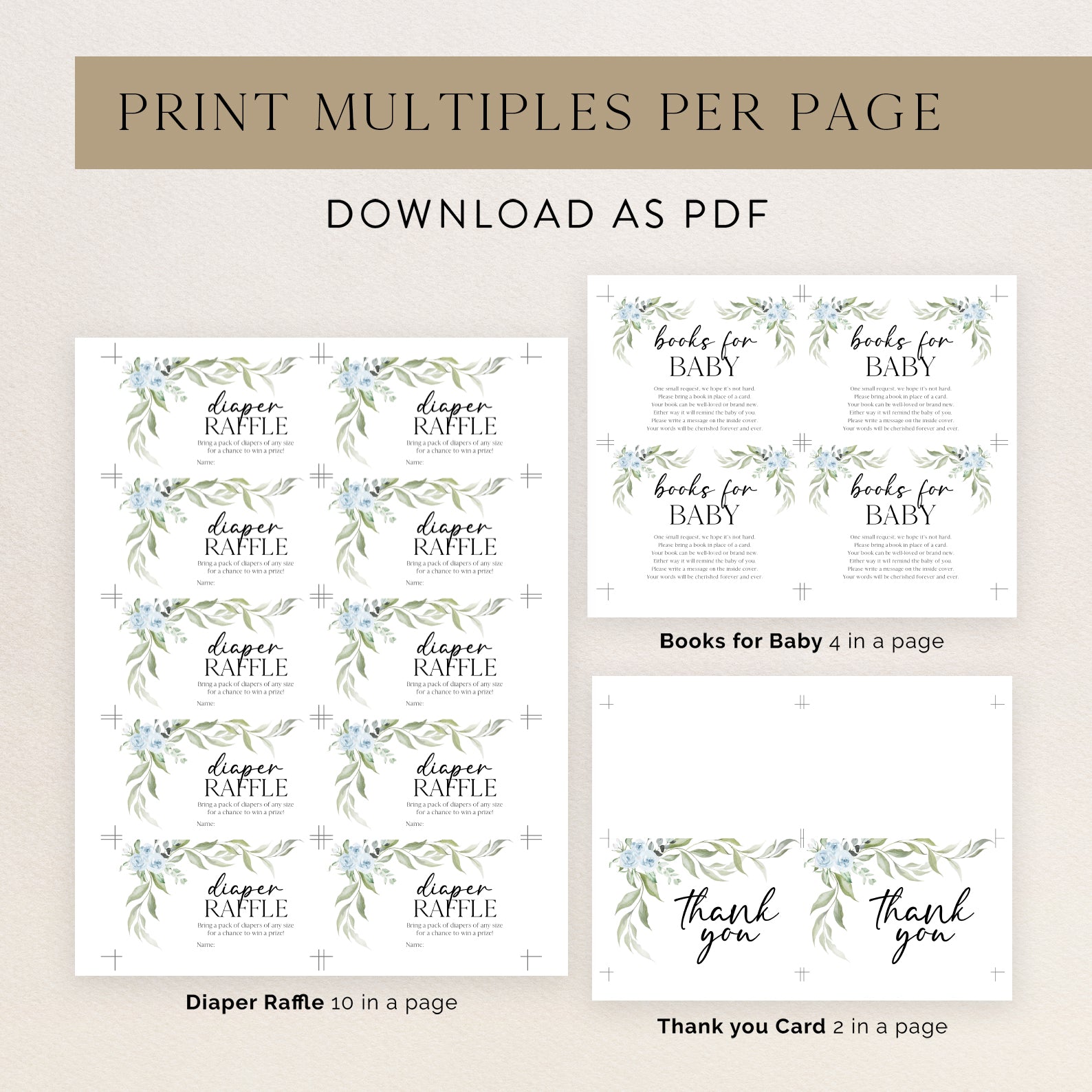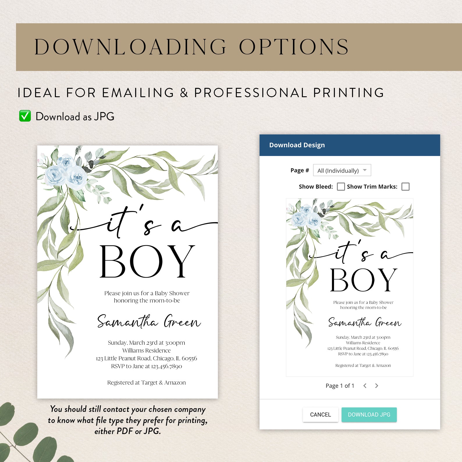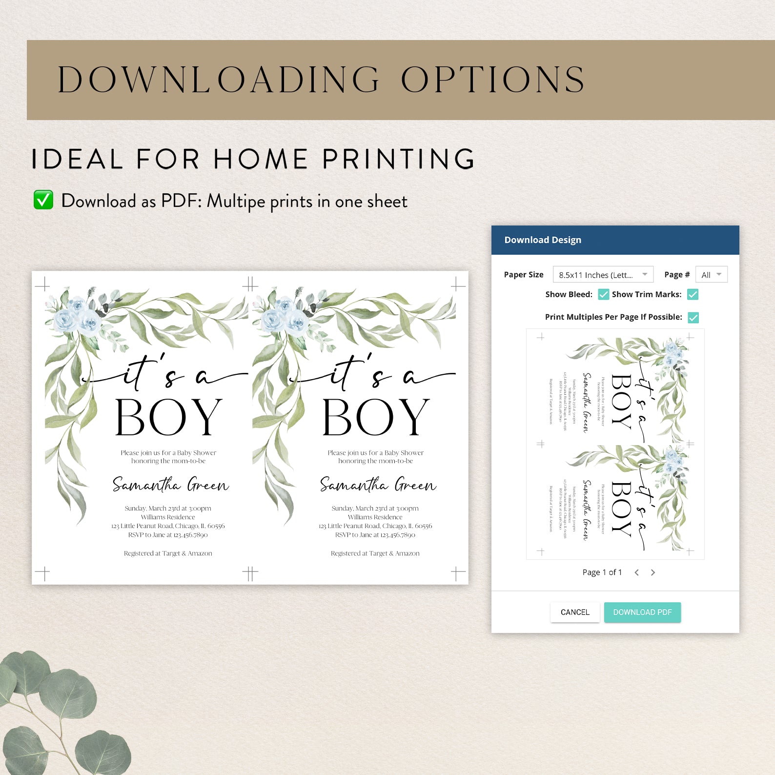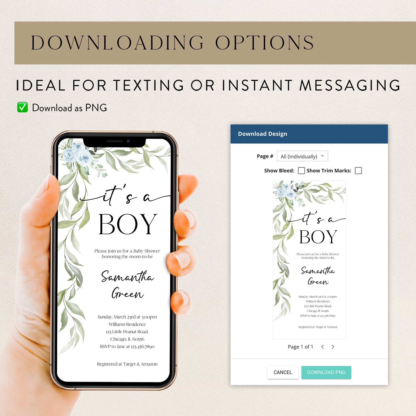 - Purchase this Minimalist Baby Shower Invite Bundle with Blue Roses & Greenery template