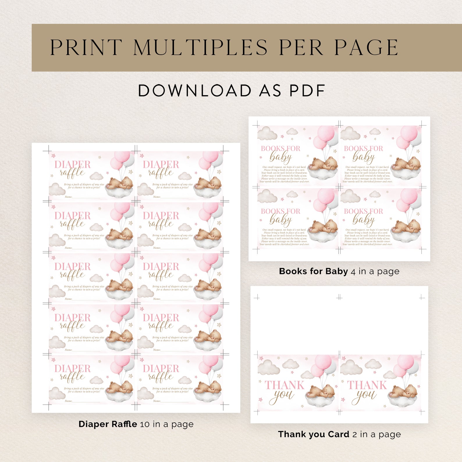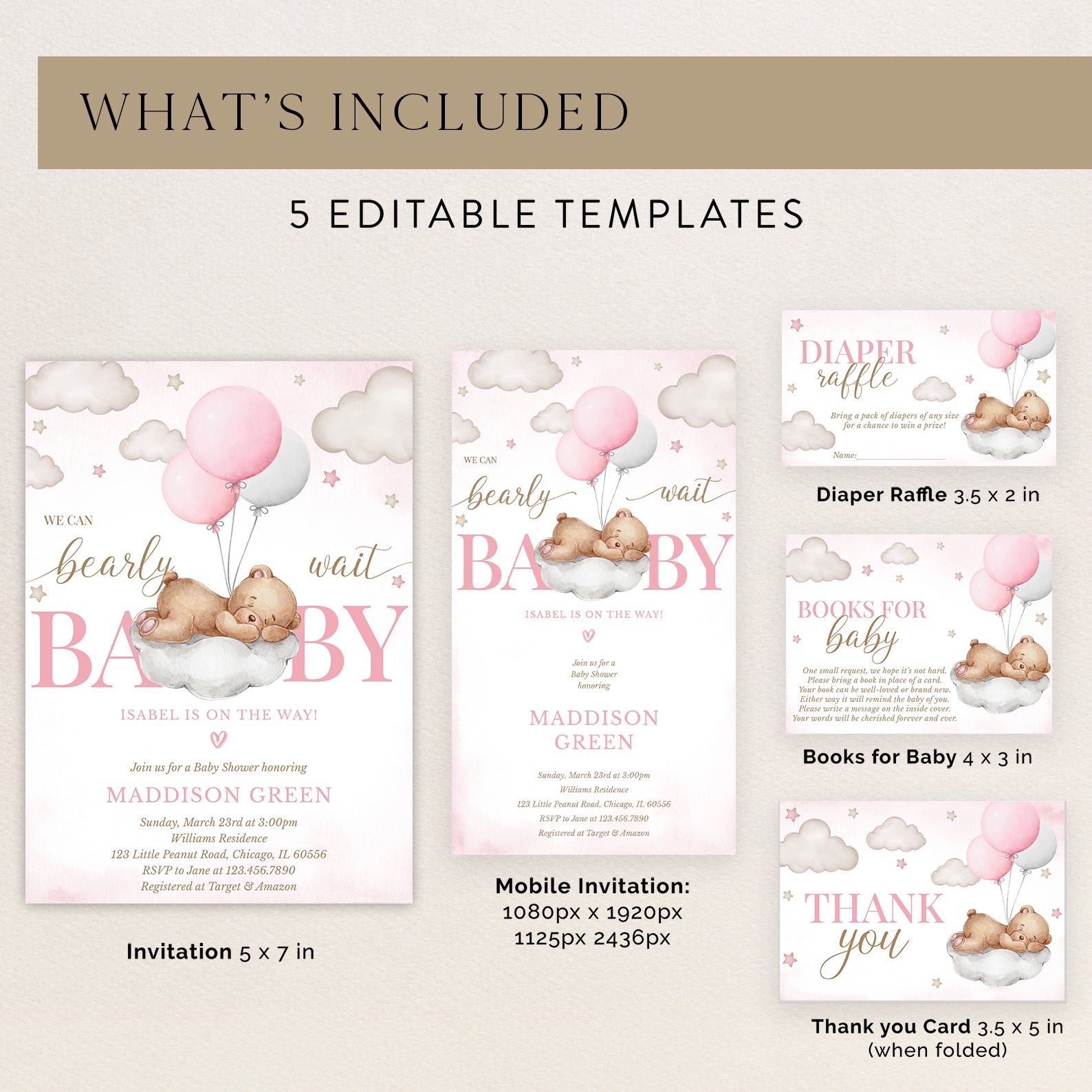 Celebrate your little one’s arrival with the "We Can Bearly Wait" Invitation Bundle! This pink-themed digital set features a cute teddy bear sleeping on a fluffy cloud, surrounded by whimsical stars and clouds. Includes invitation, mobile invitation, diaper raffle, books for baby, and thank you card. Easy to customize and share, this charming bundle sets a magical tone for your baby shower and ensures friends and family feel the excitement of your special day.
