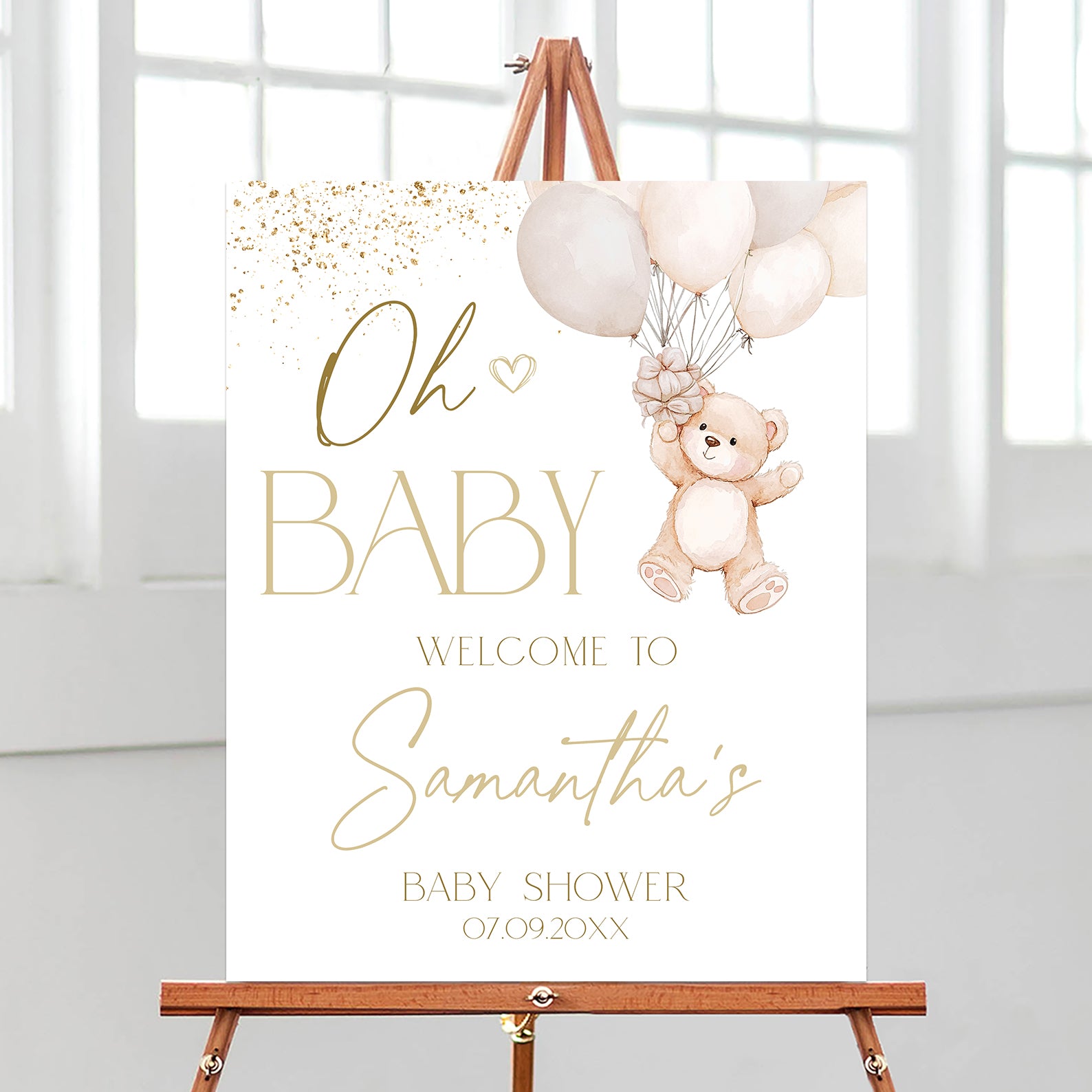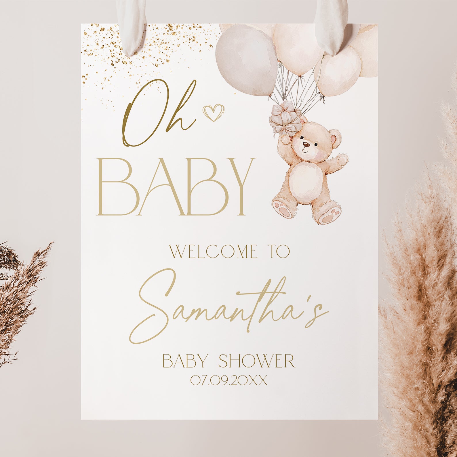 - Purchase this Baby Shower Digital Welcome Sign with Bear, Balloons & Gold Accents template