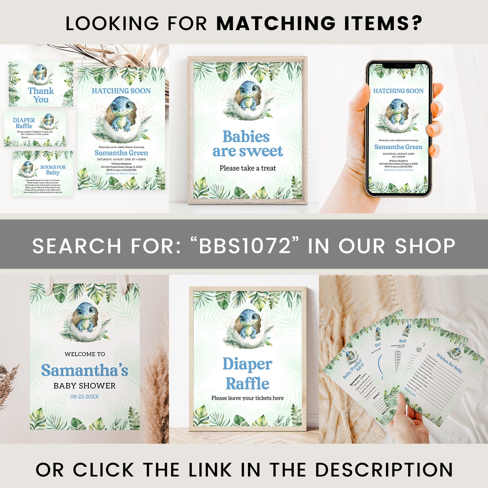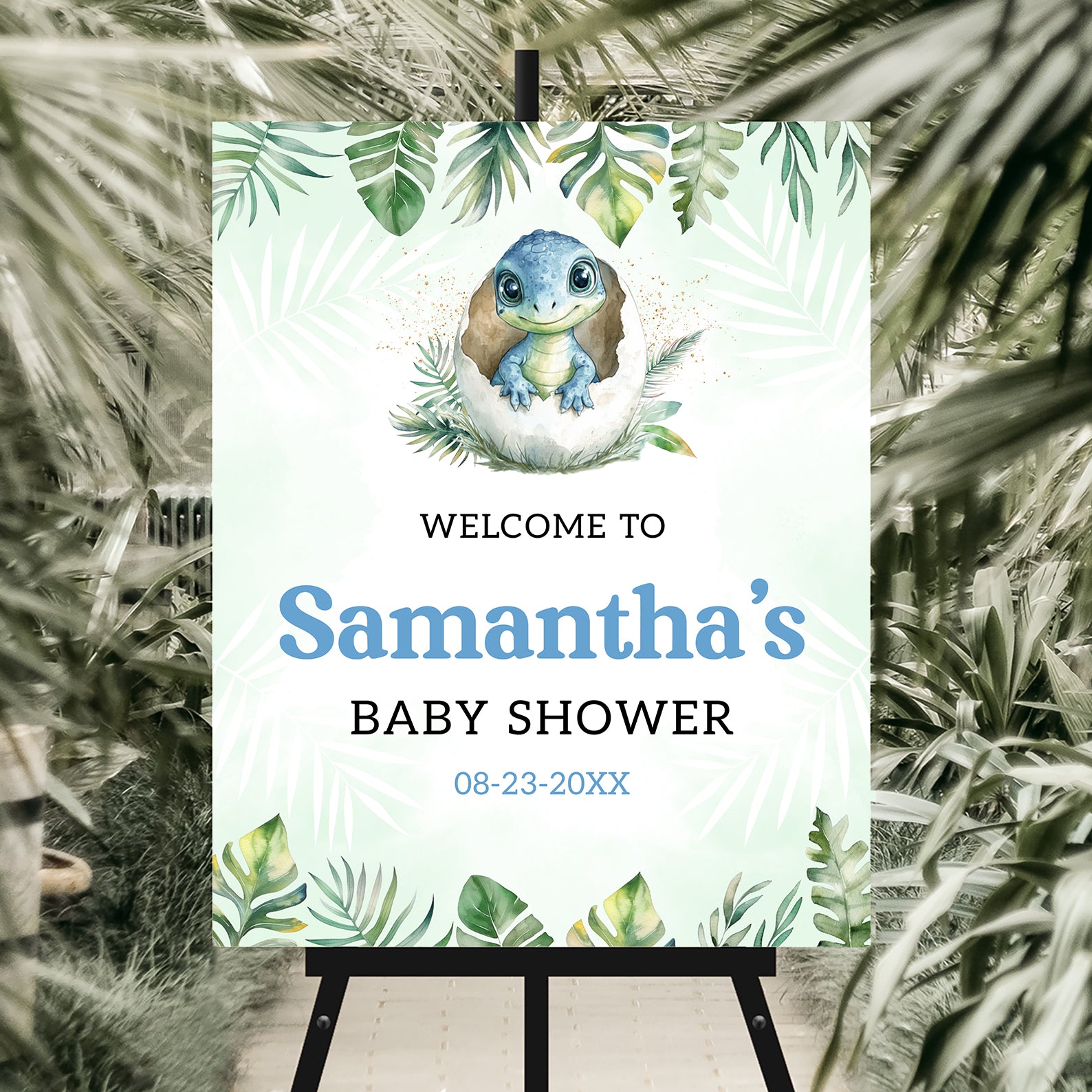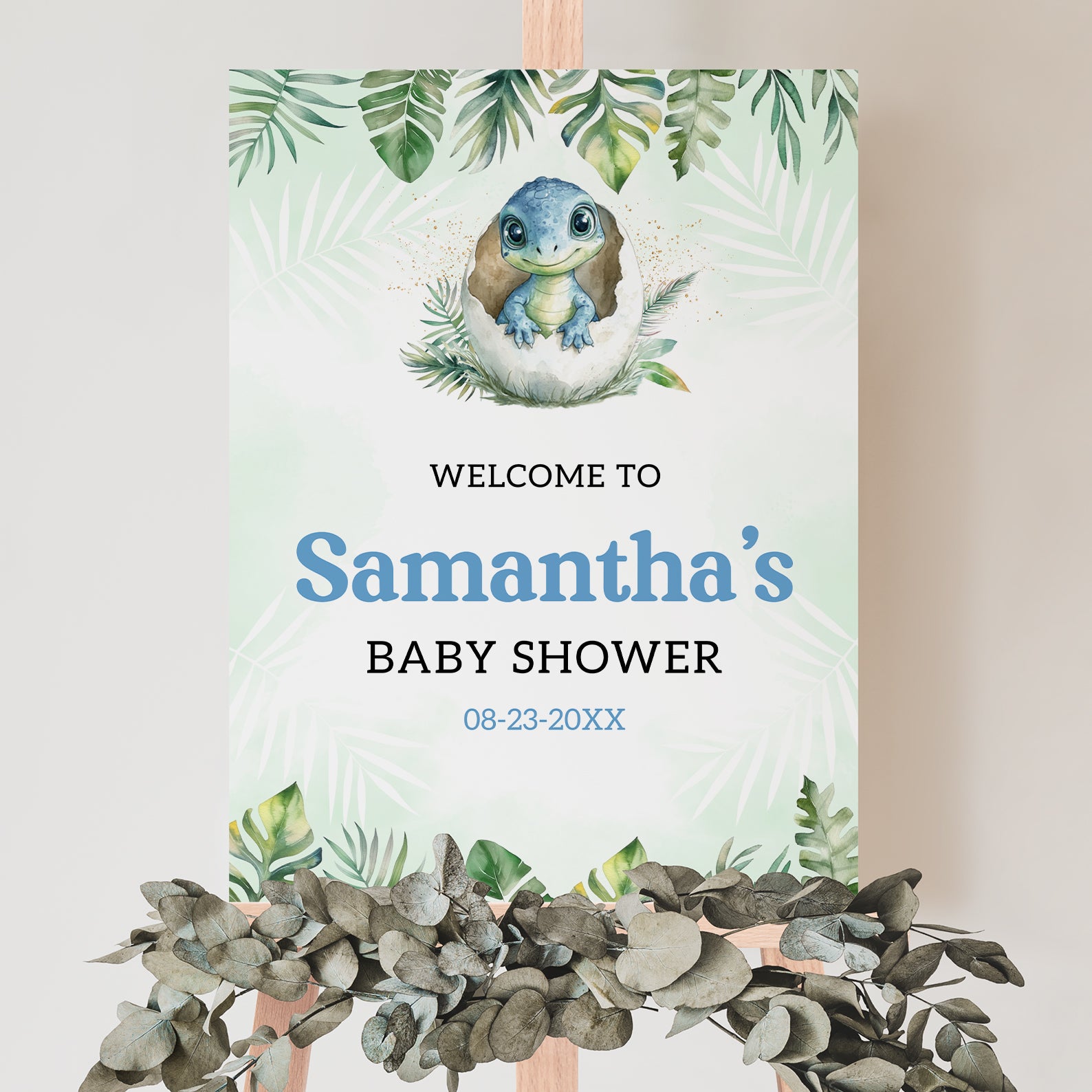 - Purchase this Hatching Soon Baby Shower Welcome Sign: Blue Dino & Leaves Theme template