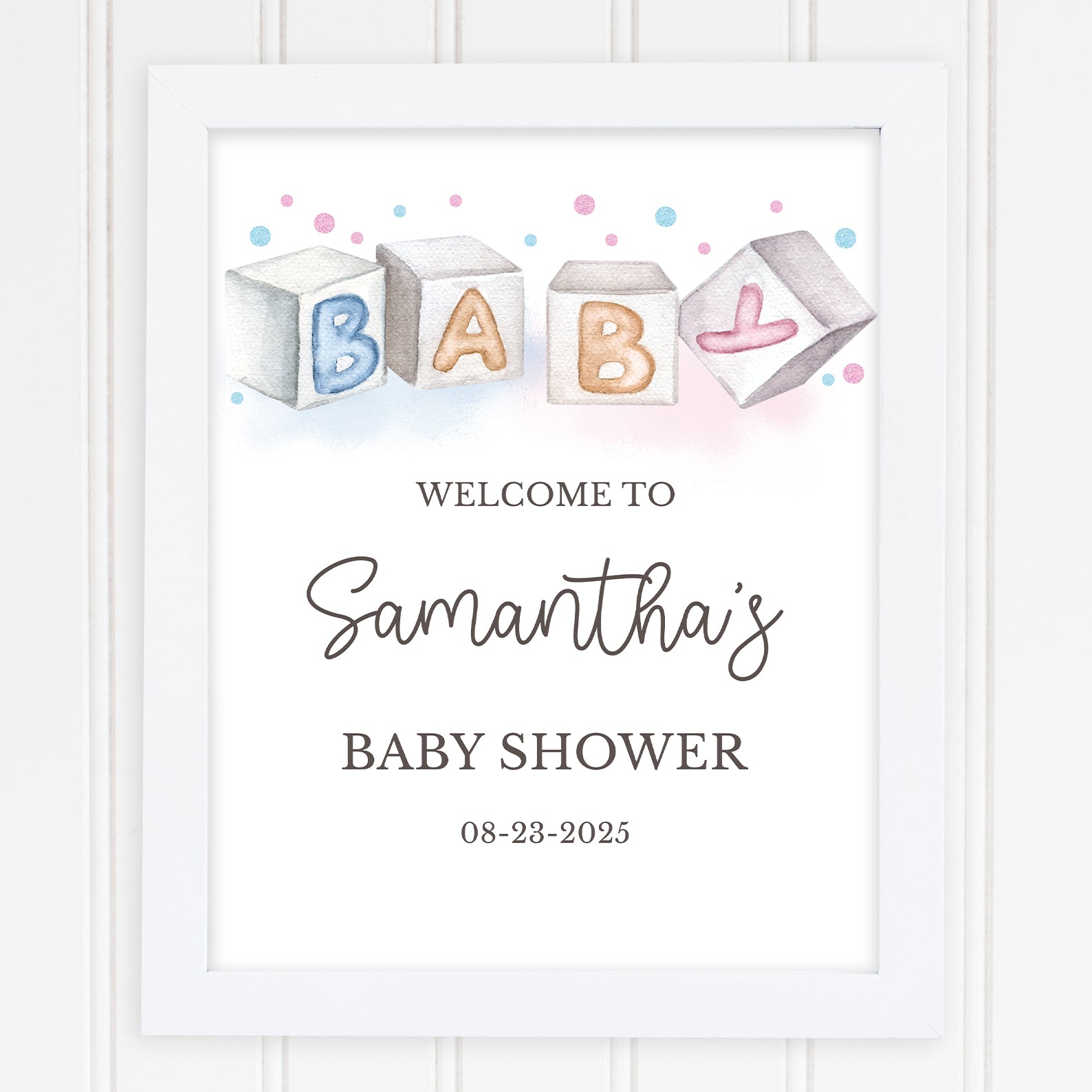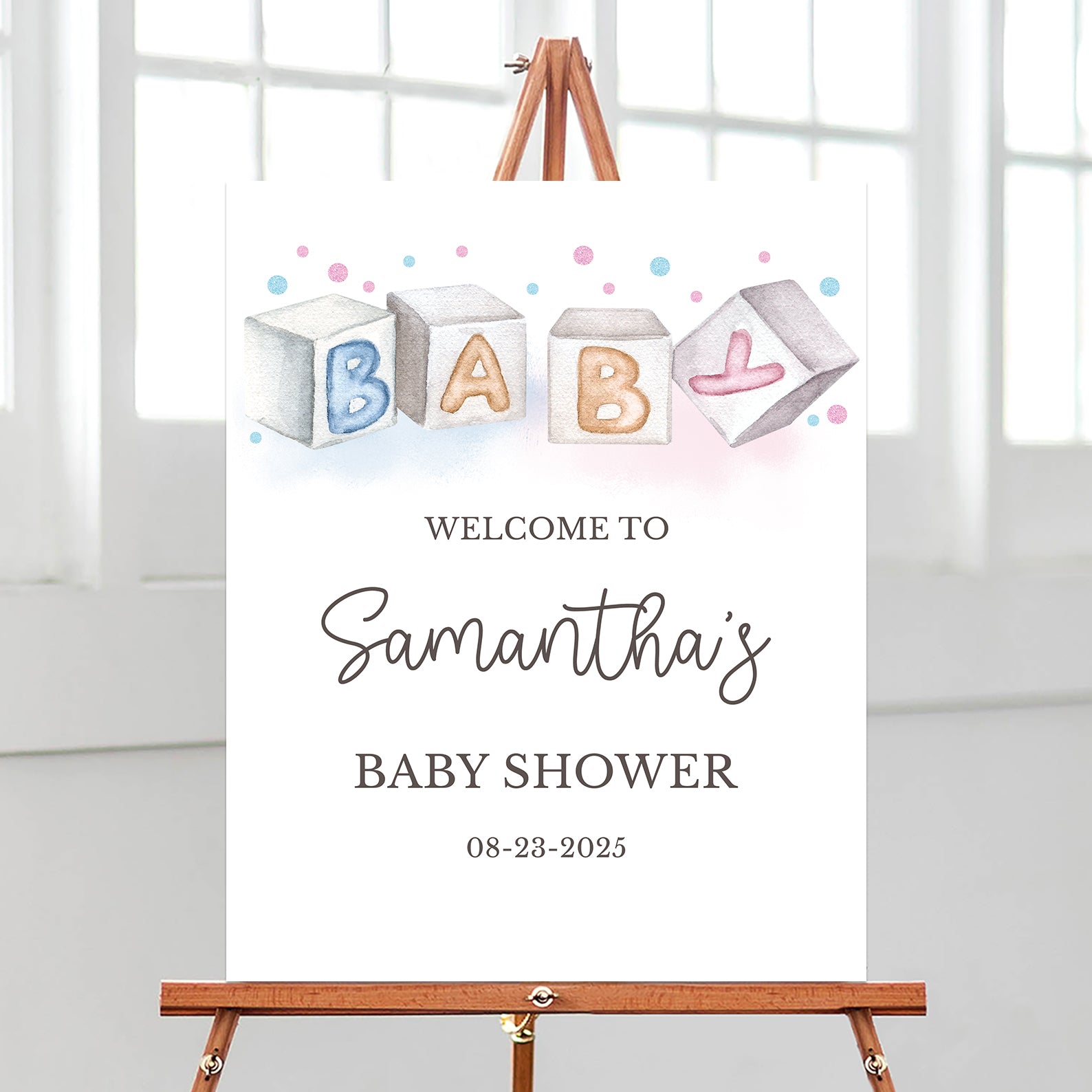 - Purchase this Minimalist Gender Reveal Welcome Sign: Baby Blocks & Bubbles template