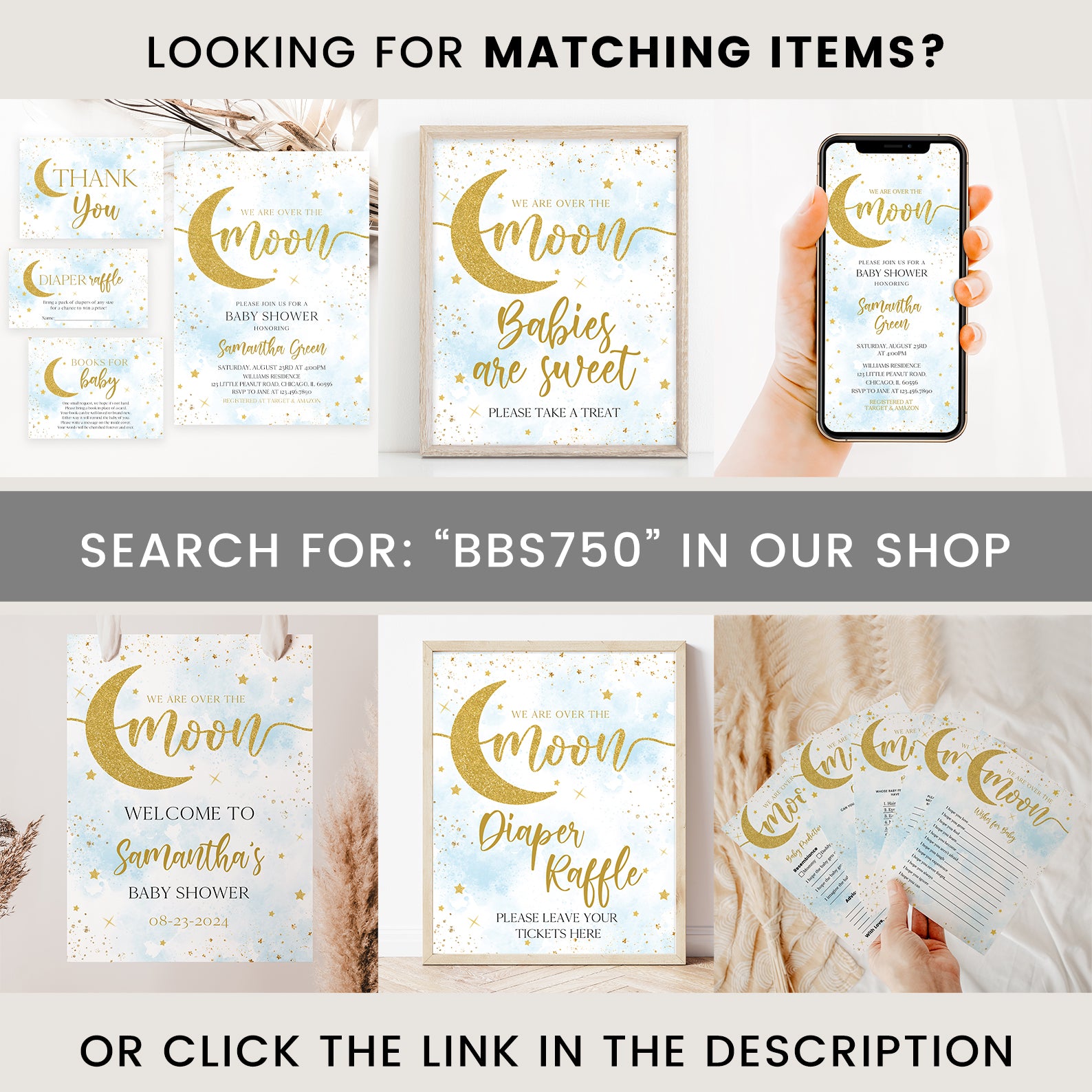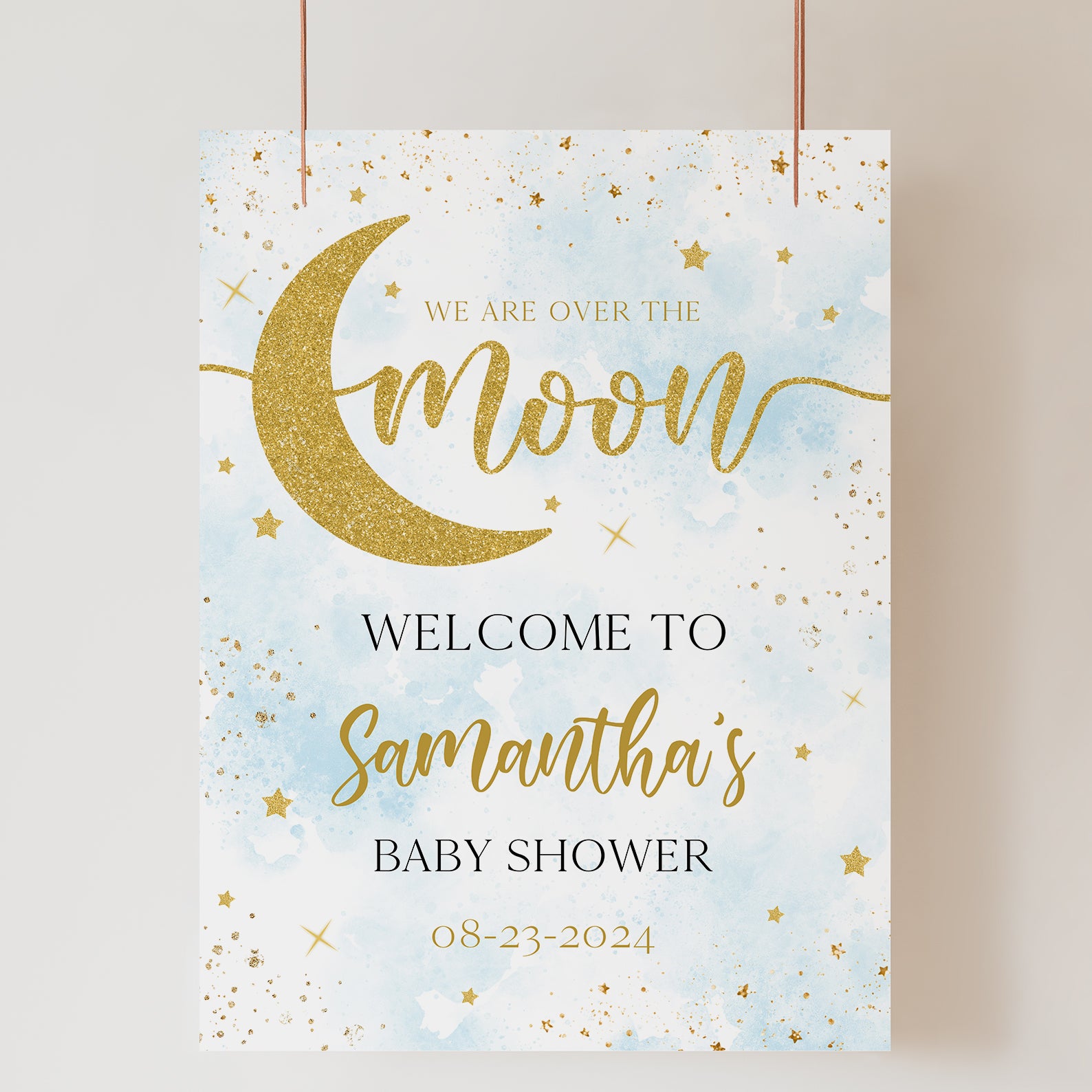 - Purchase this Over the Moon Baby Shower Blue Digital Welcome Sign: Gold Moon & Stars template