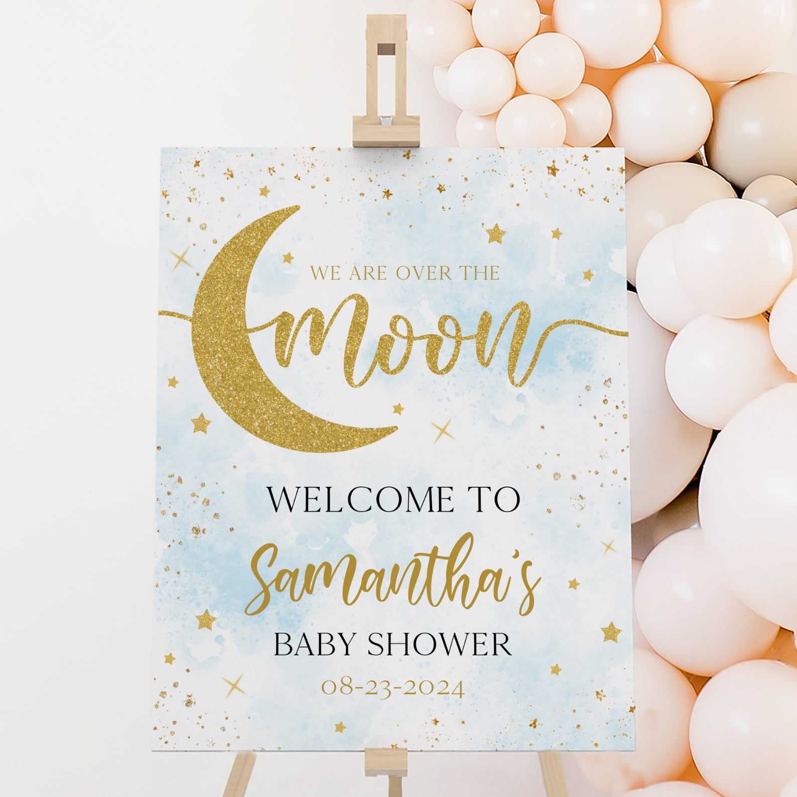 Welcome guests to your baby shower with our enchanting "Over the Moon" welcome sign! Available in soft pink or serene blue, it features a shimmering gold half moon, twinkling stars, and elegant accents—perfect for your celestial-themed celebration. Easy to personalize and display!