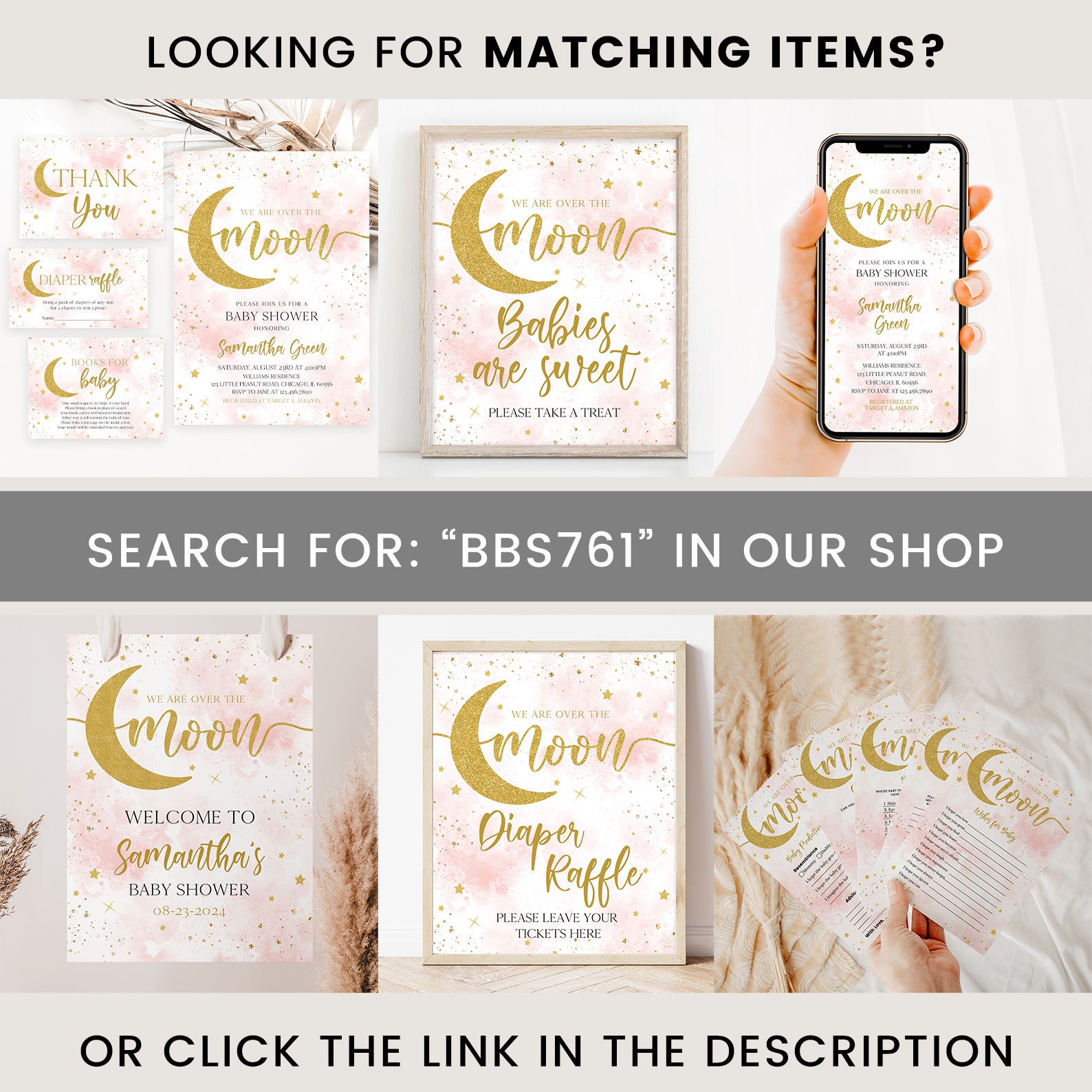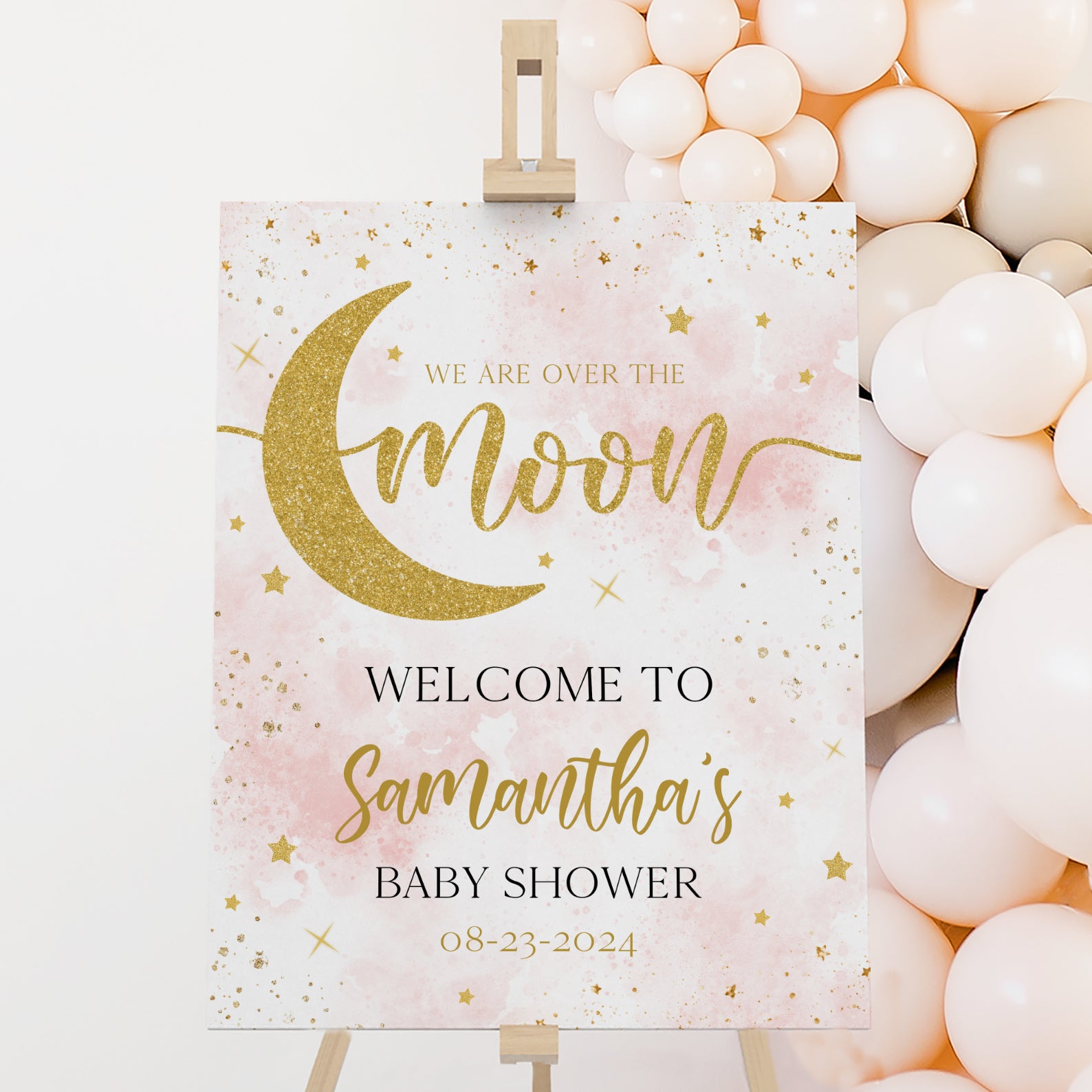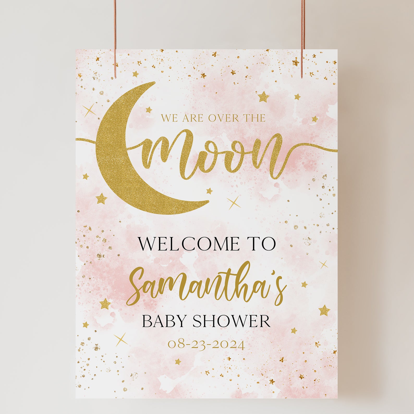 - Purchase this Over the Moon Baby Shower Pink Digital Welcome Sign: Gold Moon & Stars template