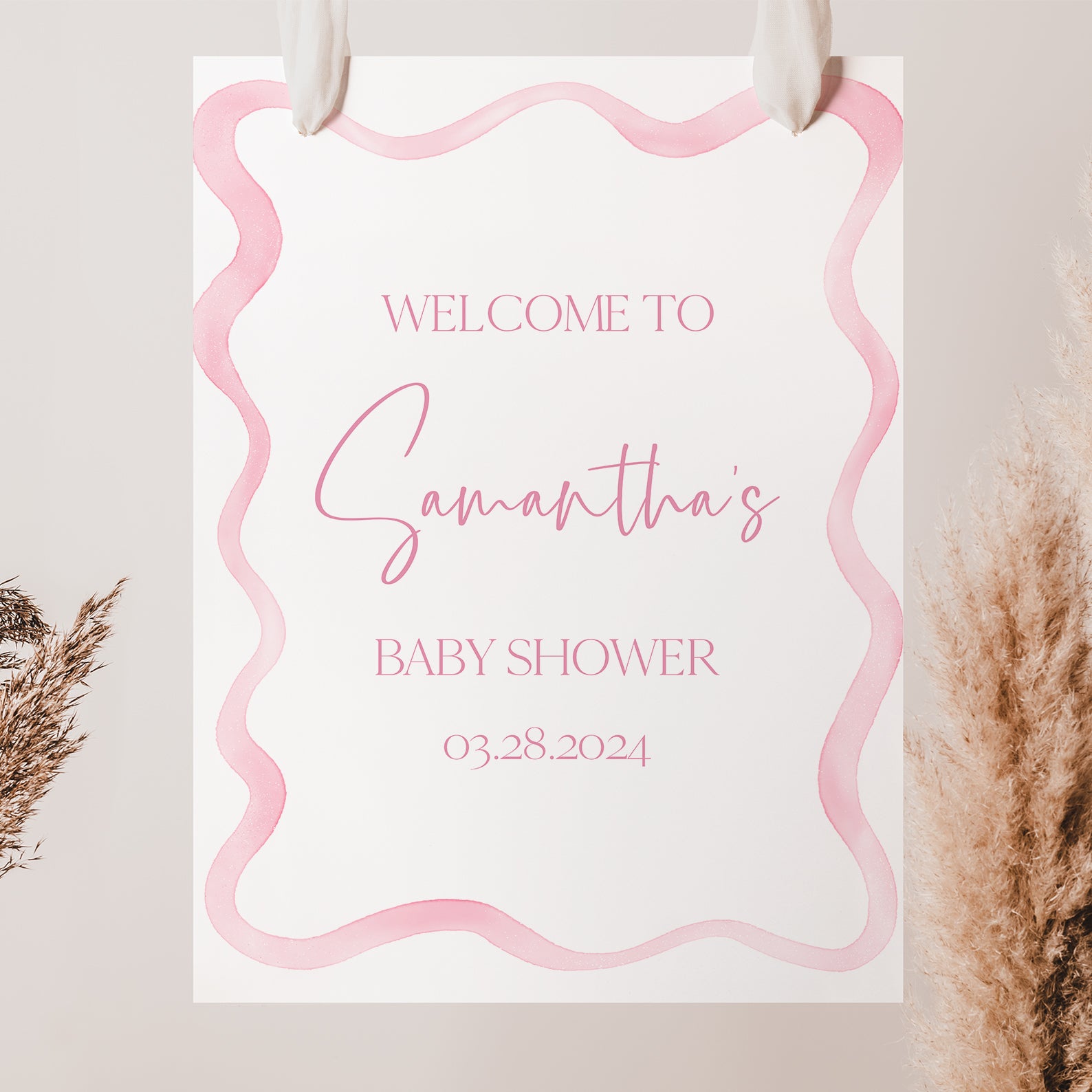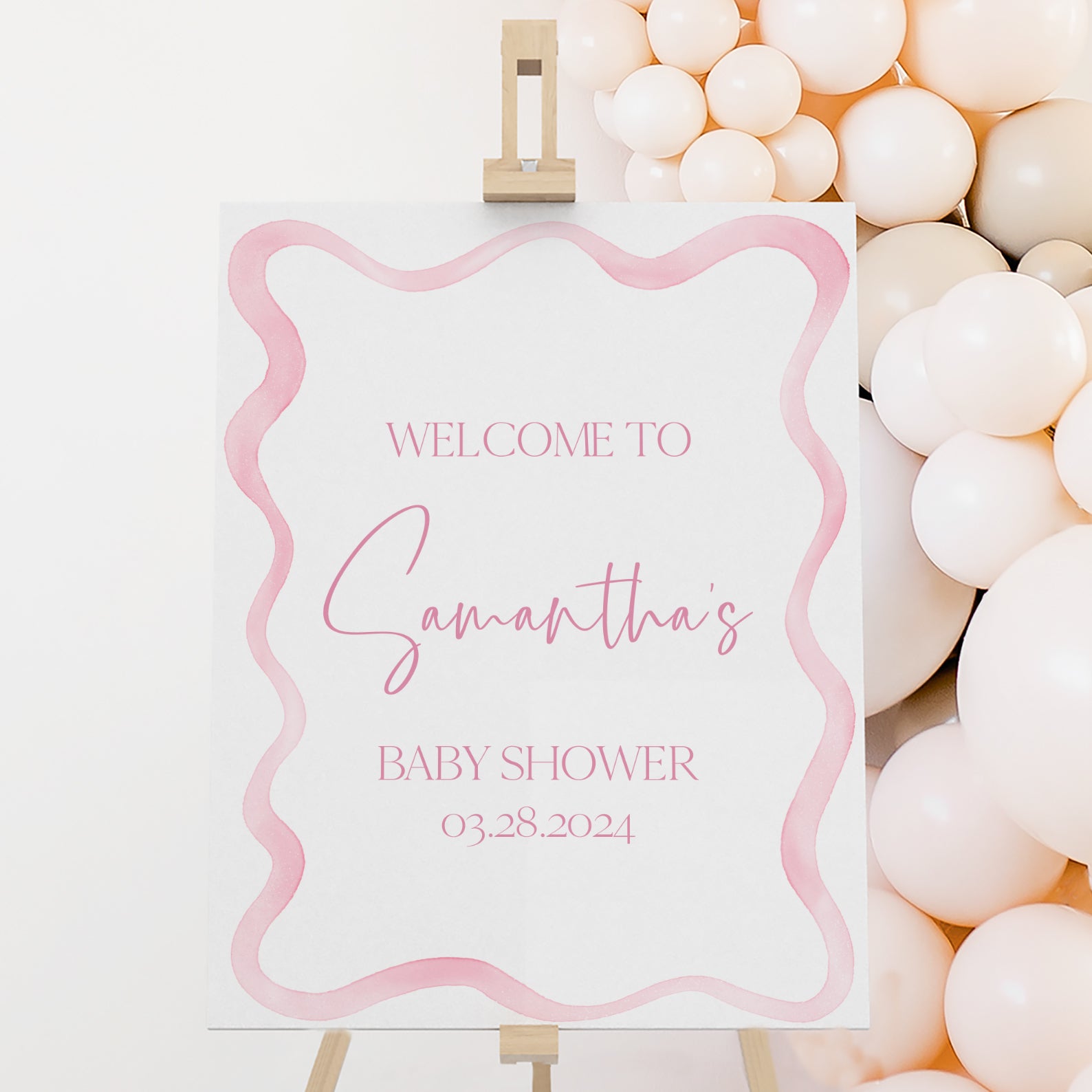 - Purchase this Pink Minimalist Wavy Border Baby Shower Digital Welcome Sign template