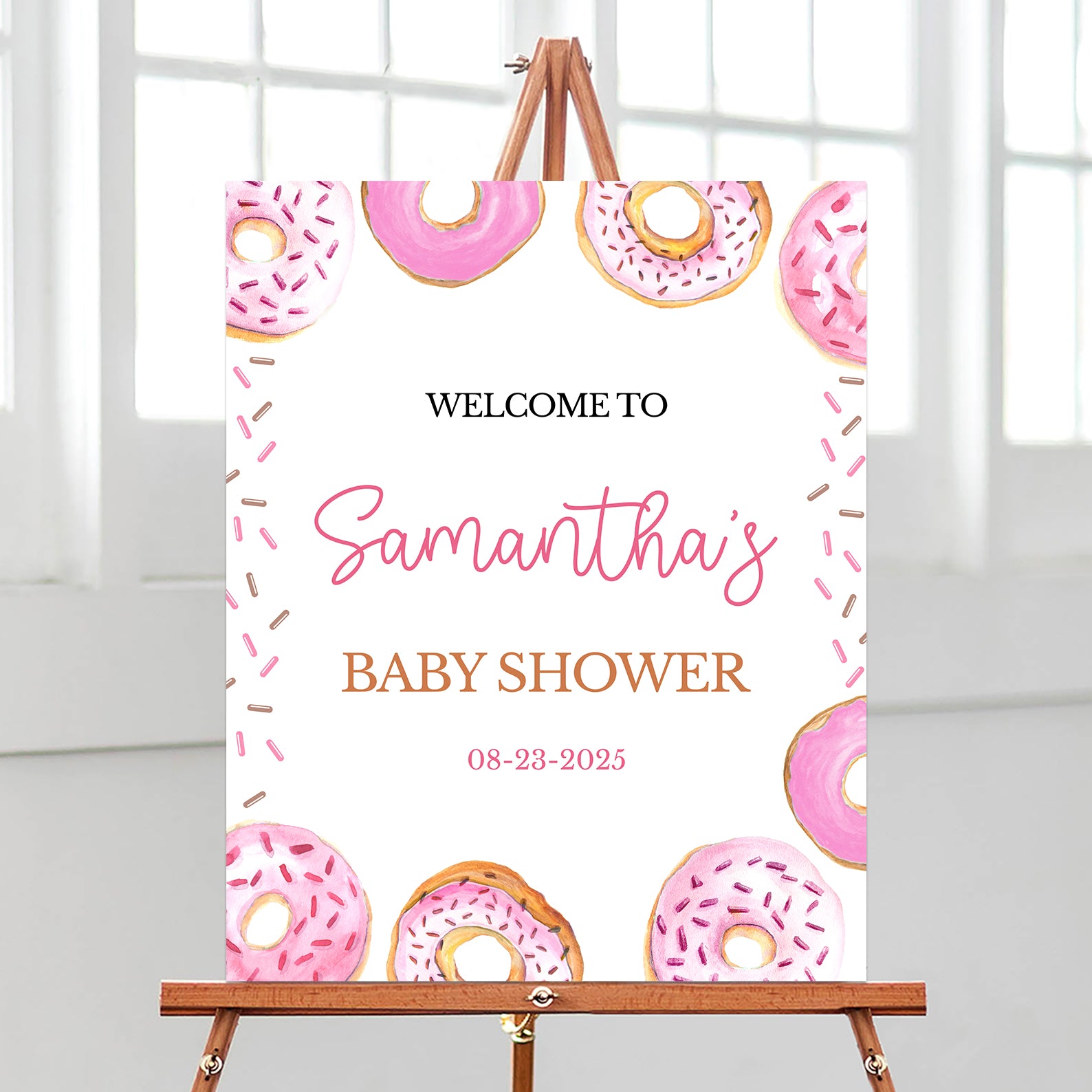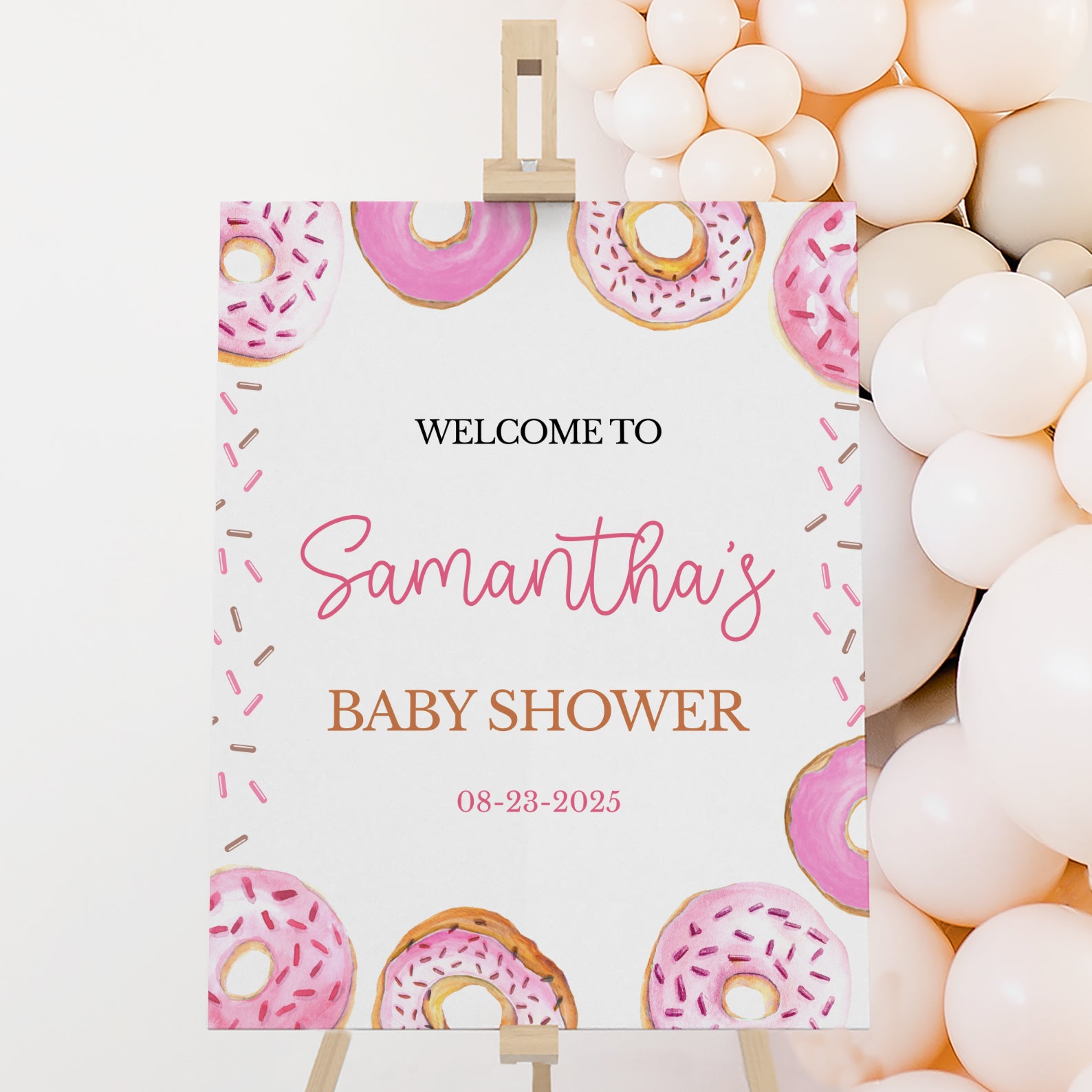 Celebrate your special day with this adorable baby shower welcome sign, available in your choice of blue or pink. Featuring a playful donut border with sprinkles, it adds a sweet touch to your decor and creates a warm, inviting atmosphere for your guests.