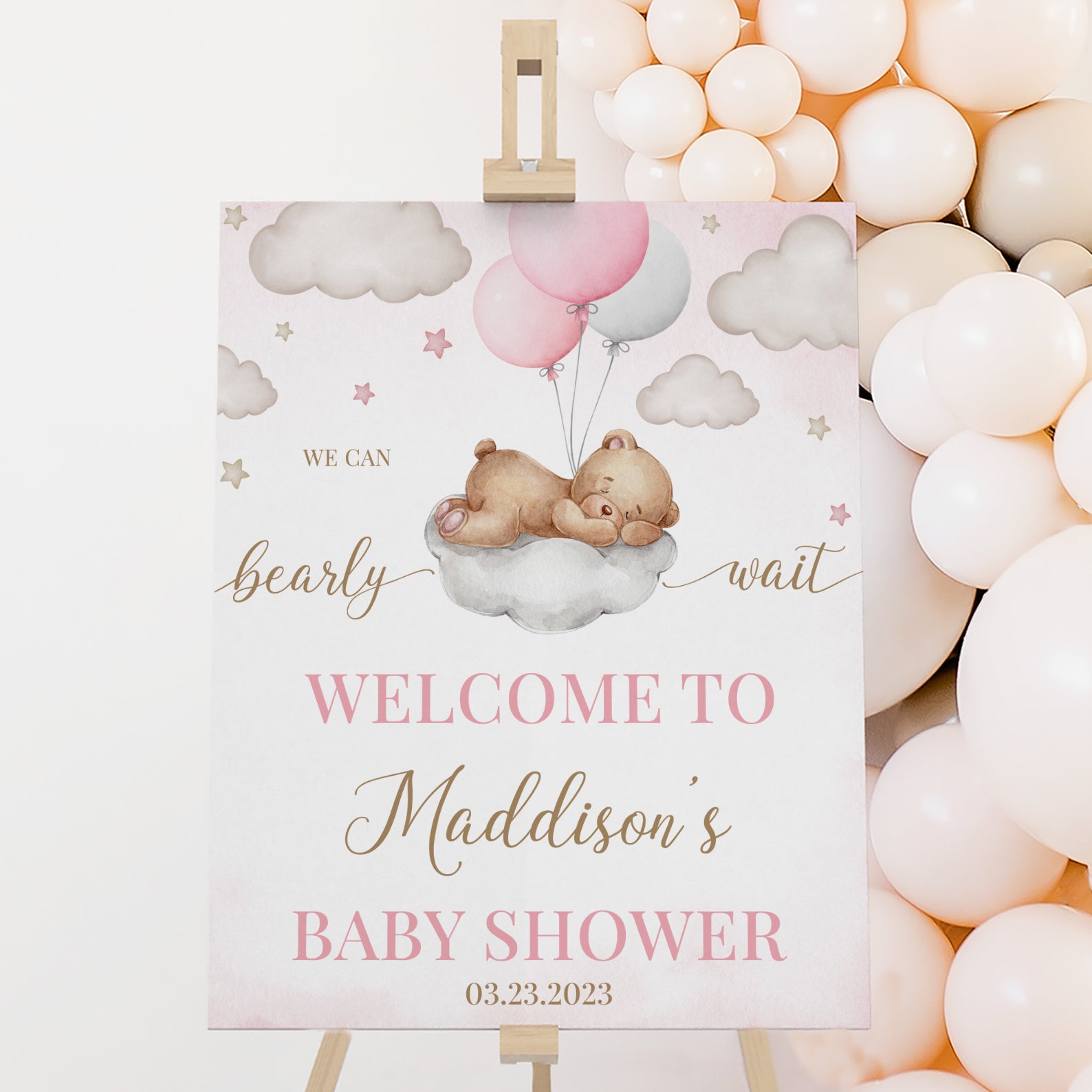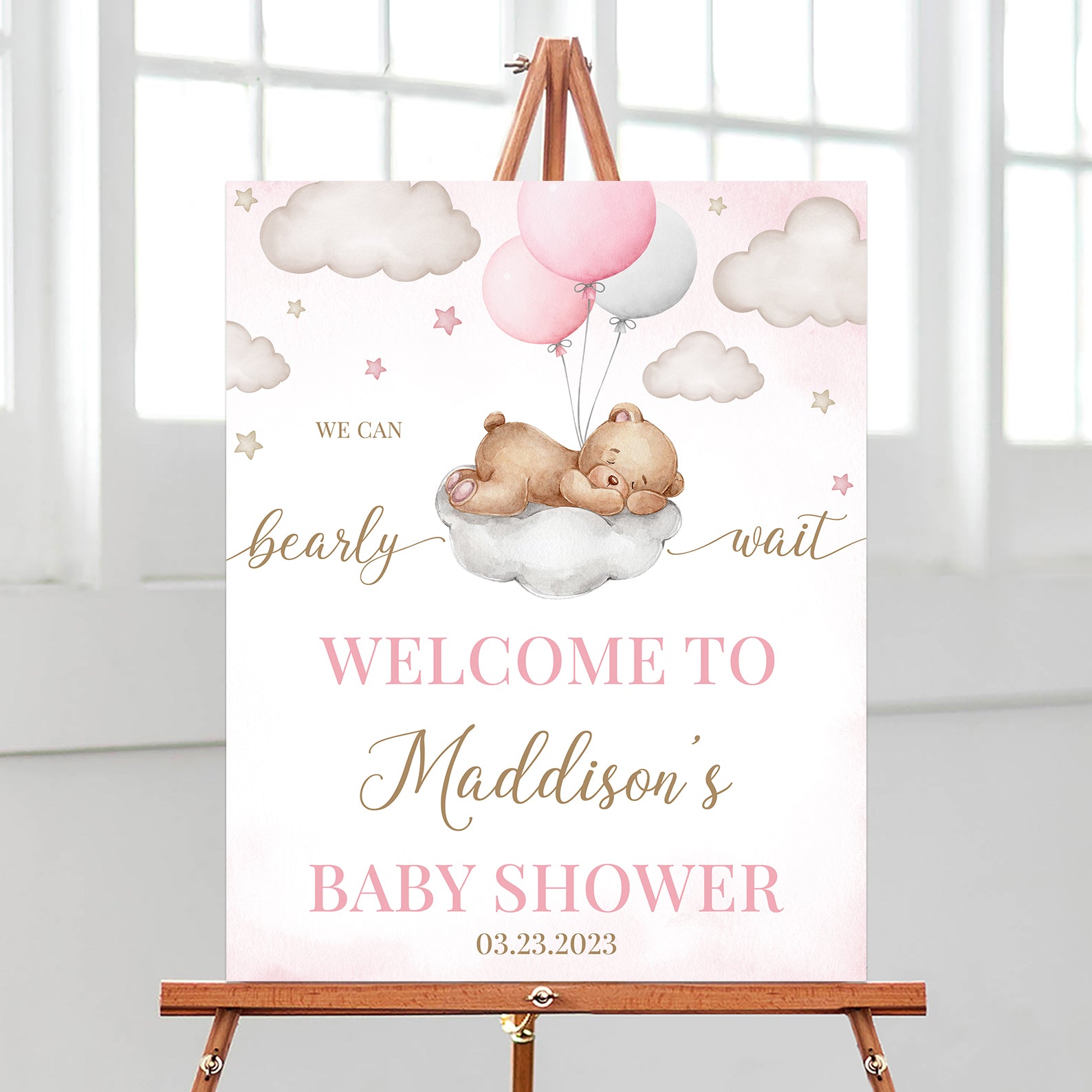 Greet your guests with our adorable "We Can Bearly Wait" baby shower Welcome Sign! Featuring a sweet pink teddy bear sleeping on a fluffy cloud surrounded by twinkling stars, this digital sign sets a magical tone for your celebration. Perfect for printing and displaying at the entrance, it coordinates beautifully with invitations, table signs, and games. Fully editable, it’s an easy and charming way to welcome friends and family to your special day!