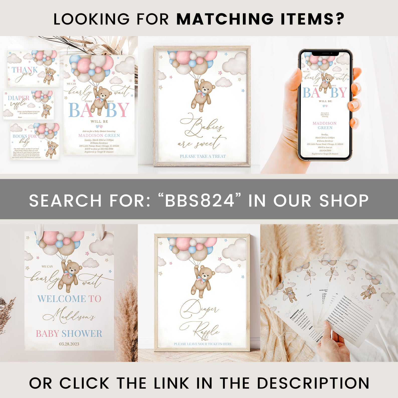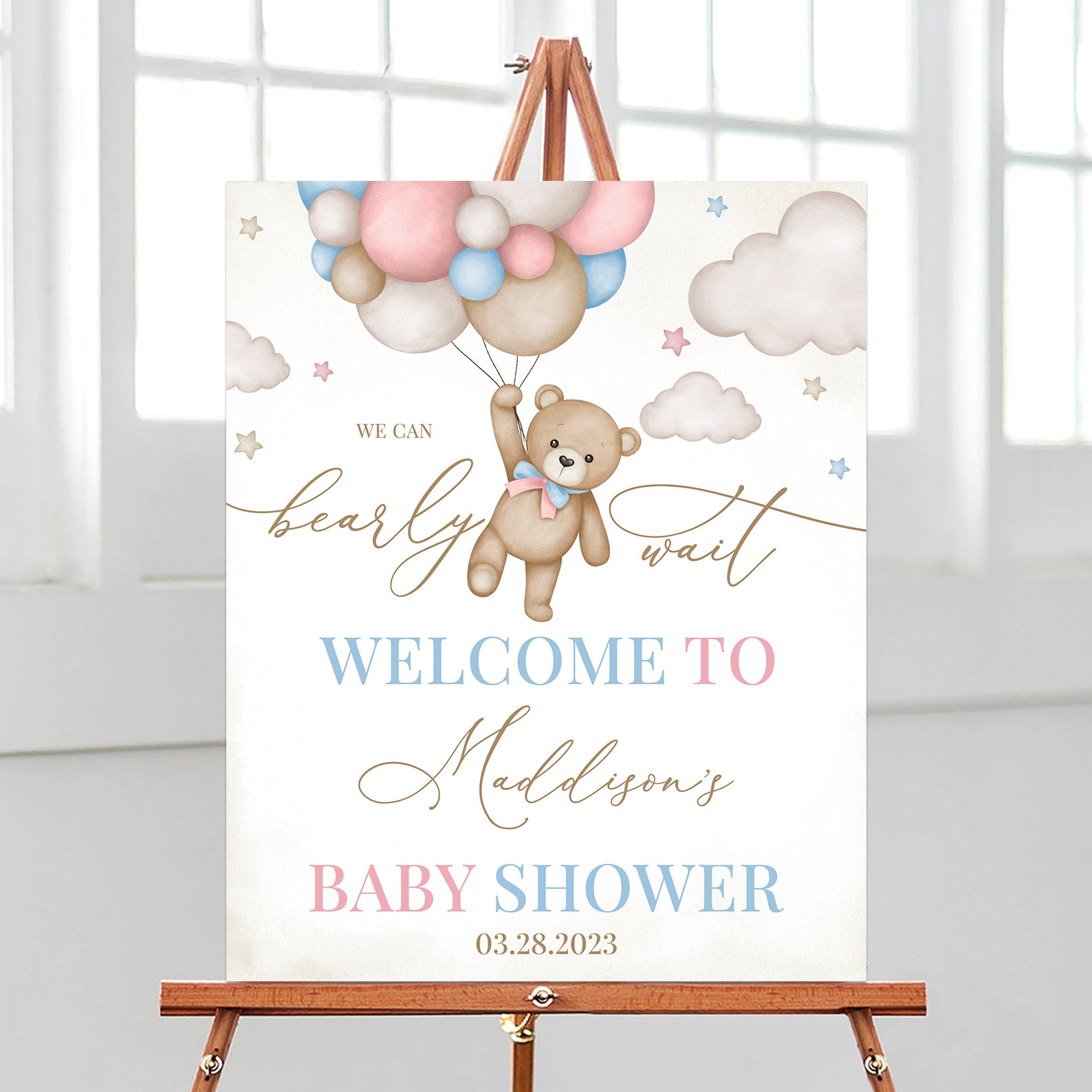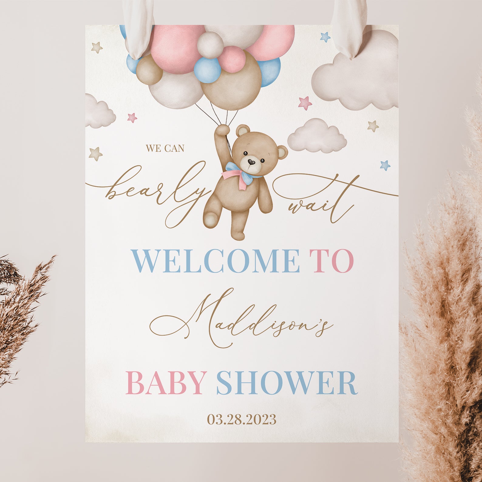 - Purchase this We Can Bearly Wait Gender Reveal Welcome Sign: Bear & Balloons template