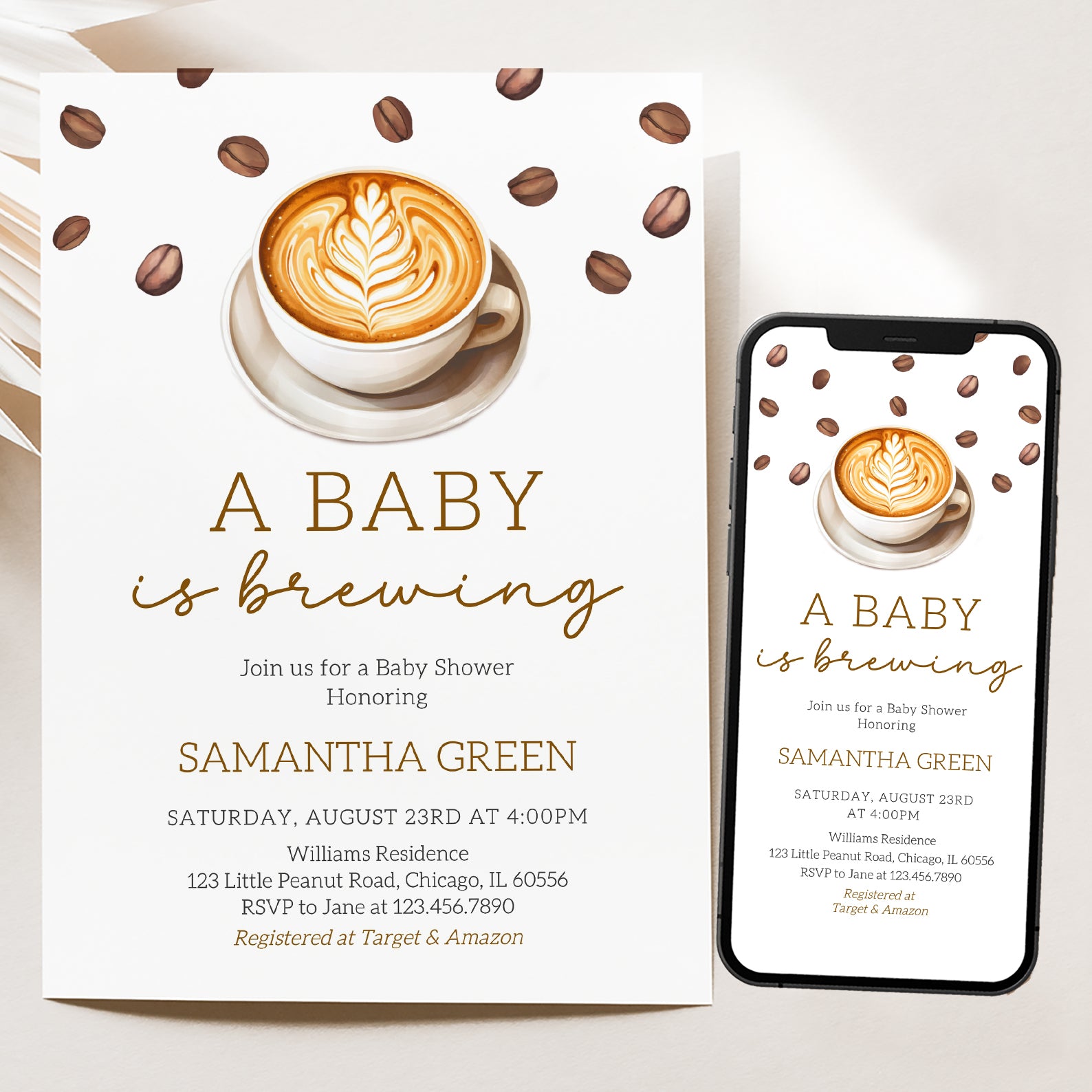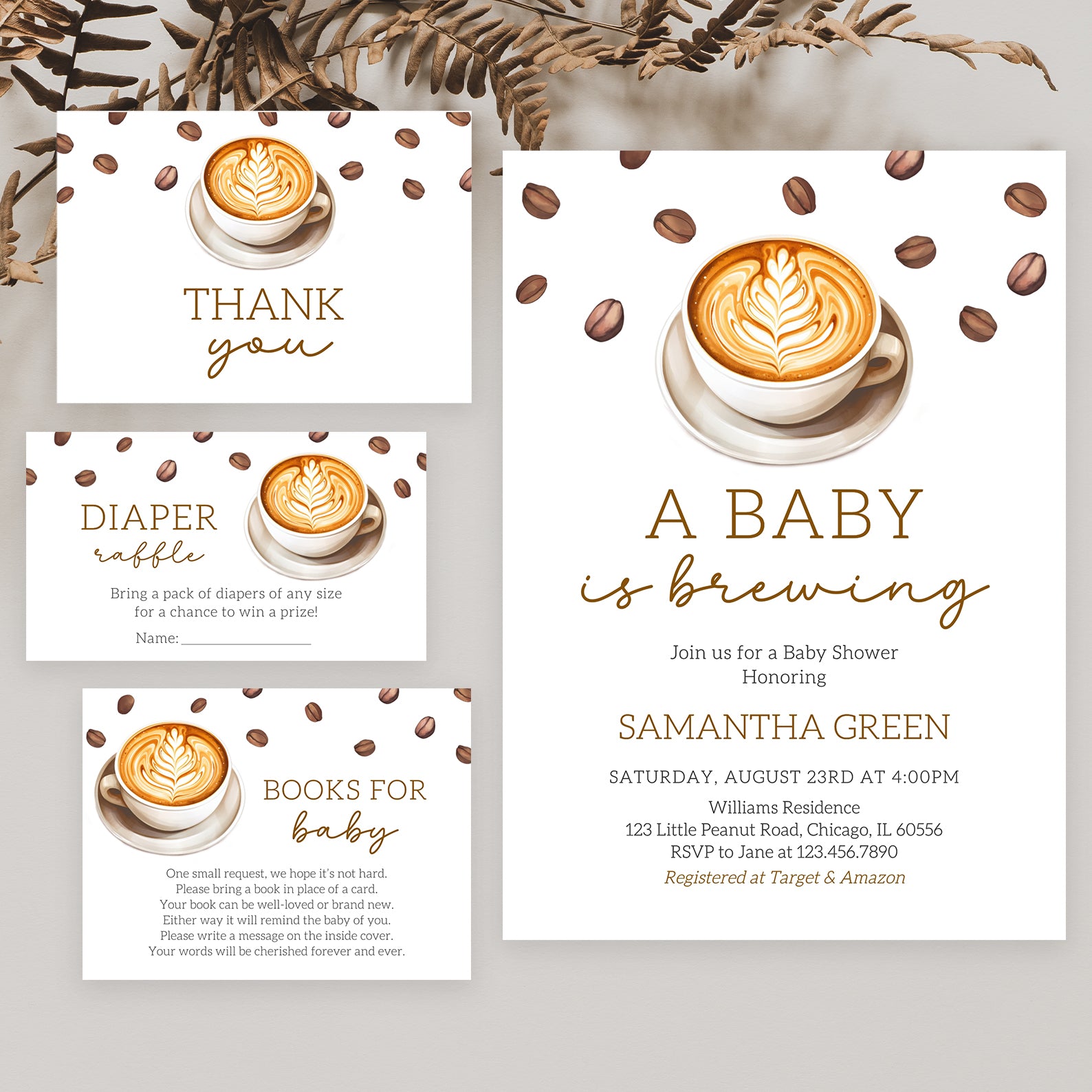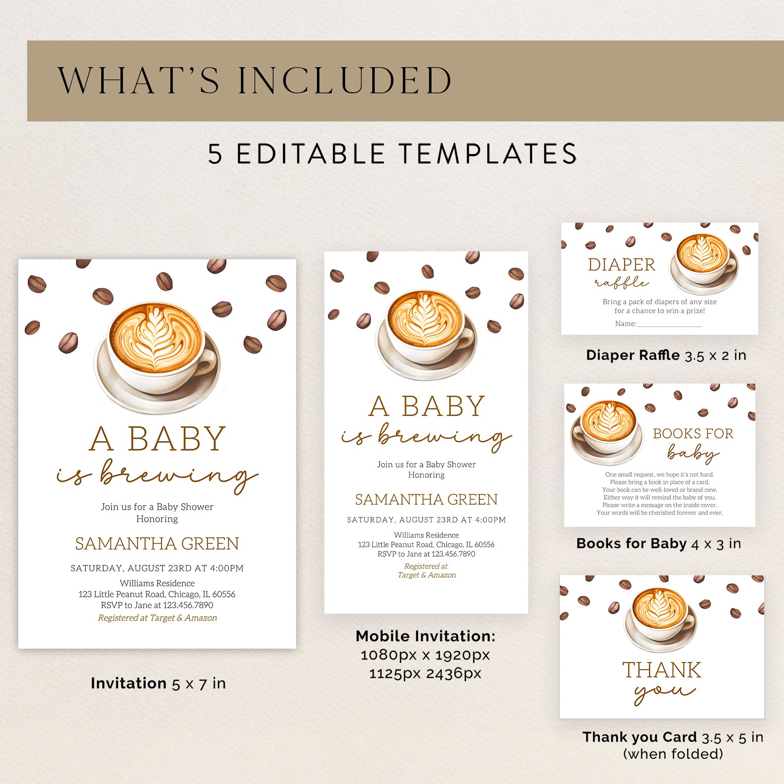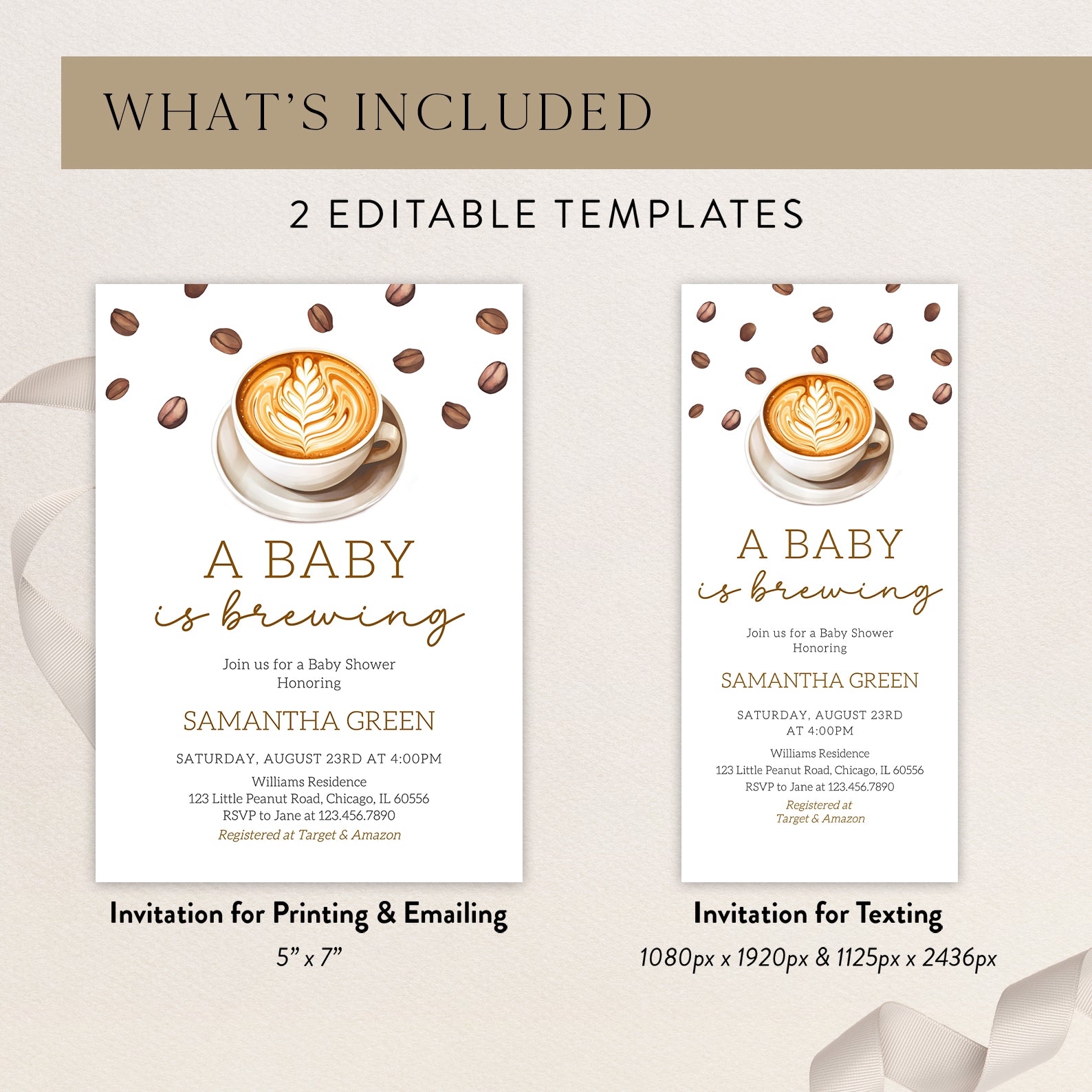 - Purchase this A Baby Is Brewing: Minimalist Coffee-Themed Baby Shower Invite Bundle template