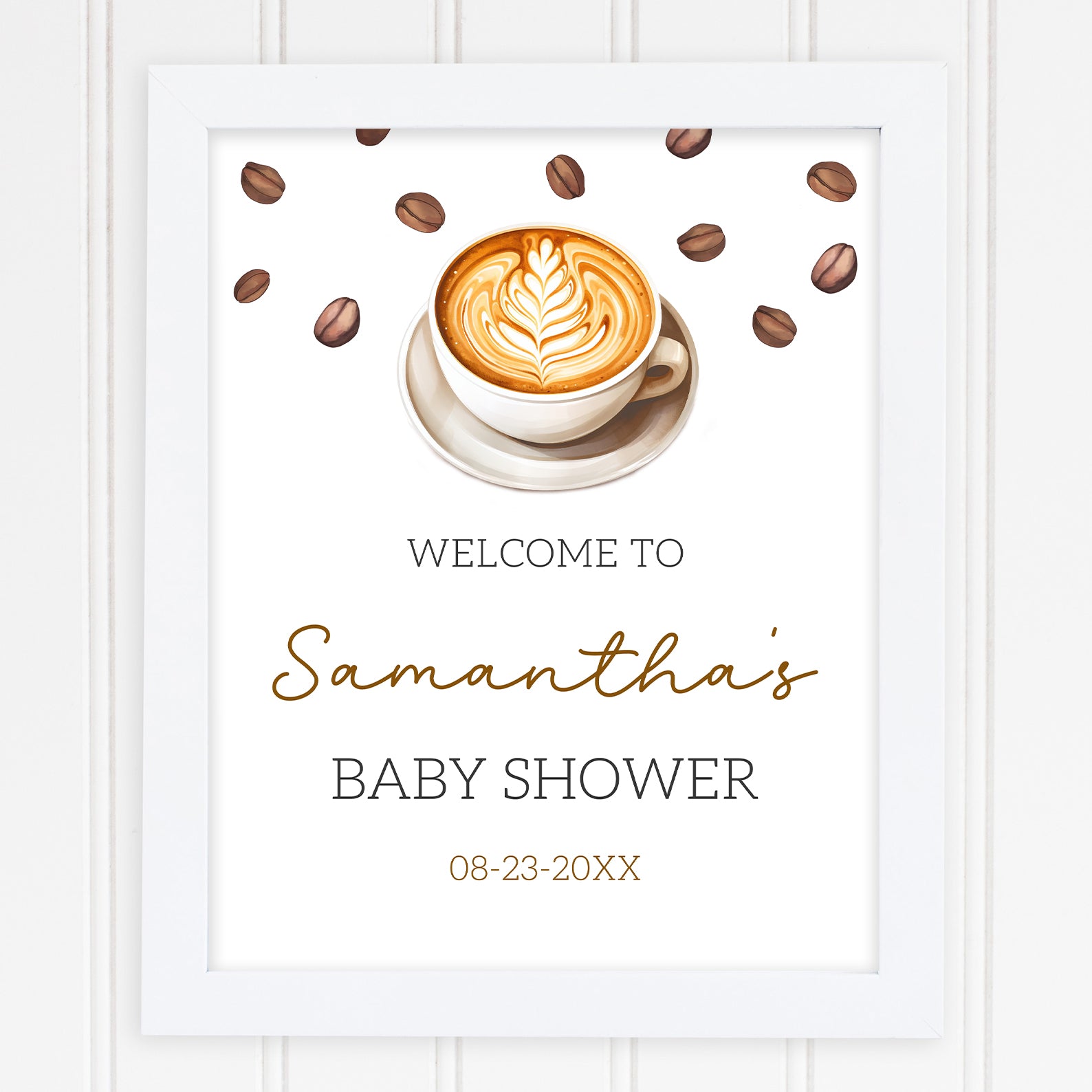 A Baby is Brewing! This minimalist welcome sign features falling coffee beans and a latte art cup, setting a warm and cozy tone for your baby shower. Perfect for coffee lovers, it’s a charming way to greet your guests!