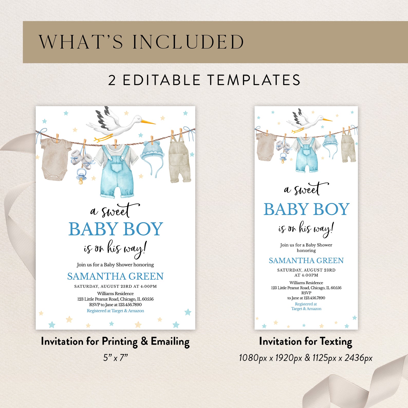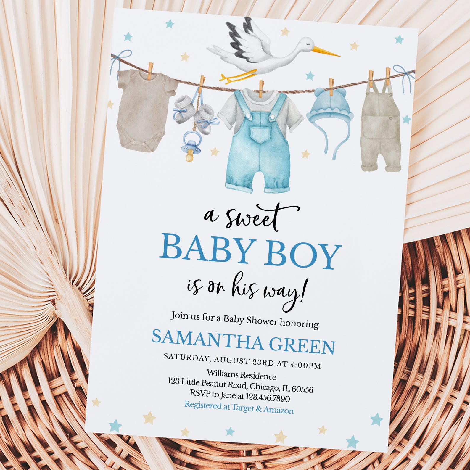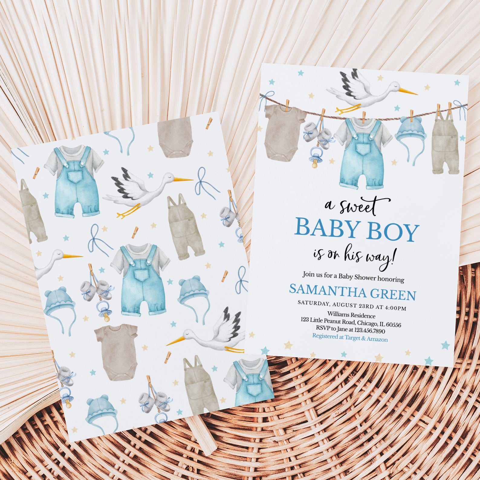- Purchase this Baby Boy Shower Invitation: Stork & Hanging Baby Clothes template