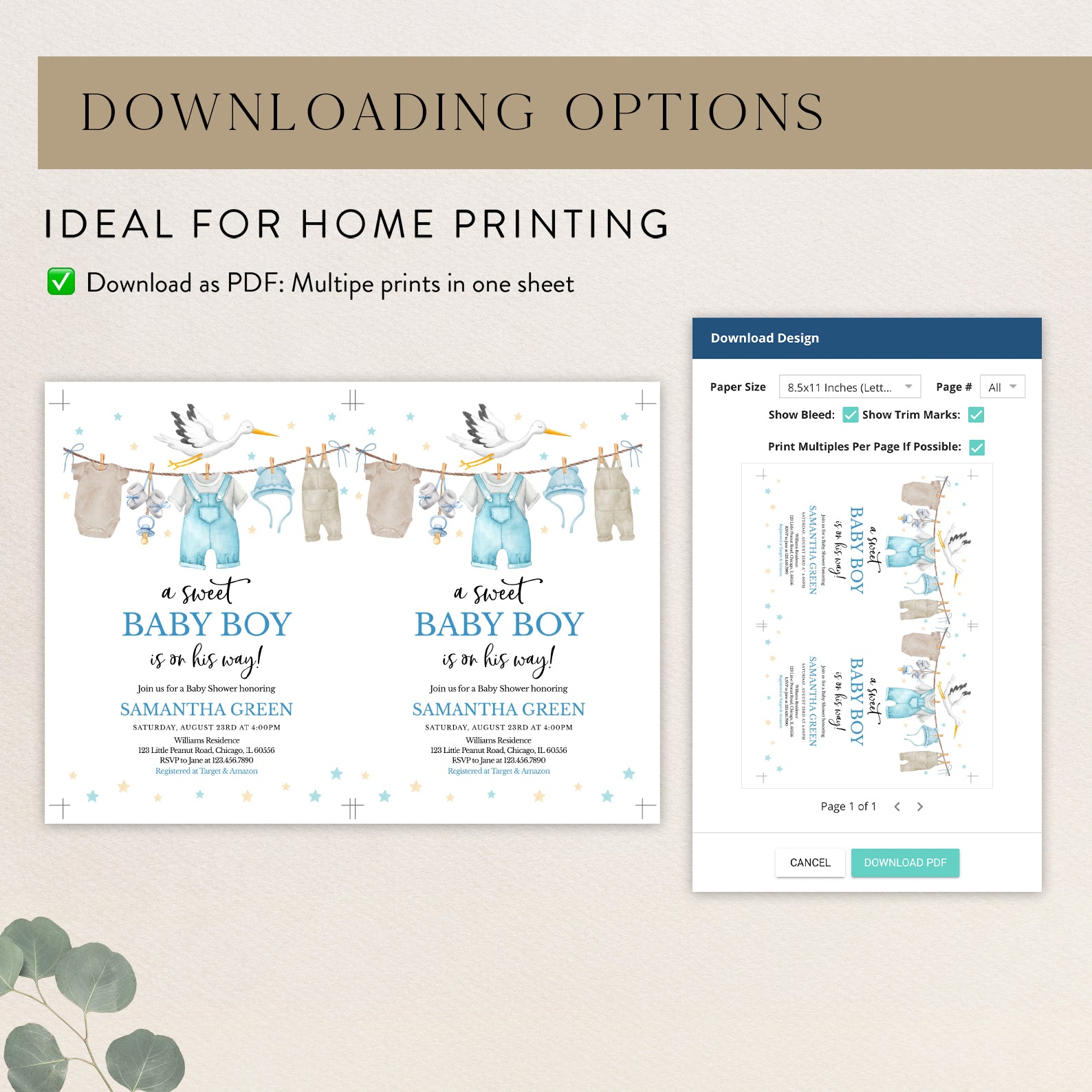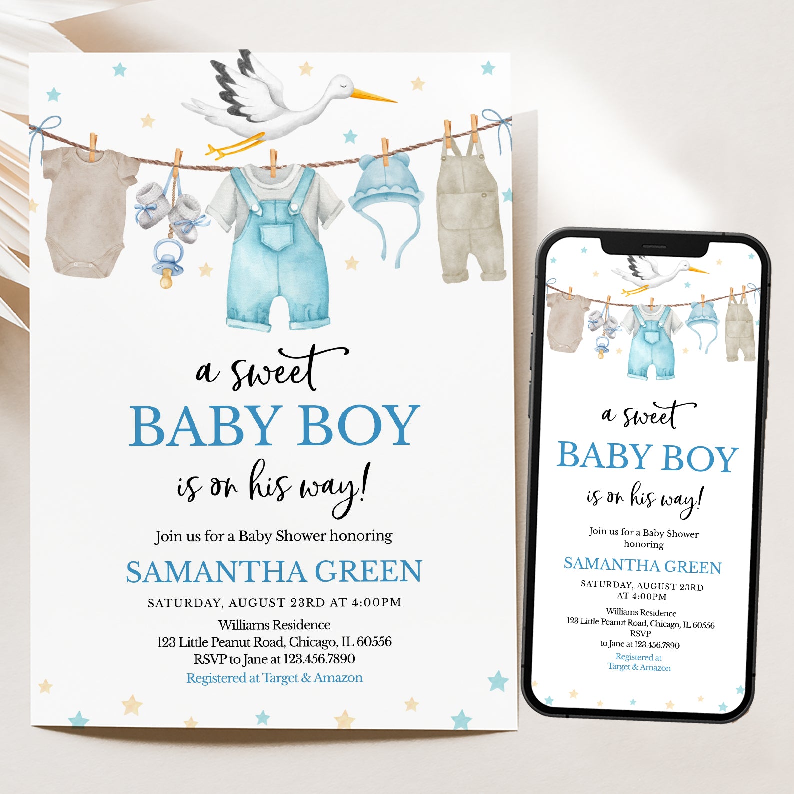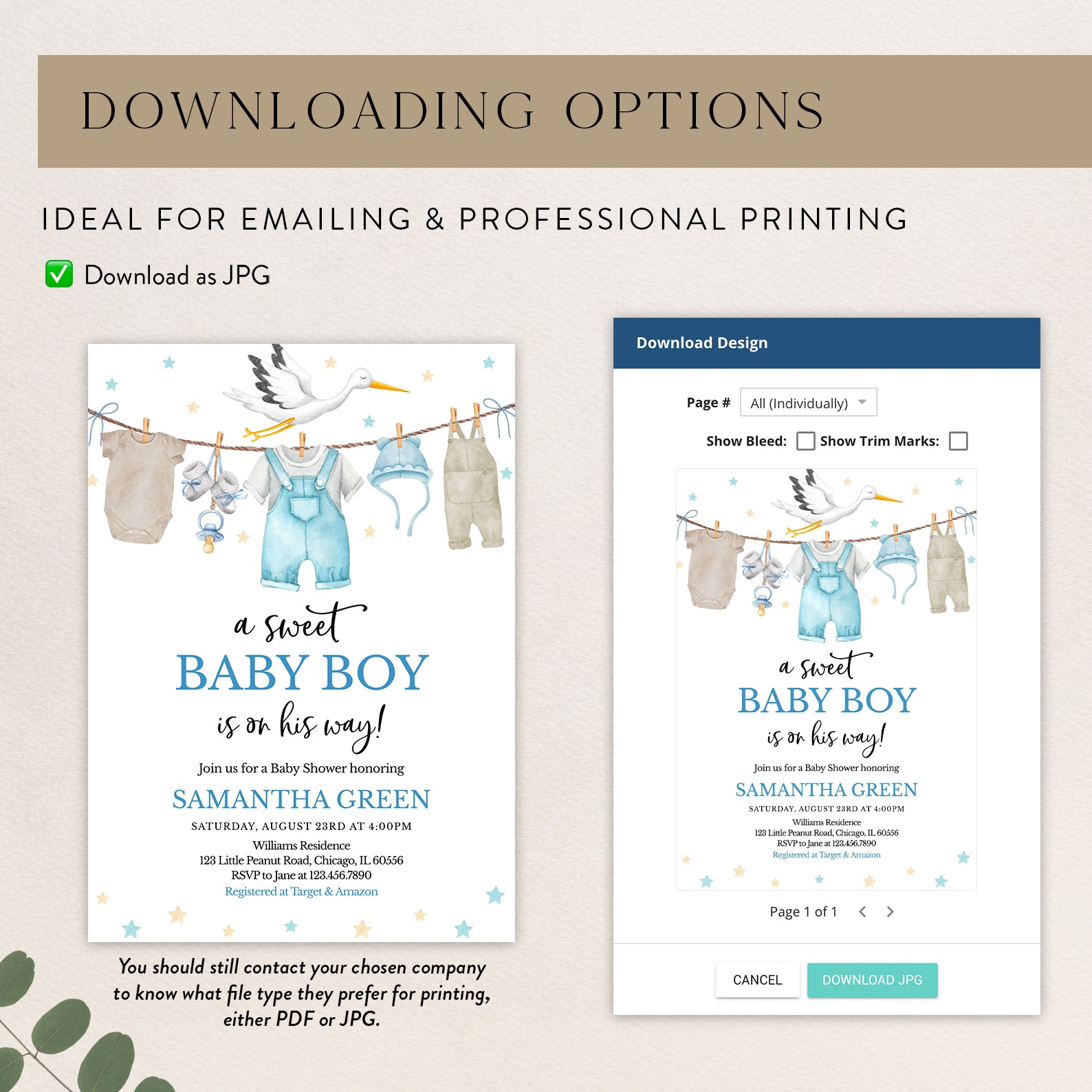 - Purchase this Baby Boy Shower Invitation: Stork & Hanging Baby Clothes template