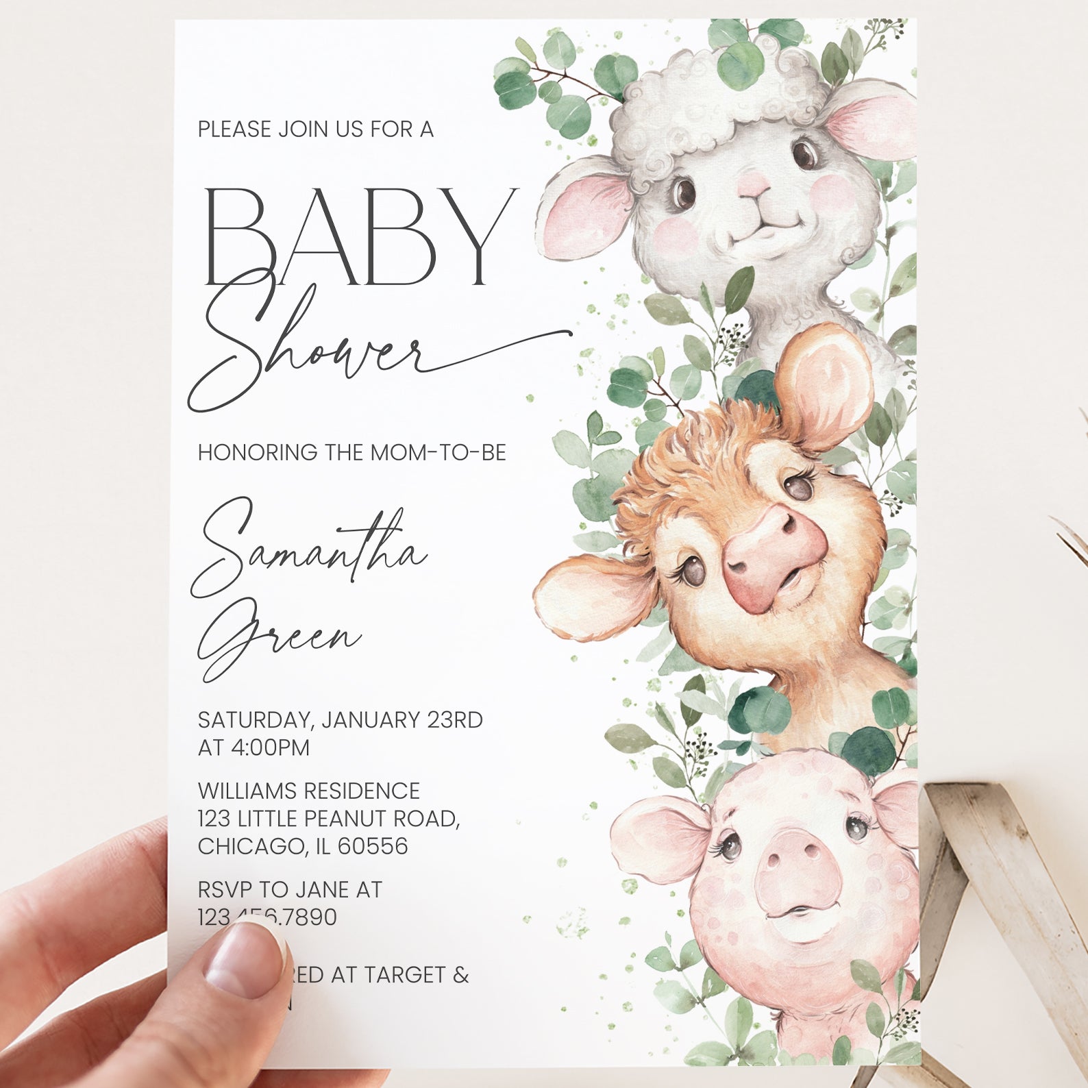 - Purchase this Baby Shower Invite with Cute Farm Animals & Greenery template