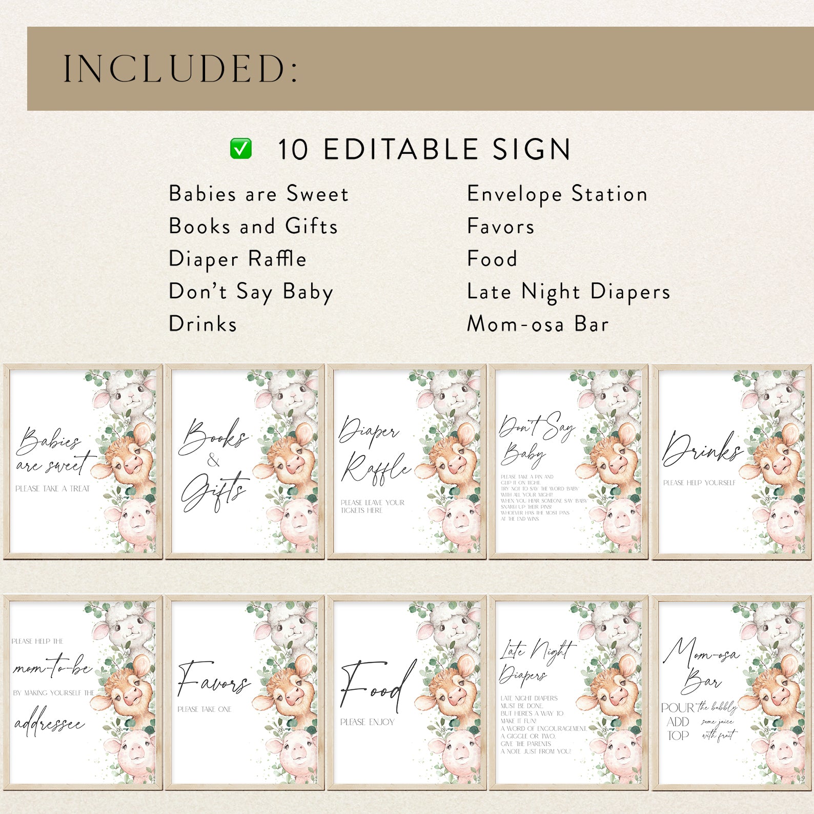 Bring playful charm to your baby shower with our editable farm animal table sign set! Each of the ten designs: Babies Are Sweet, Books and Gifts, Diaper Raffle Sign, Don’t Say Baby, Drinks Sign, Envelope Station, Favors, Food Sign, Late Night Diapers, and Mom-osa Bar. Features cute barnyard animals like a lamb, calf, and piglet surrounded by green leaves. Stylish yet rustic, this set adds warmth and personality to every corner of your celebration.