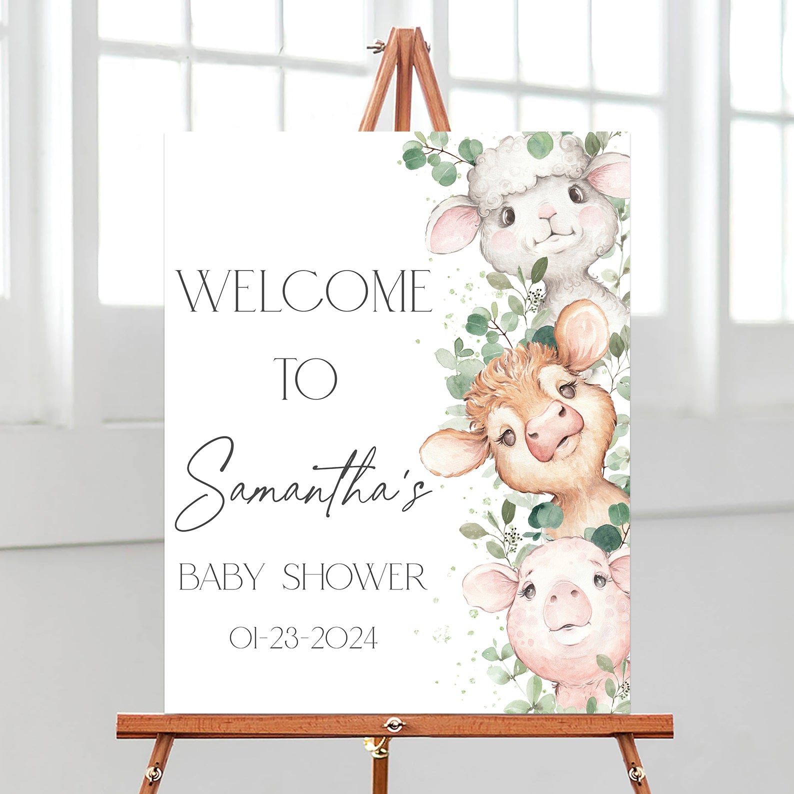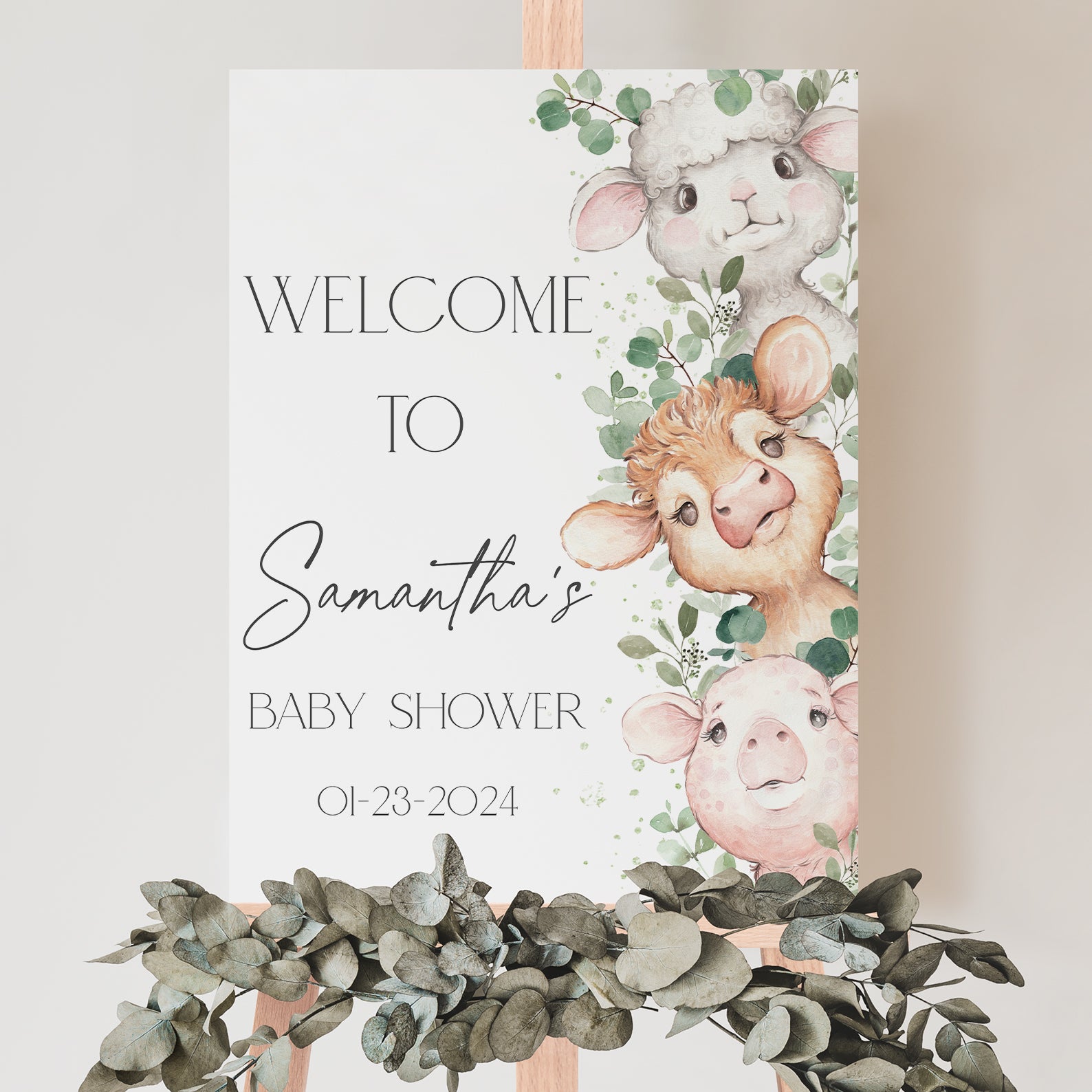 - Purchase this Baby Shower Welcome Sign with Cute Farm Animals & Greenery template