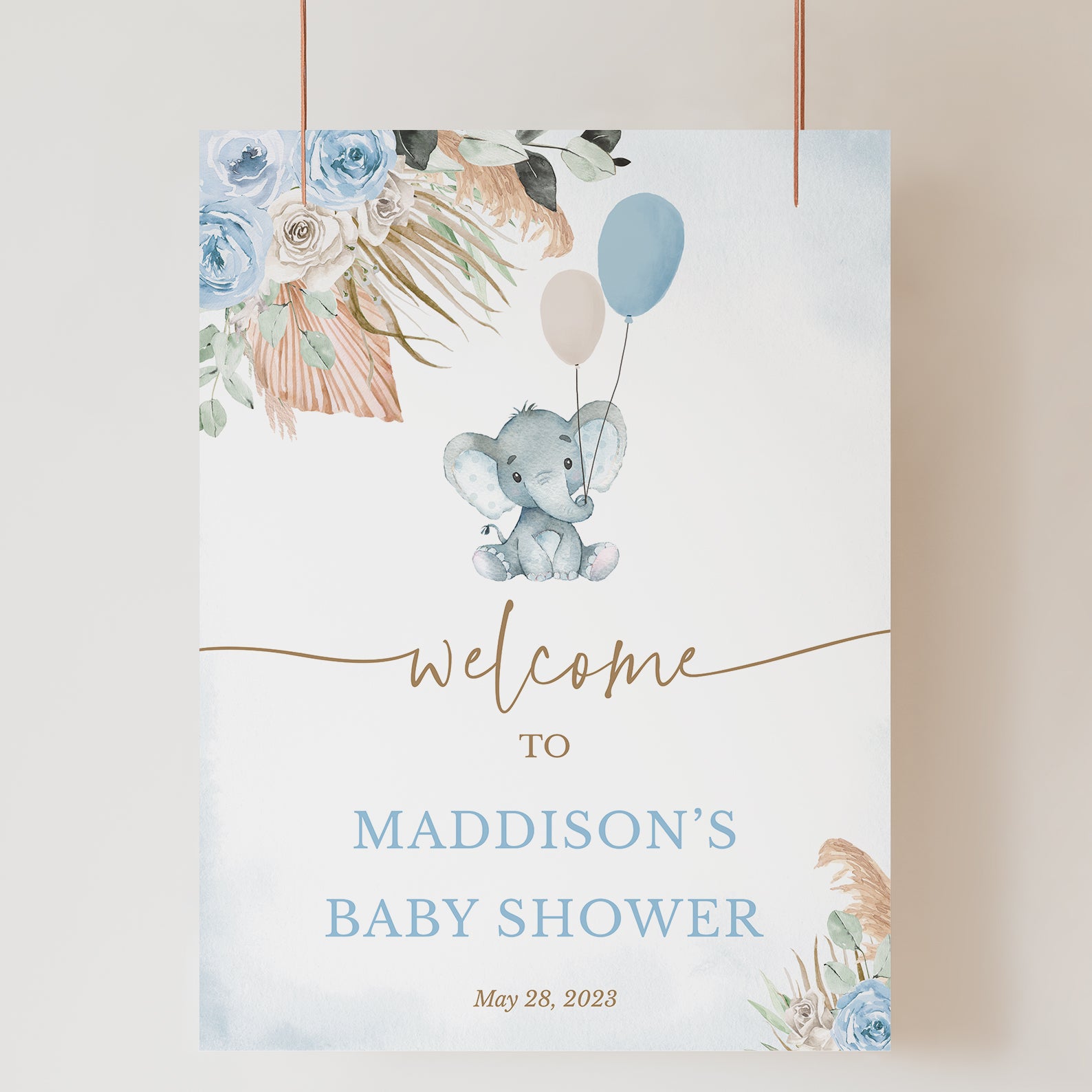 - Purchase this Blue Baby Shower Welcome Sign: Whimsical Elephant & Boho Florals template