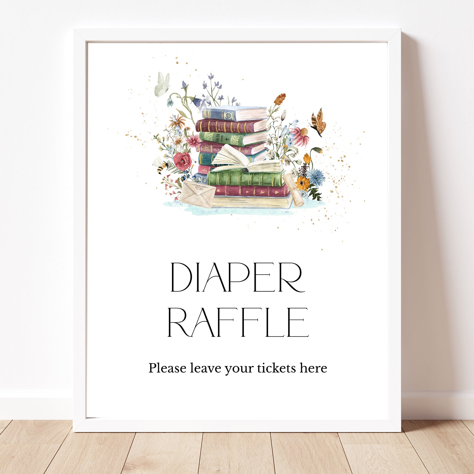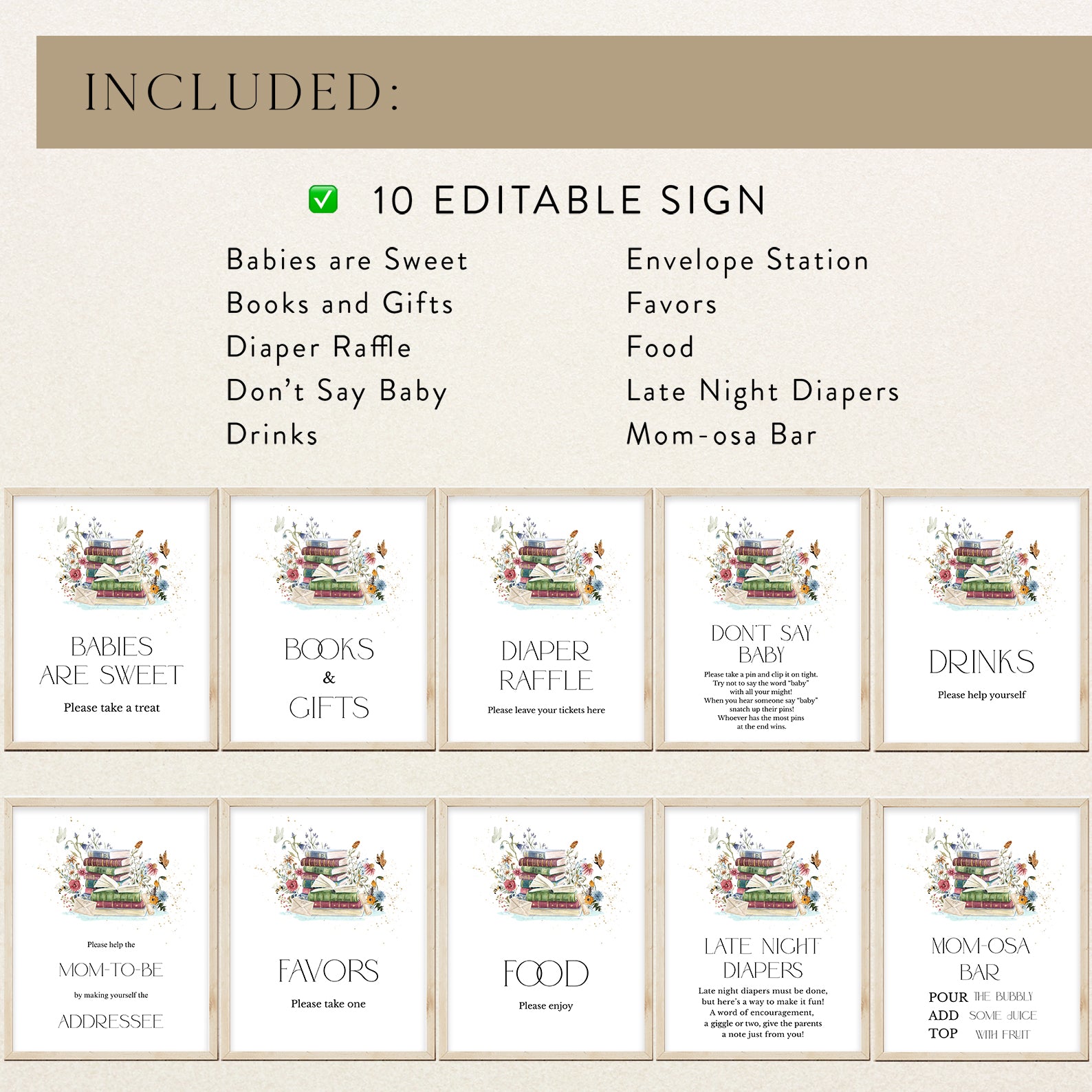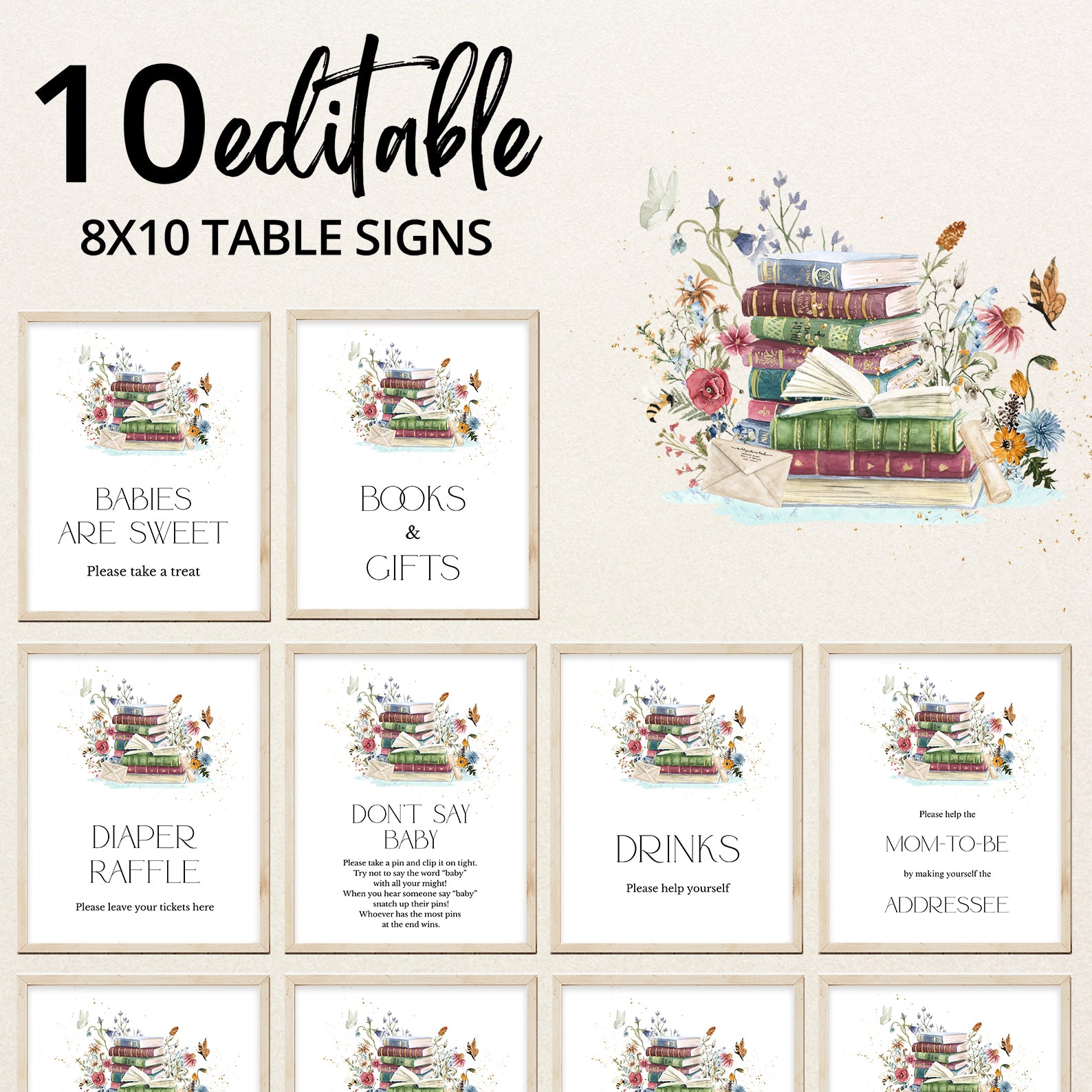 Add a touch of elegance to your baby shower with this set of ten editable table signs, designed in a charming minimalist style. Featuring a delicate stack of books adorned with wildflowers, fluttering butterflies, and whimsical bees, each sign brings a timeless and serene feel to your celebration. The set includes Babies Are Sweet, Books and Gifts, Diaper Raffle, Don't Say Baby, Drinks, Envelope Station, Favors, Food, Late Night Diapers, and Mom-osa Bar, making it the perfect addition to a beautifully curated event.
