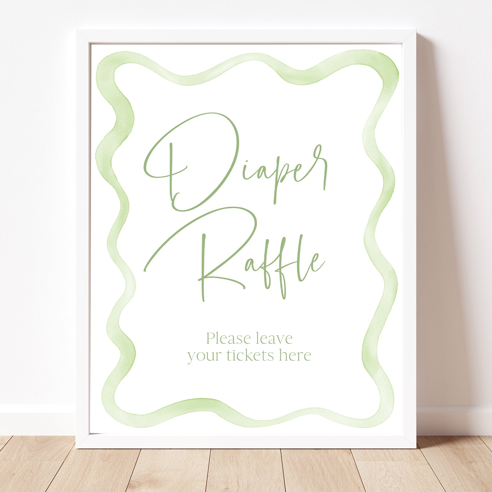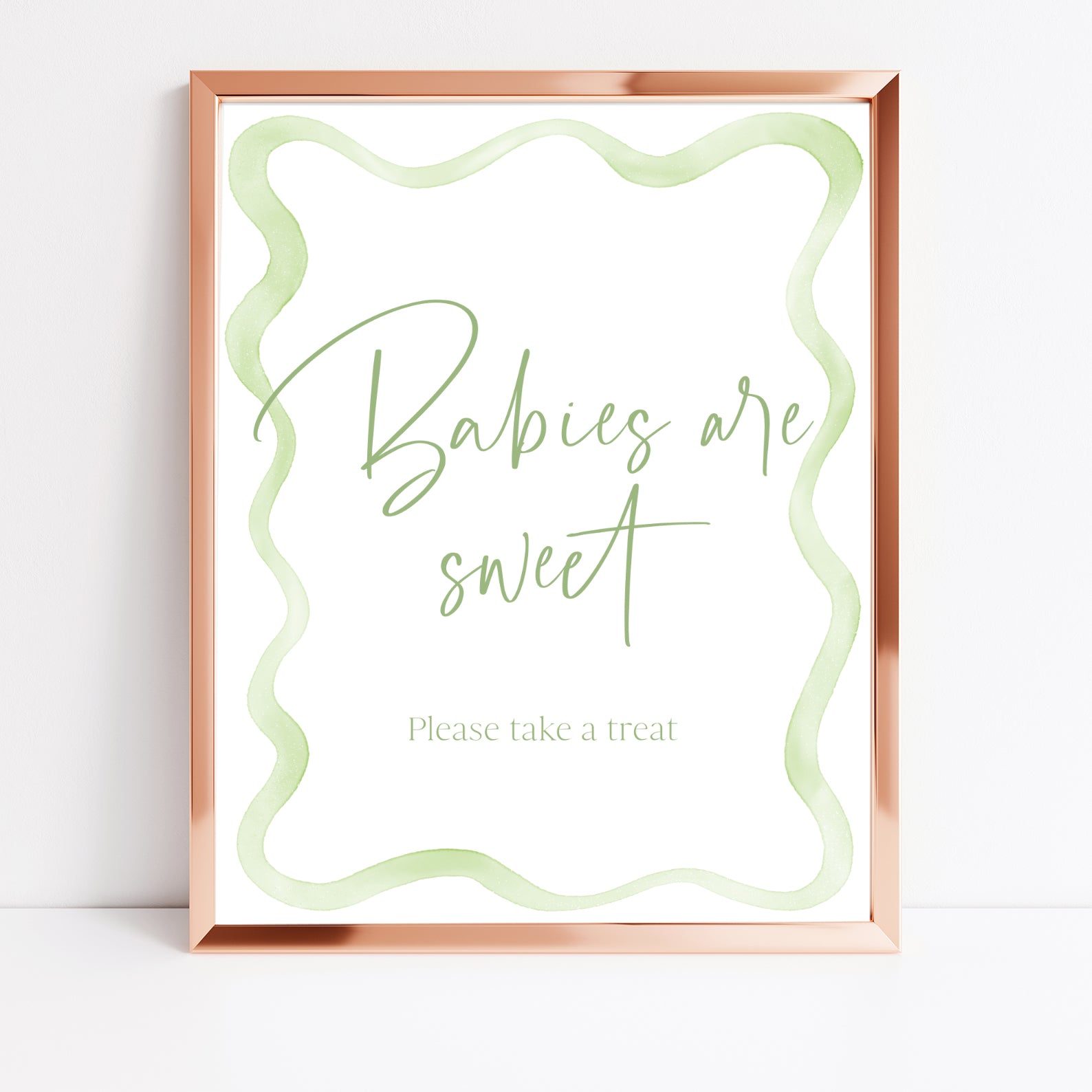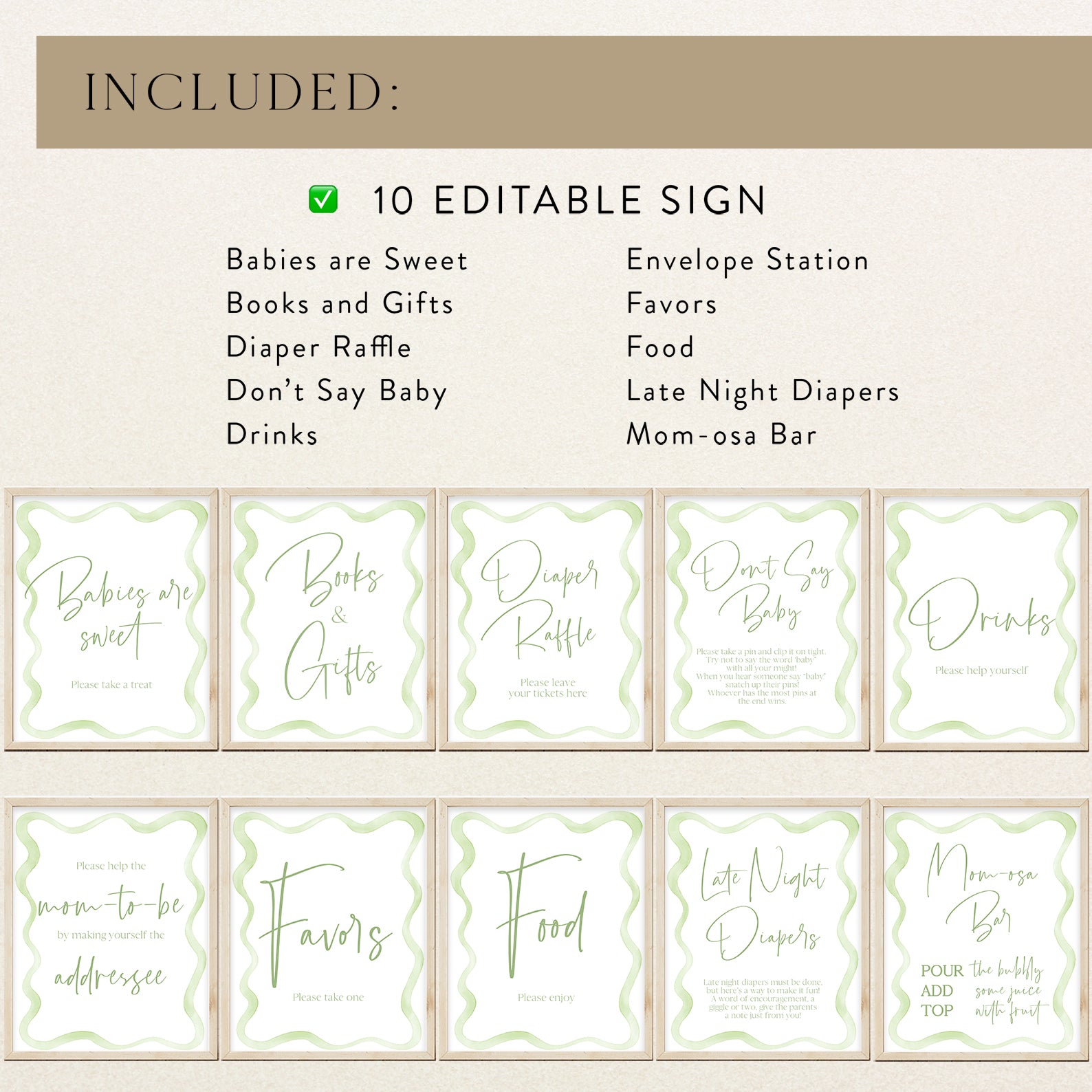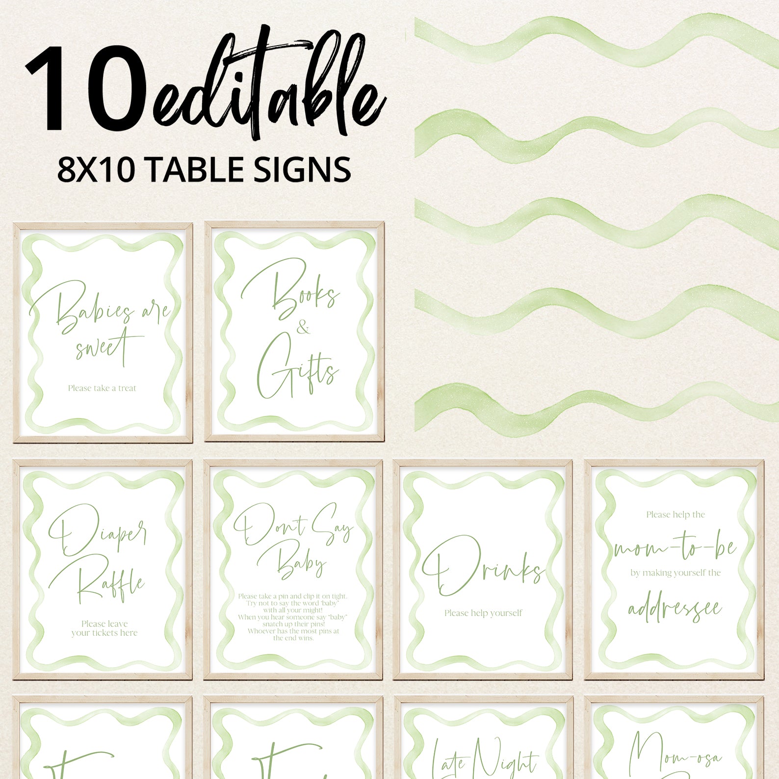 Complete your baby shower with this charming set of ten editable table signs, featuring a minimalist wavy border design in soothing green, pink, or blue themes. Perfect for a modern, elegant celebration, this set includes Babies Are Sweet, Books and Gifts, Diaper Raffle Sign, Don't Say Baby, Drinks Sign, Envelope Station, Favors, Food Sign, Late Night Diapers, and Mom-osa Bar—making it easy to add style and organization to your special day!