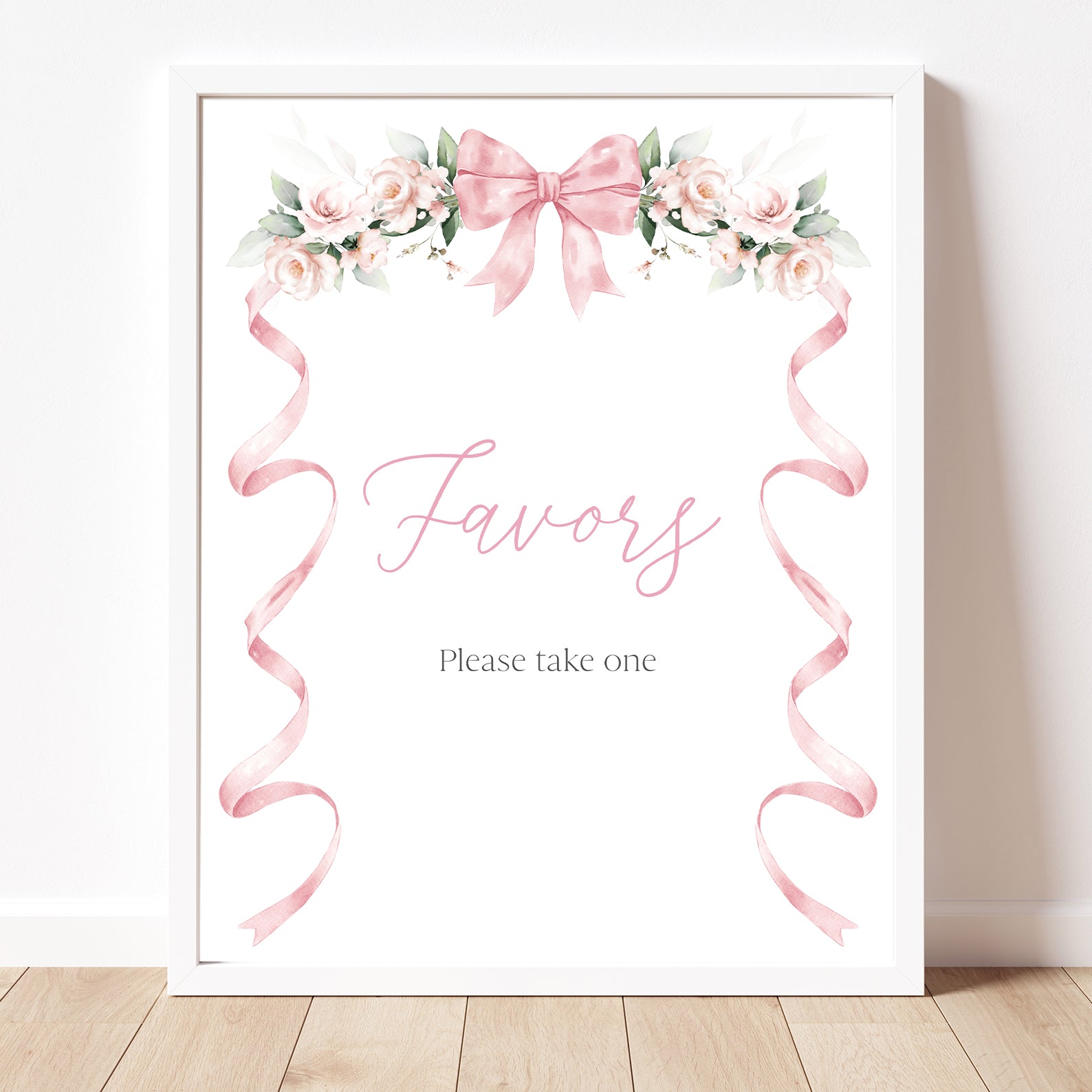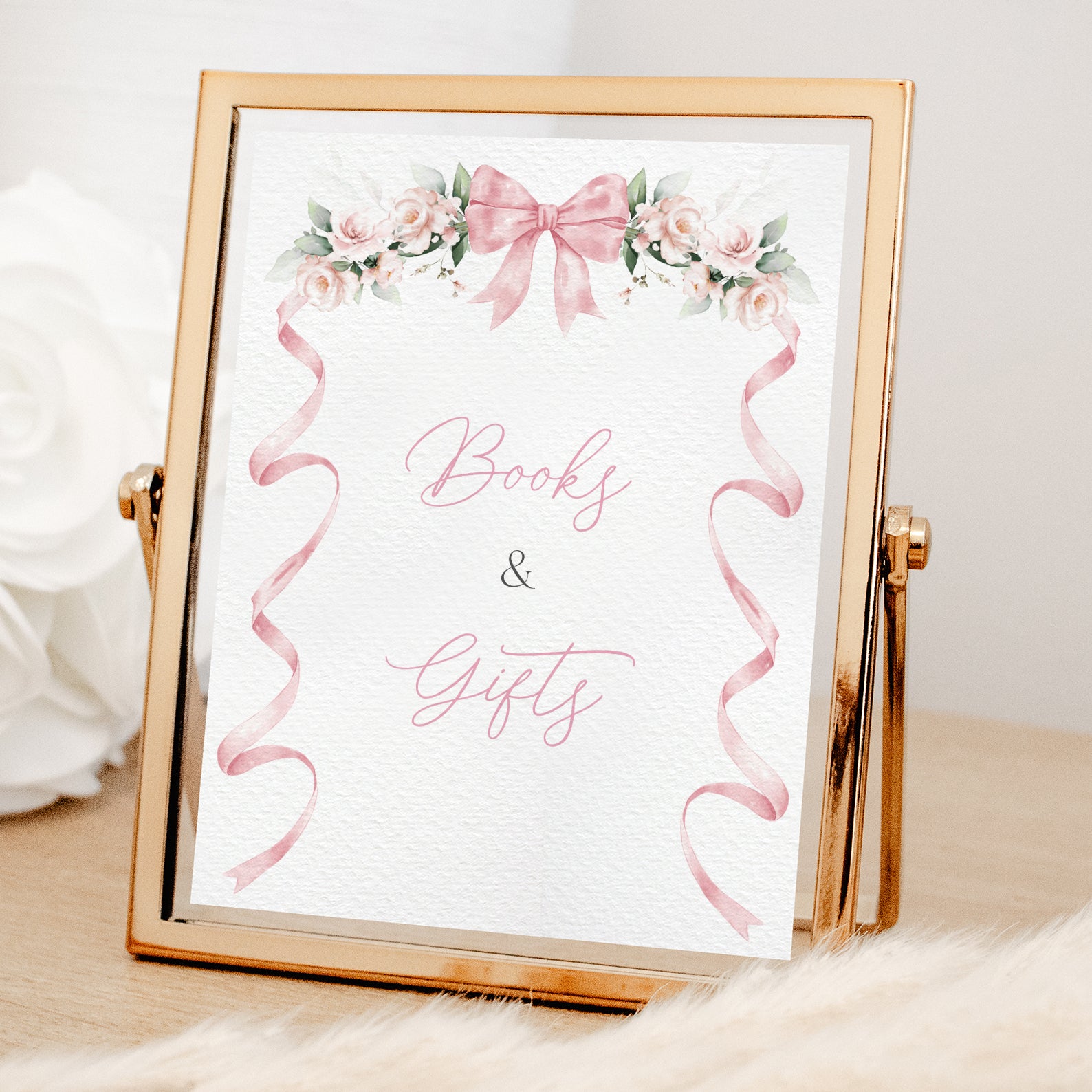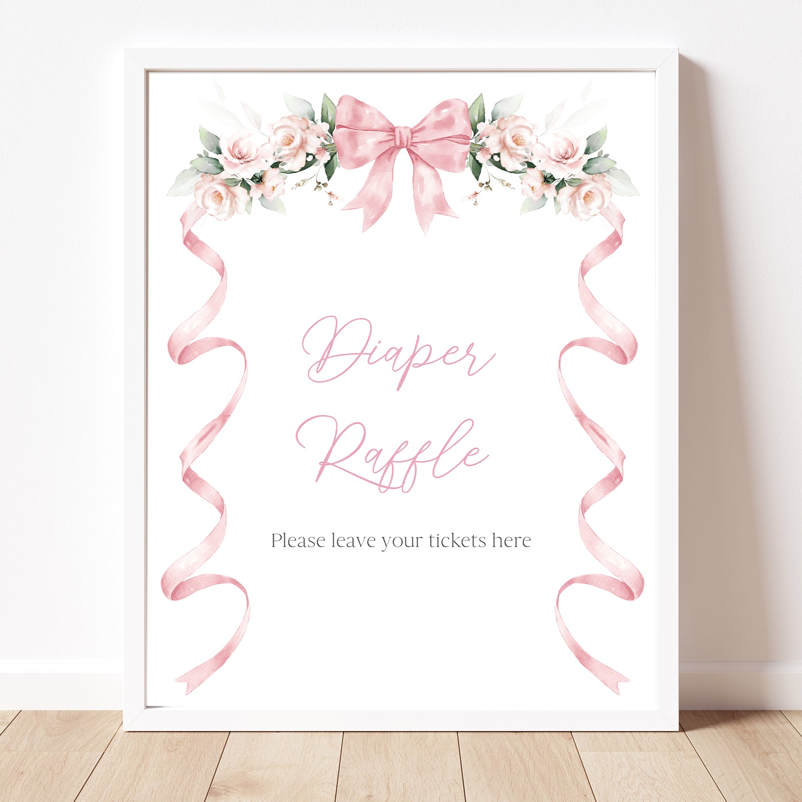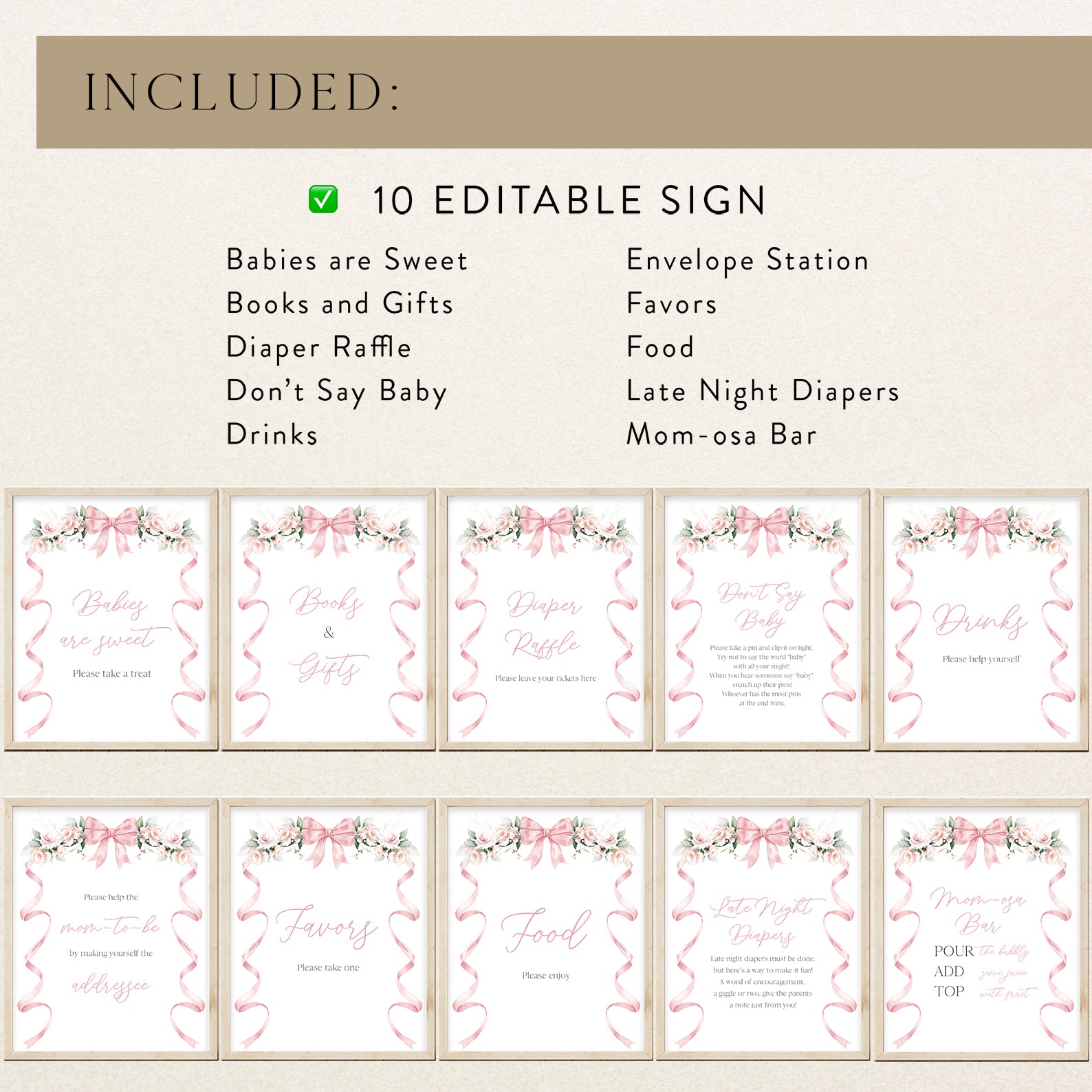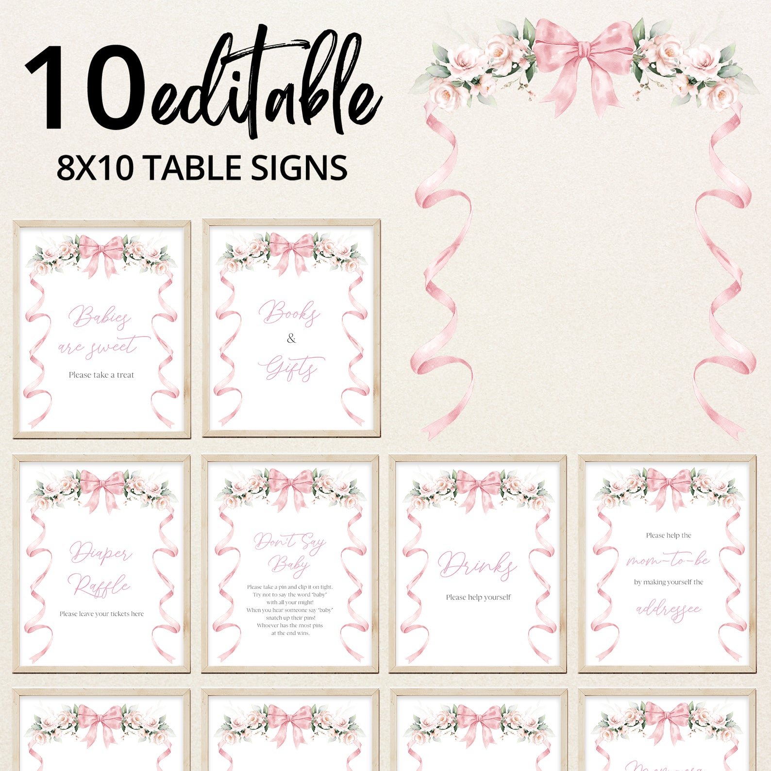 Enhance your baby shower décor with this set of ten editable table signs, perfectly designed to complement your pink-themed celebration. Featuring delicate floral accents and elegant pink ribbon details, these signs bring a charming and cohesive touch to your event. The set includes Babies Are Sweet, Books and Gifts, Diaper Raffle, Don't Say Baby, Drinks, Envelope Station, Favors, Food, Late Night Diapers, and Mom-osa Bar, ensuring every station at your shower is beautifully styled and organized!