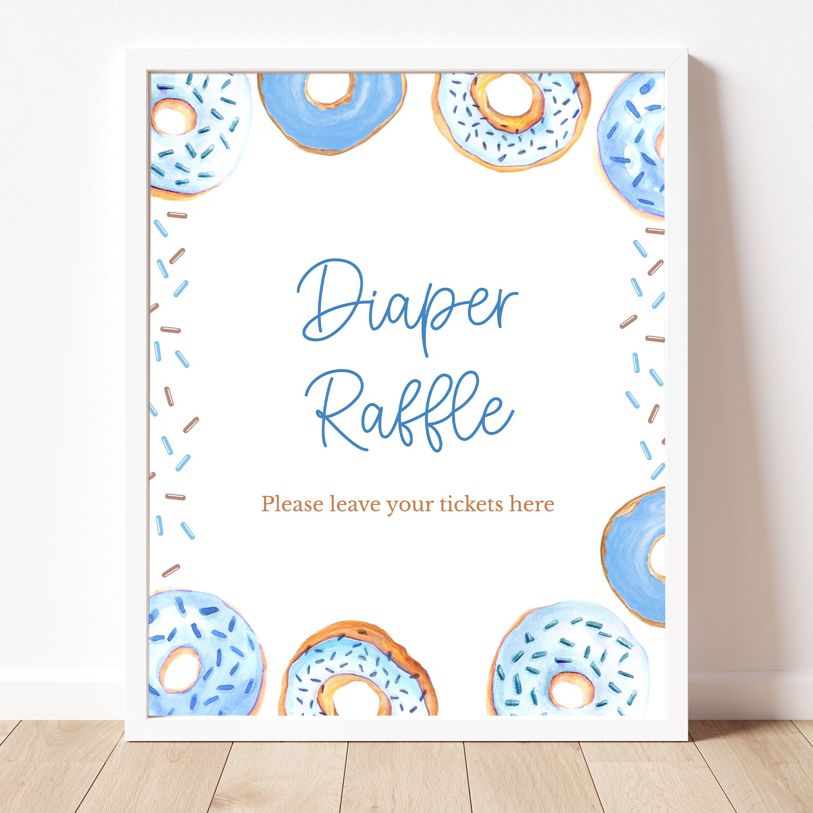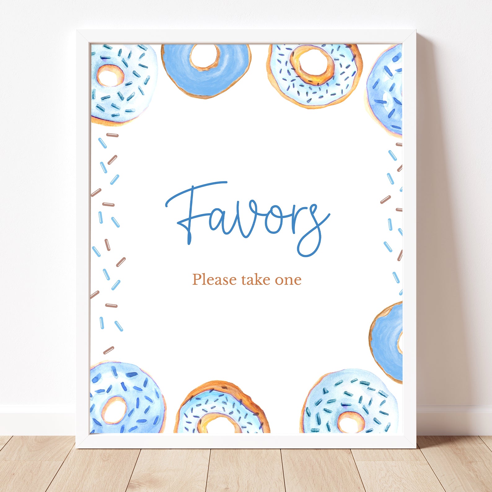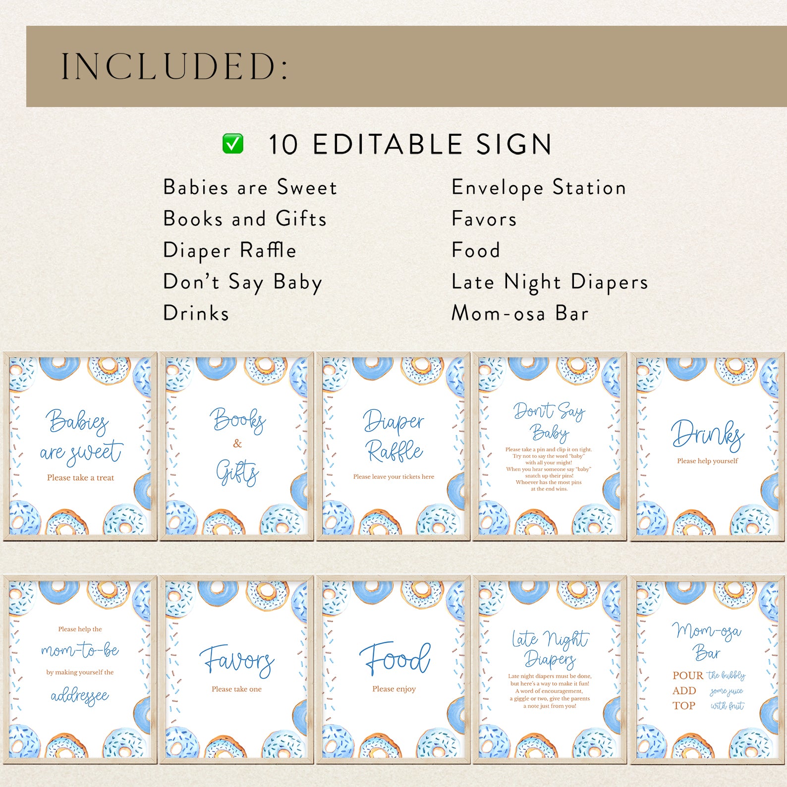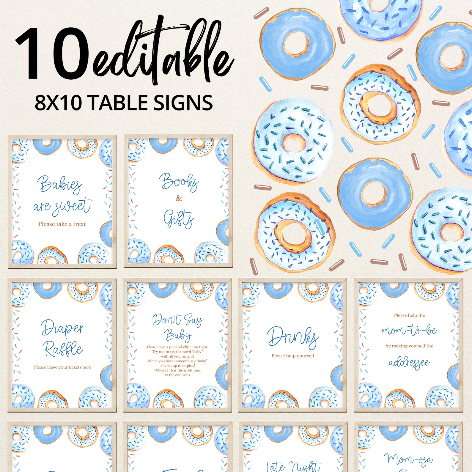 Add a sweet touch to your baby shower with this set of ten editable table signs, available in blue or pink. Designed with playful donut borders and sprinkled accents, this set includes Babies Are Sweet, Books and Gifts, Diaper Raffle, Don't Say Baby, Drinks, Envelope Station, Favors, Food, Late Night Diapers, and Mom-osa Bar—perfect for a fun and memorable celebration.