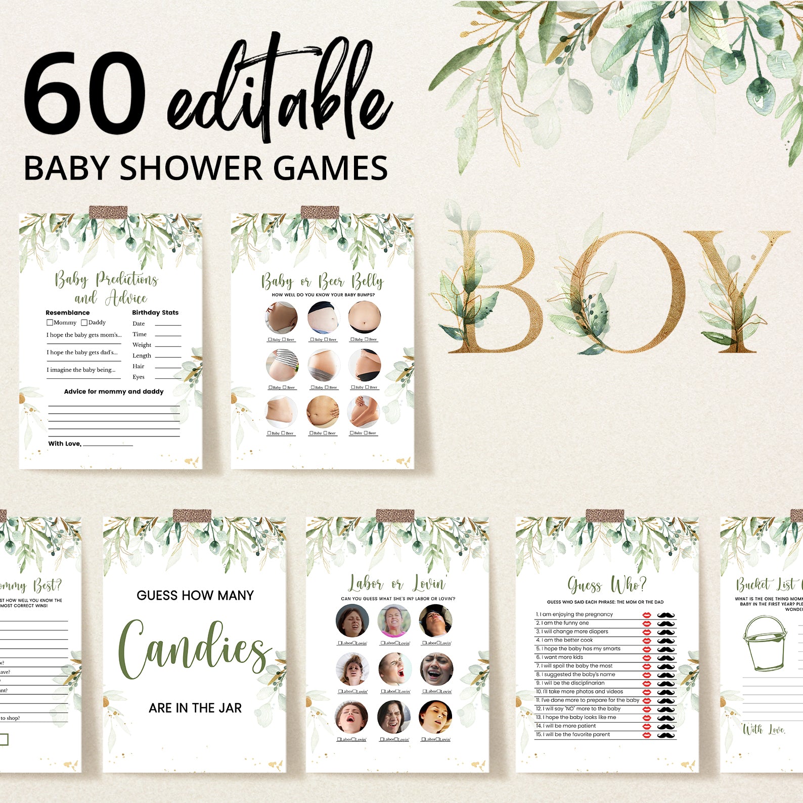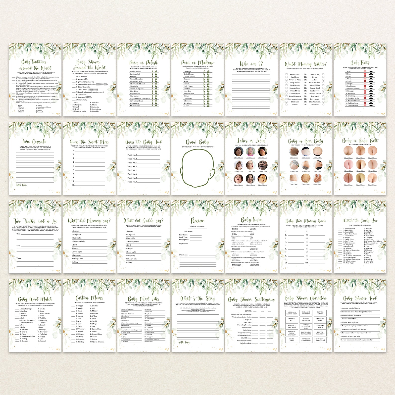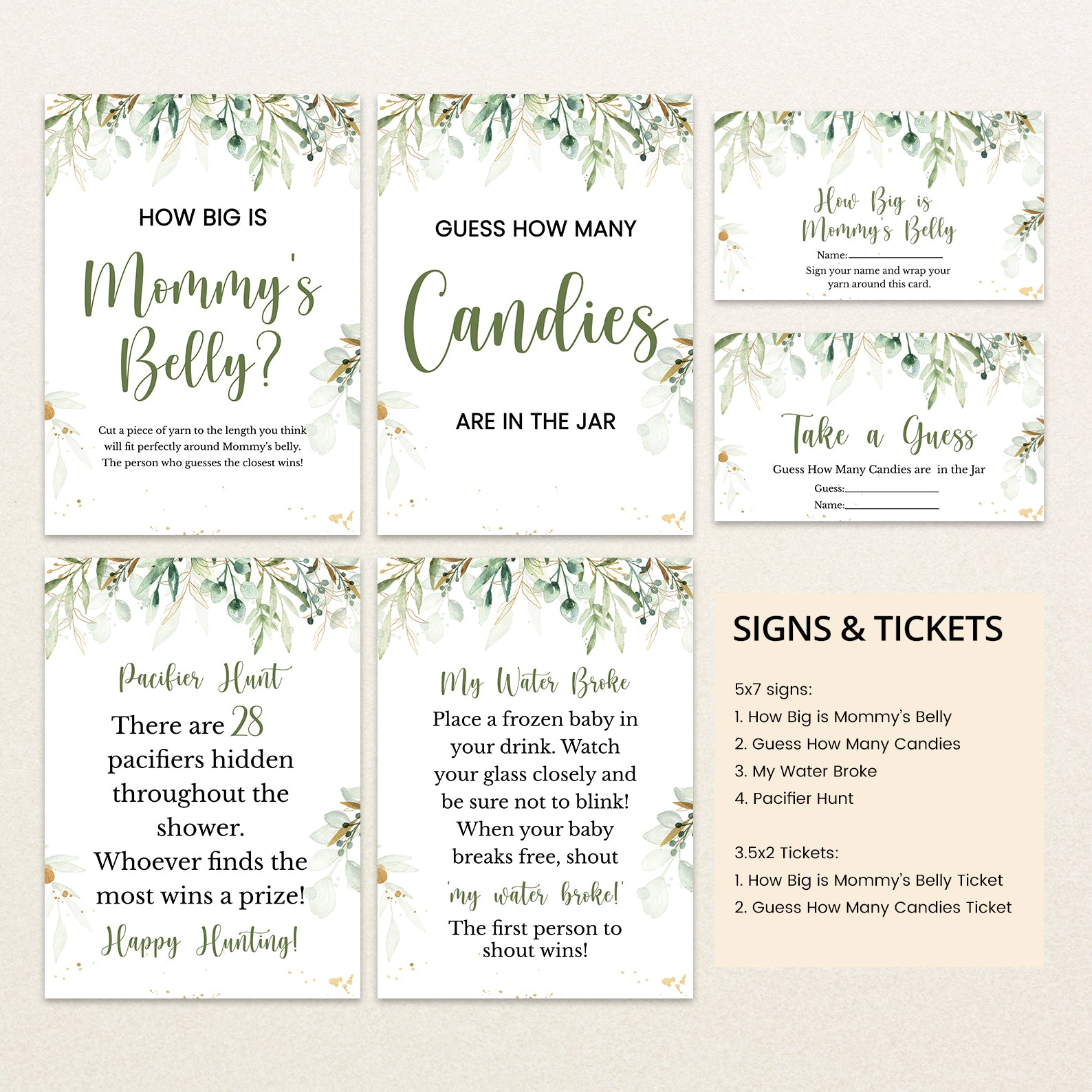 Keep your guests entertained with our green and gold baby shower game bundle! Featuring a chic leafy design with golden accents, this set includes 60 editable baby shower games for endless fun. From classics like Baby Bingo to unique favorites, there’s something for everyone to enjoy. Simple to customize and print, this bundle adds interactive excitement to your party while keeping the theme beautifully consistent.