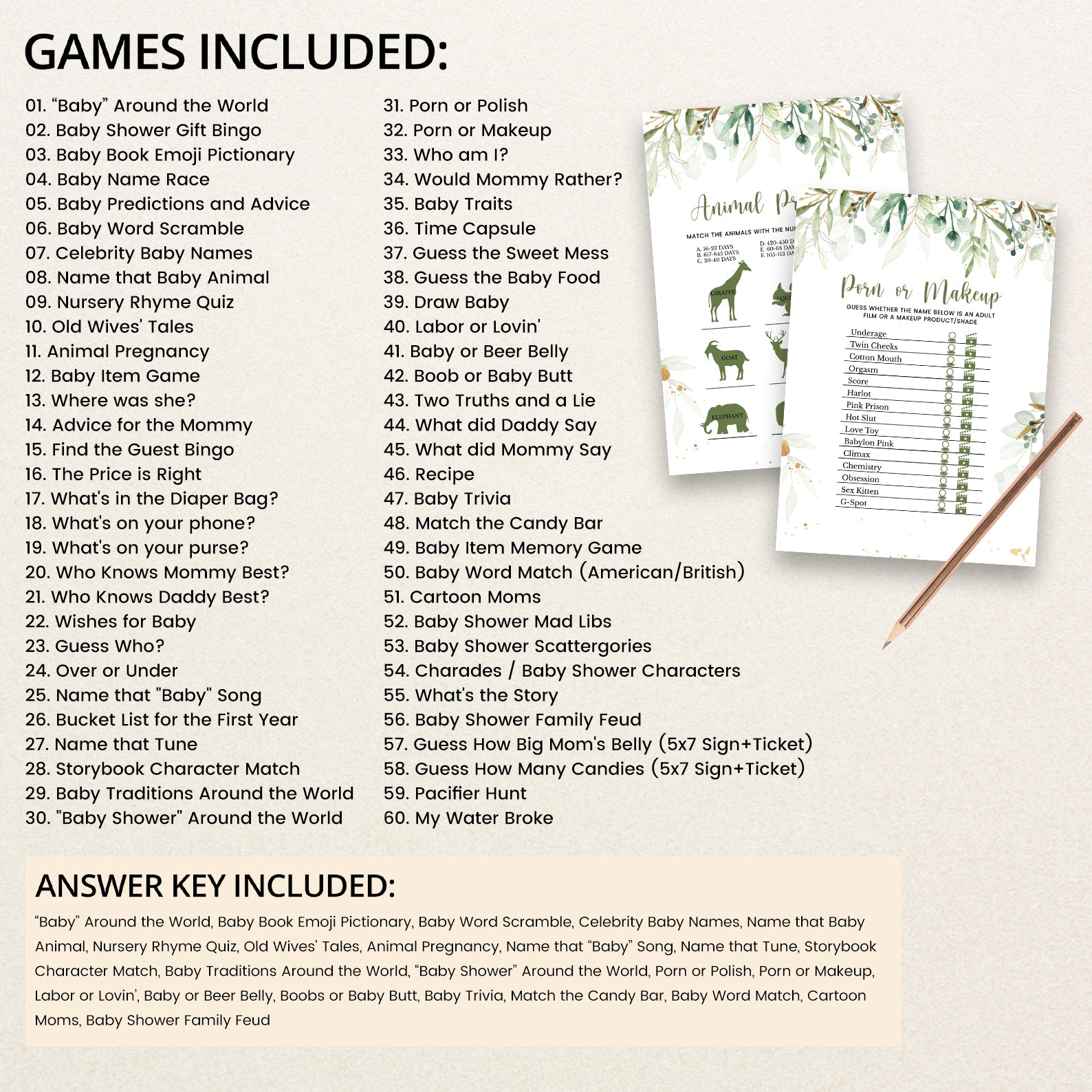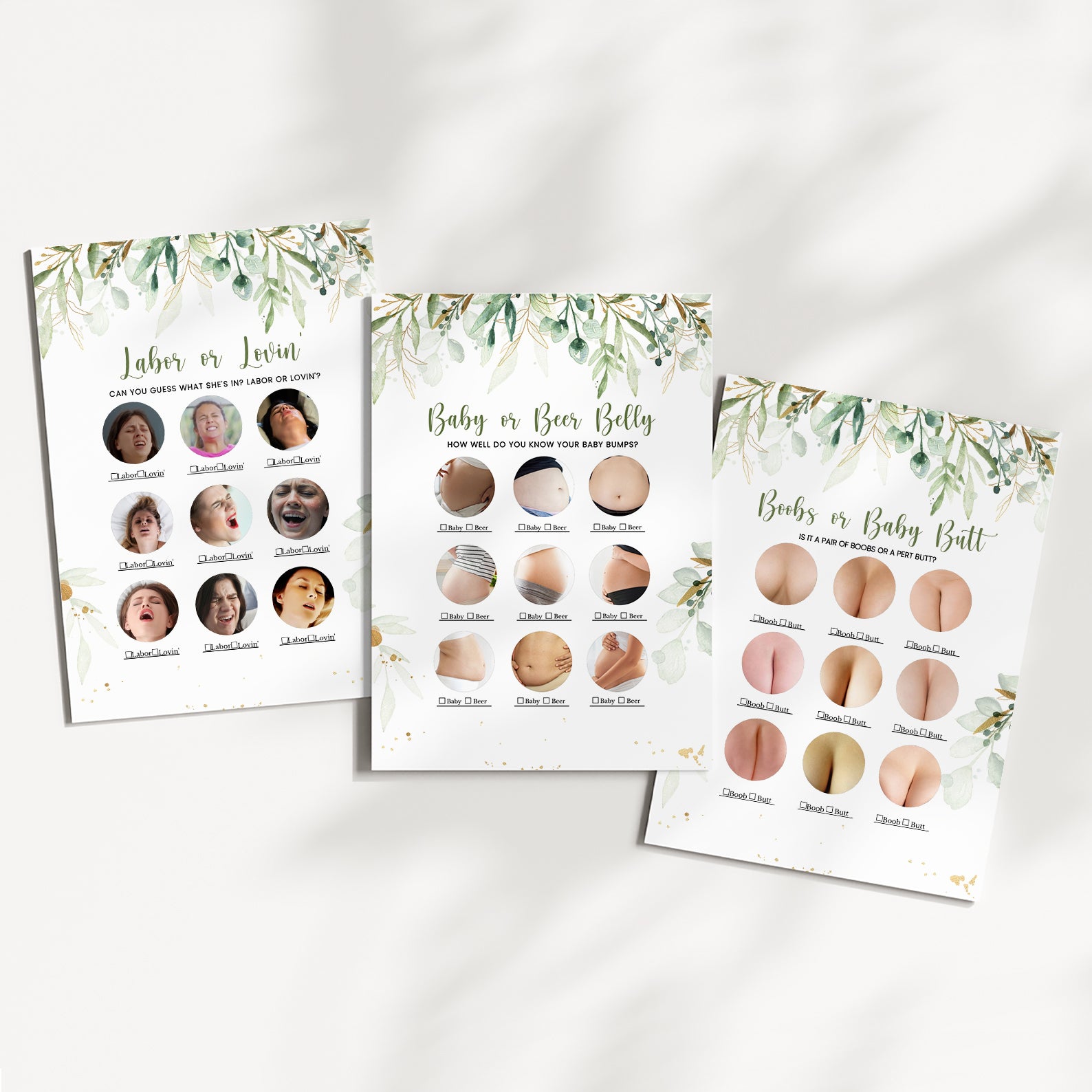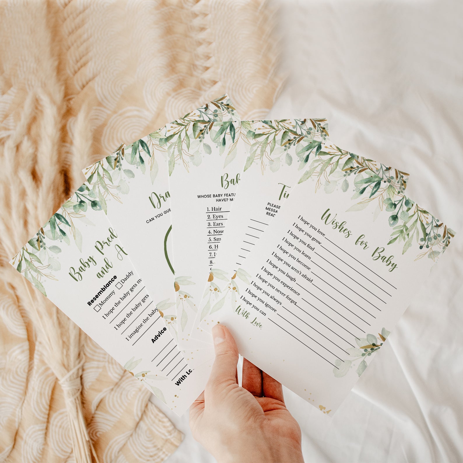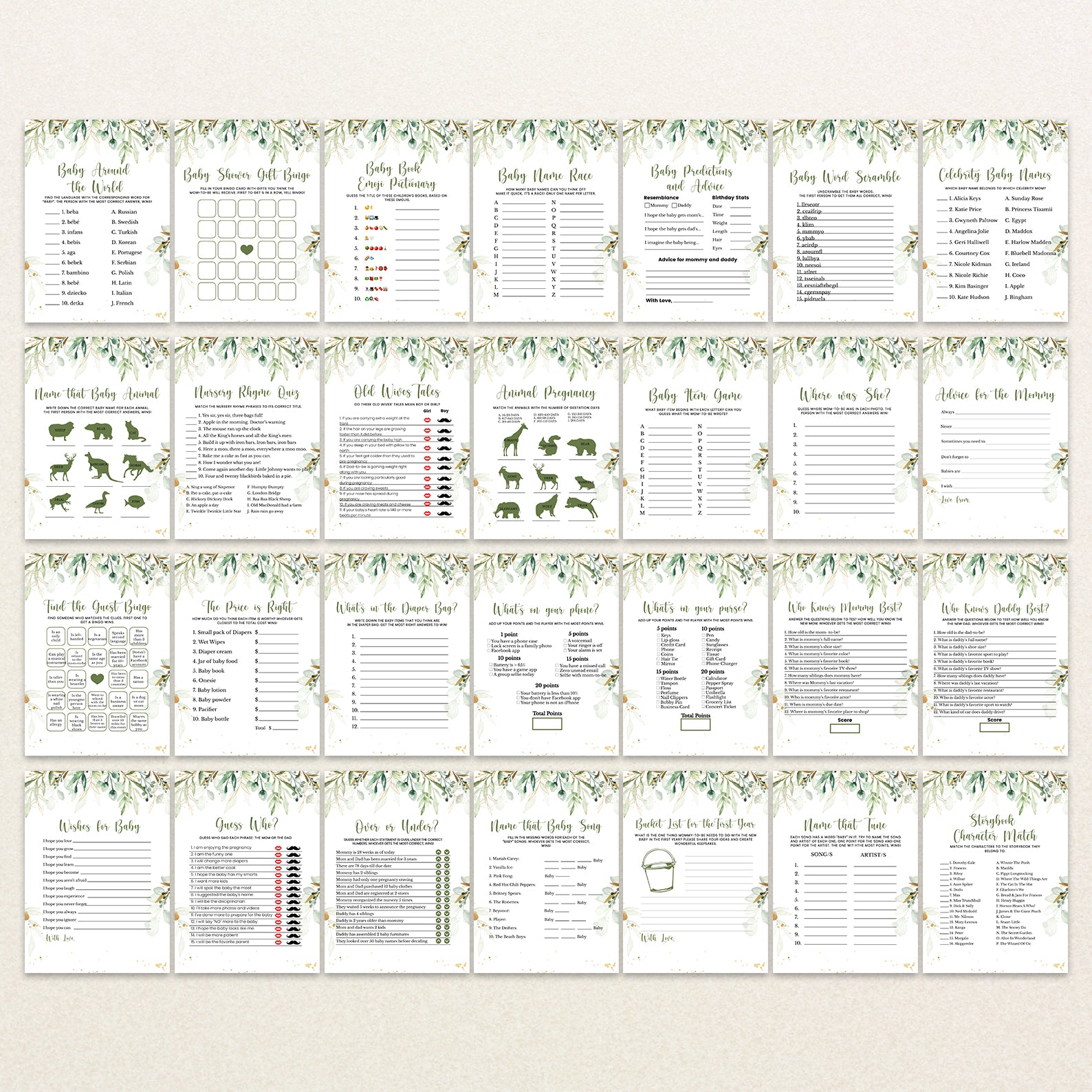 Keep your guests entertained with our green and gold baby shower game bundle! Featuring a chic leafy design with golden accents, this set includes 60 editable baby shower games for endless fun. From classics like Baby Bingo to unique favorites, there’s something for everyone to enjoy. Simple to customize and print, this bundle adds interactive excitement to your party while keeping the theme beautifully consistent.